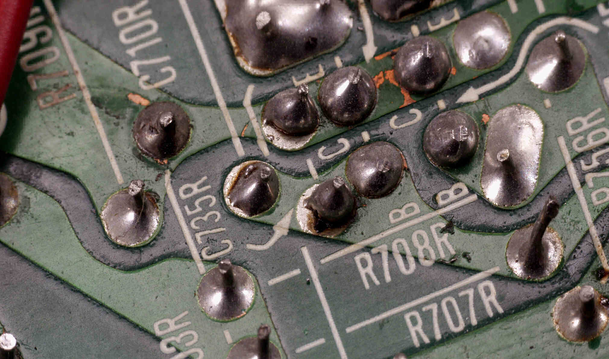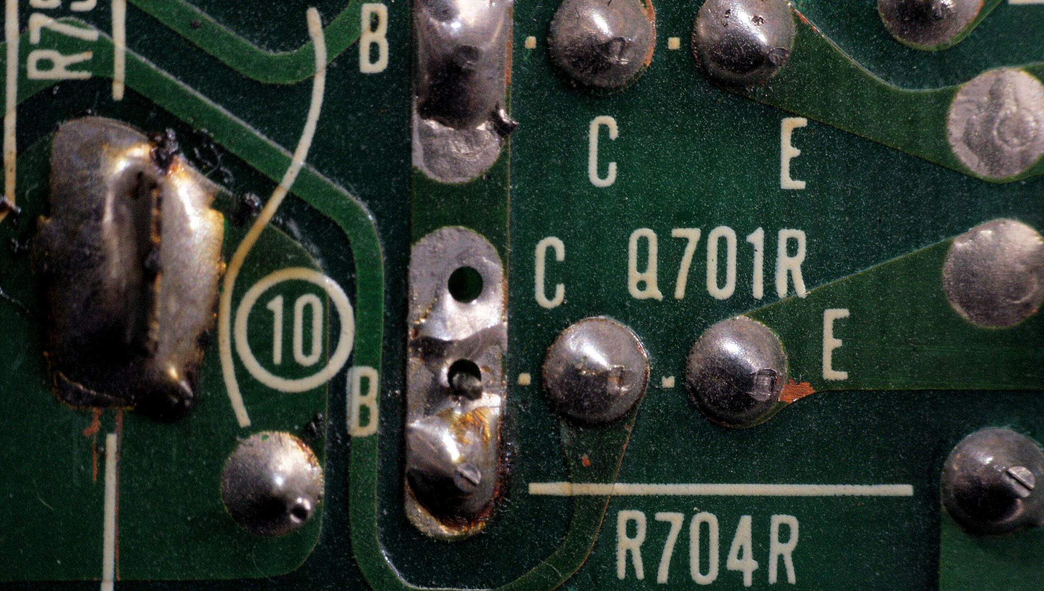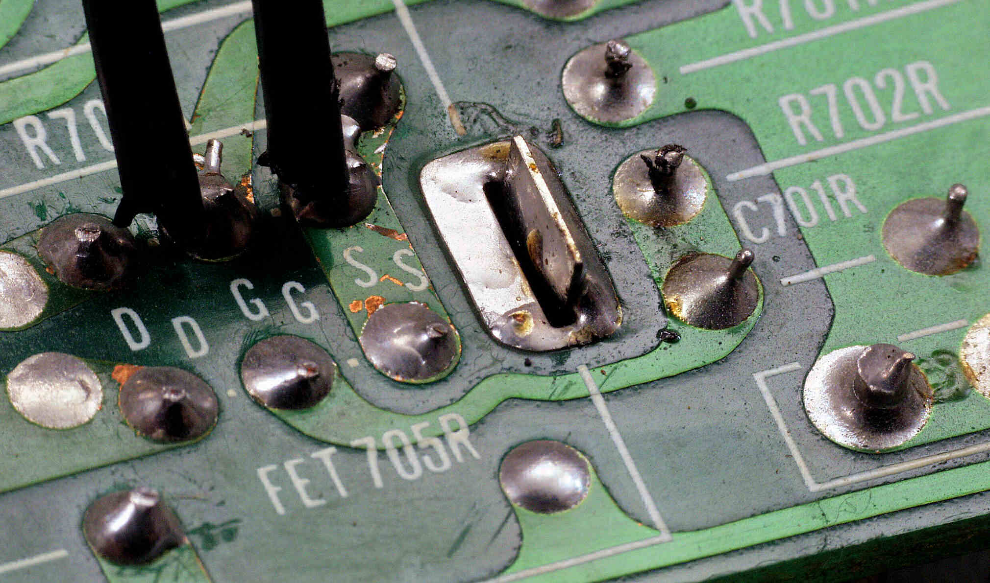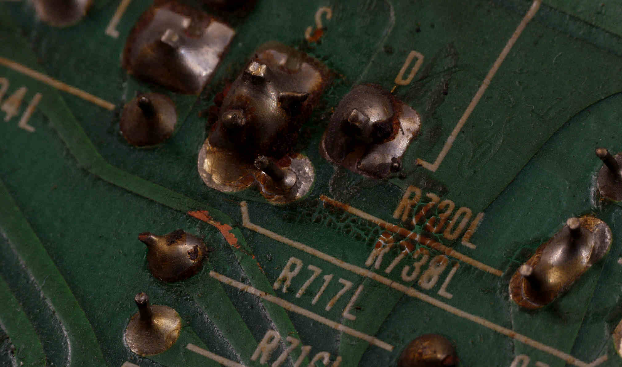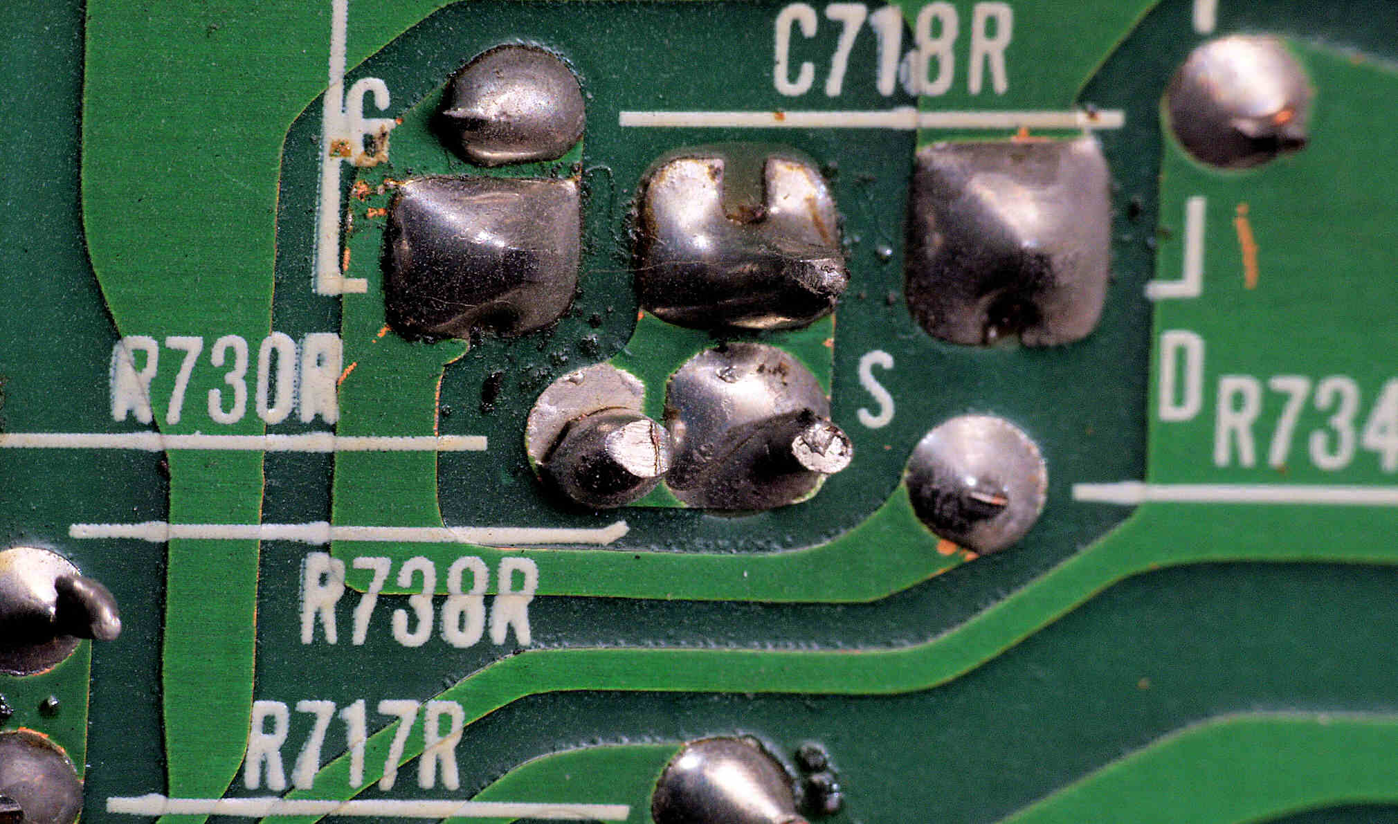 C133. 修理中 R側ドライブ基板裏、半田不良ケ所3、半田球が残っている。