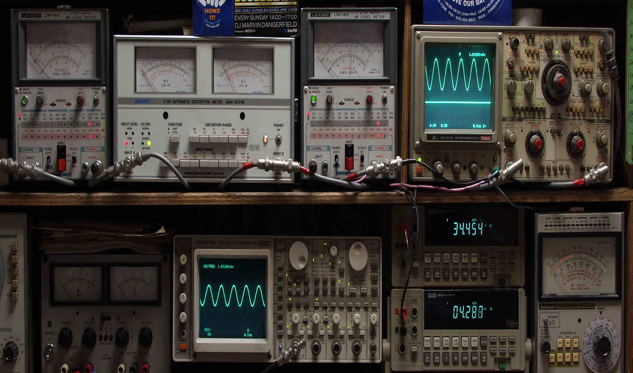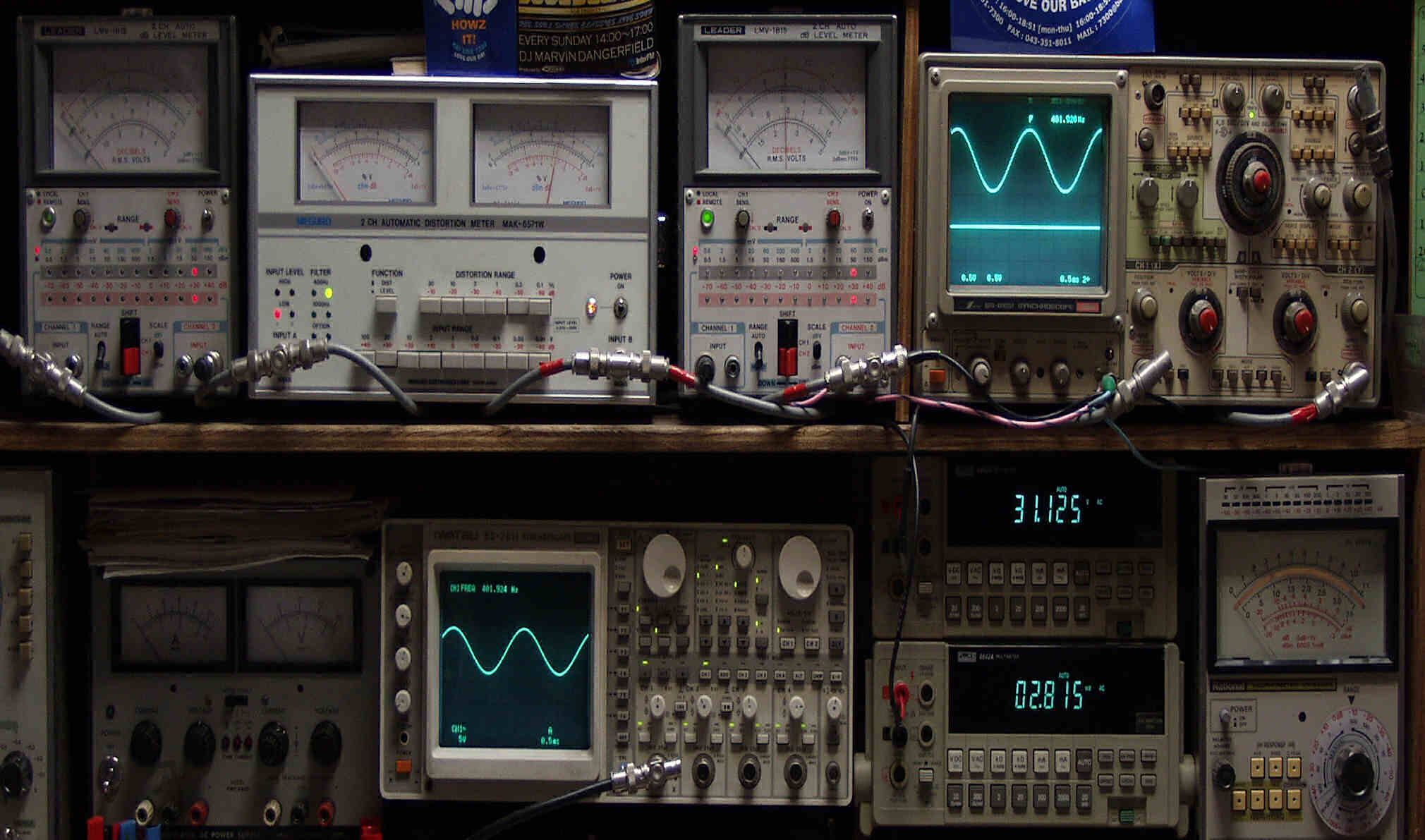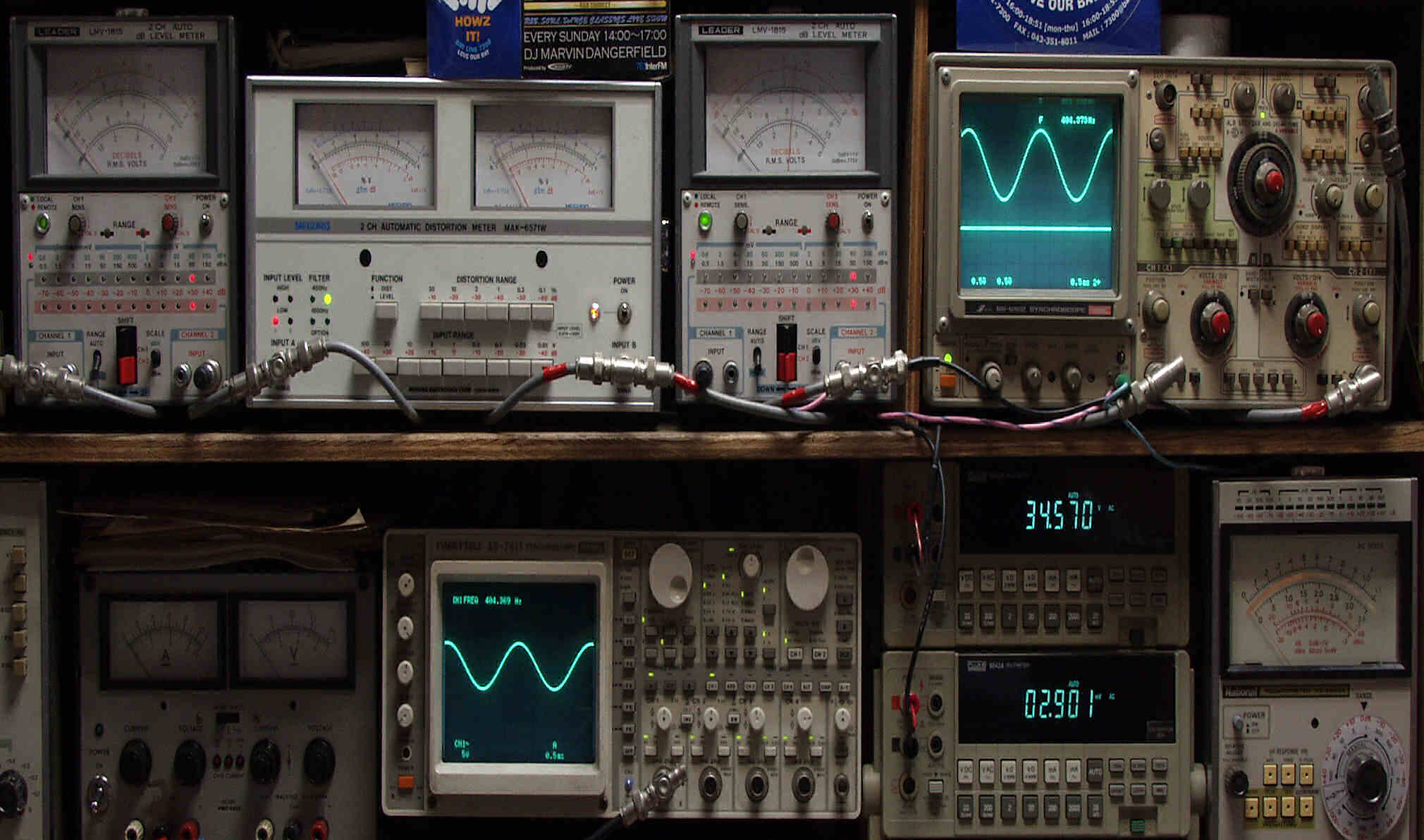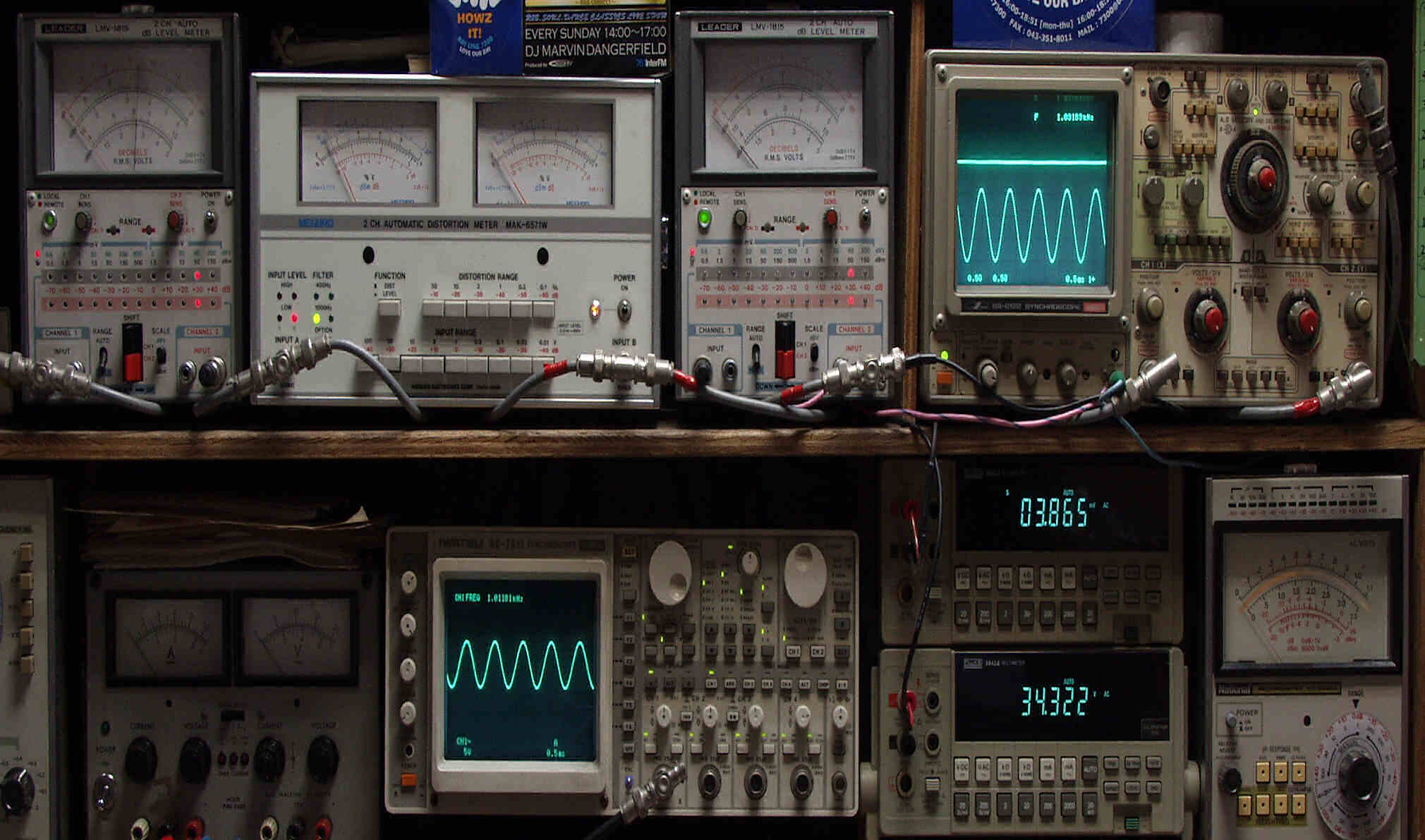 上段中左 歪み率計=出力の歪み率測定 左メータ=L出力、右メータ=R出力