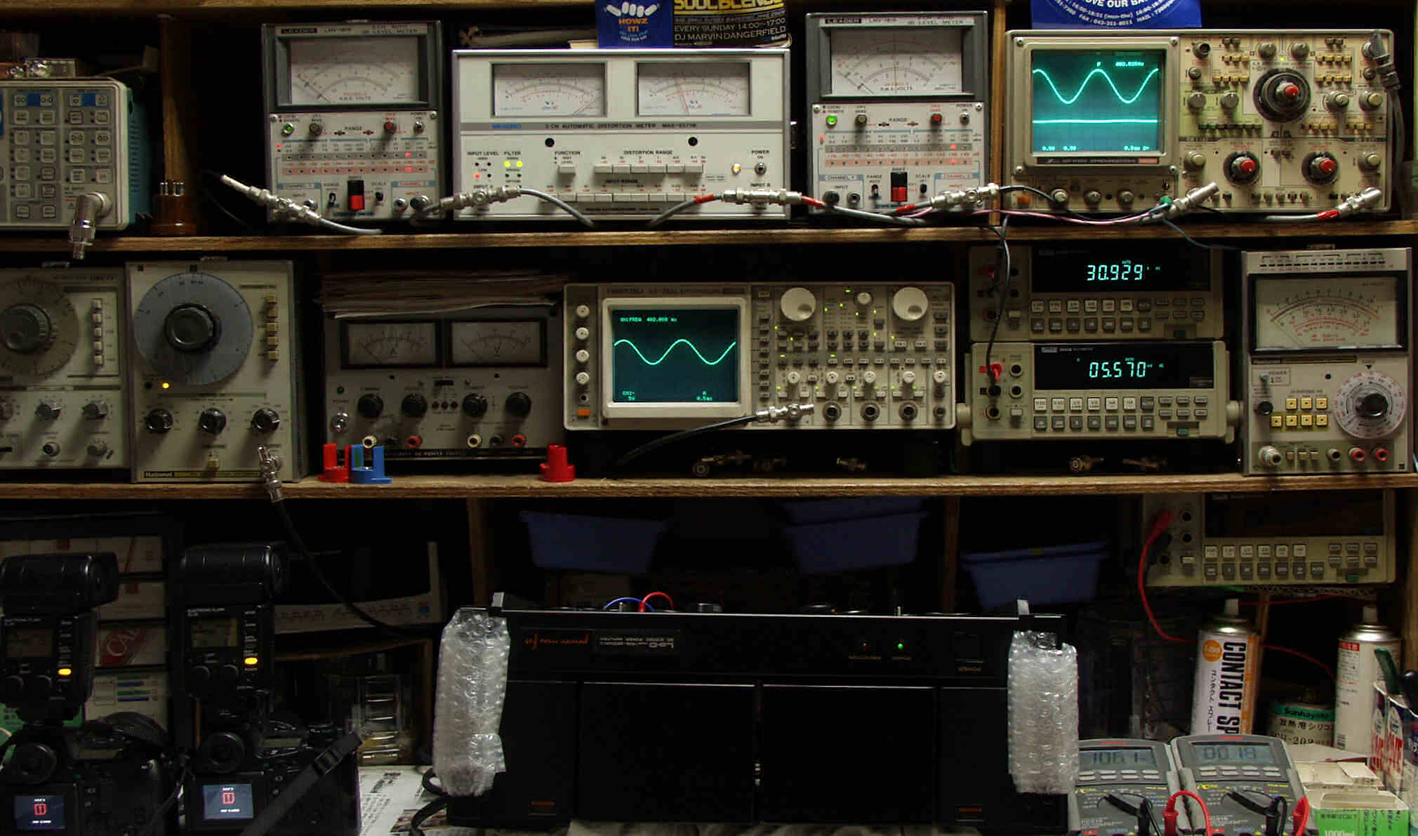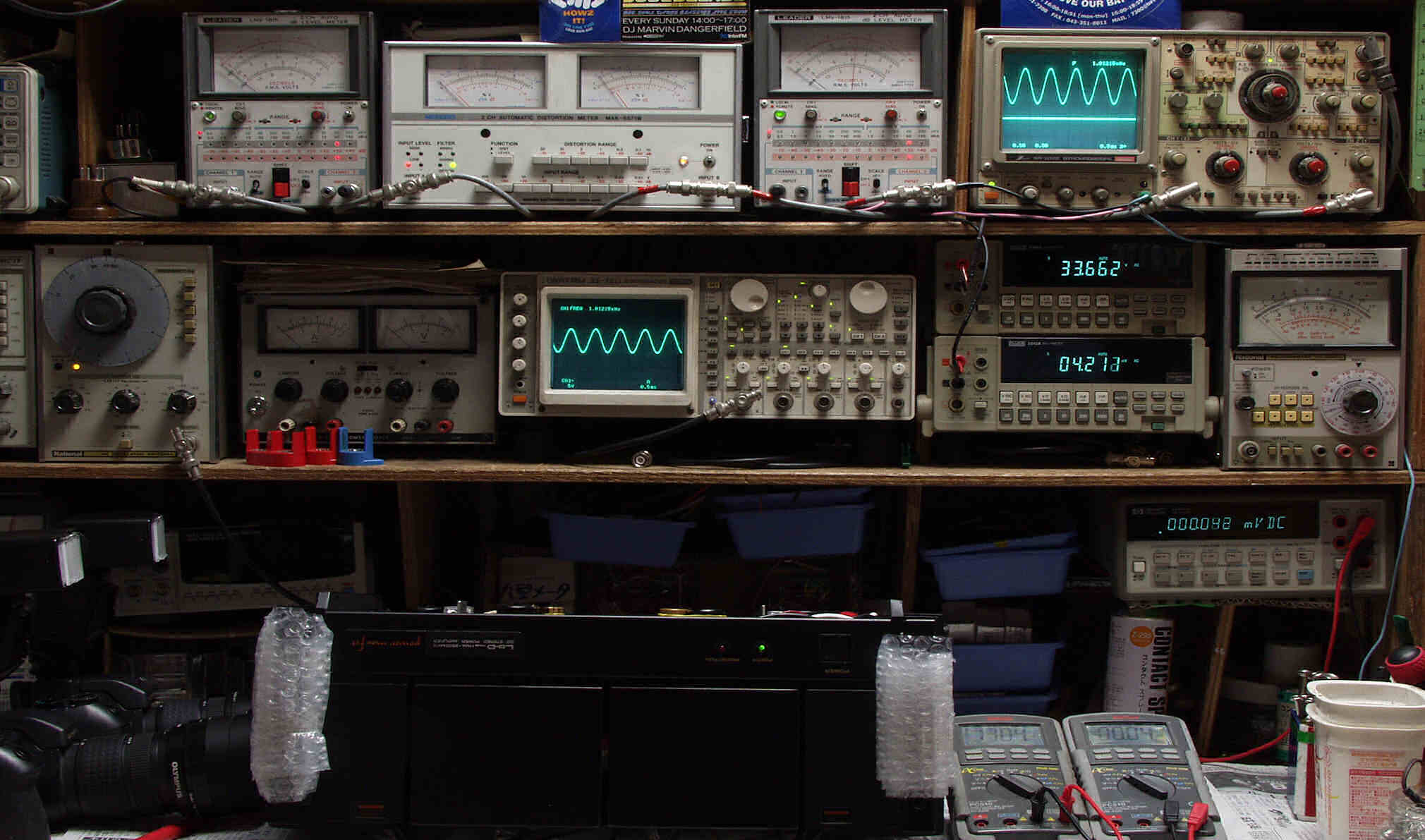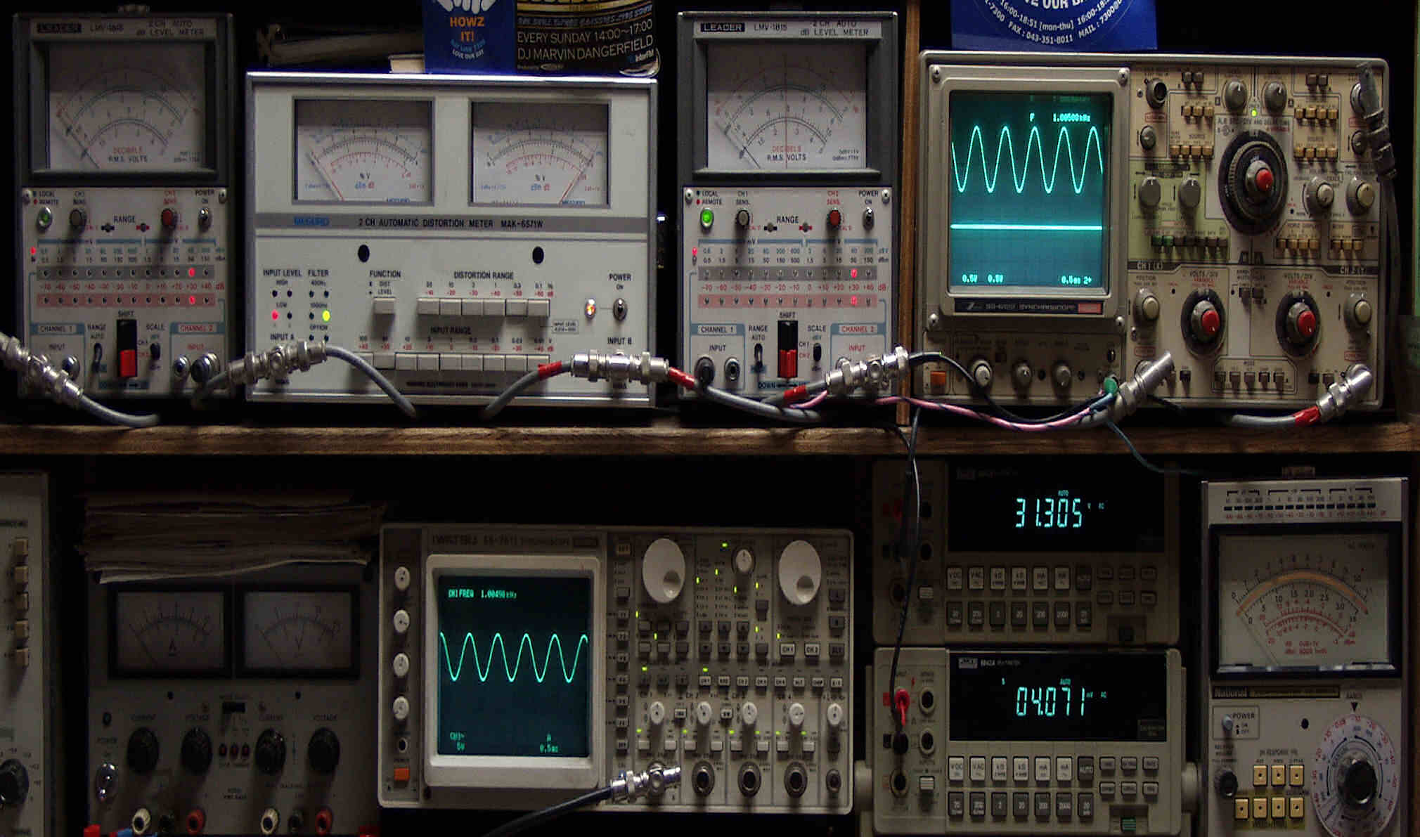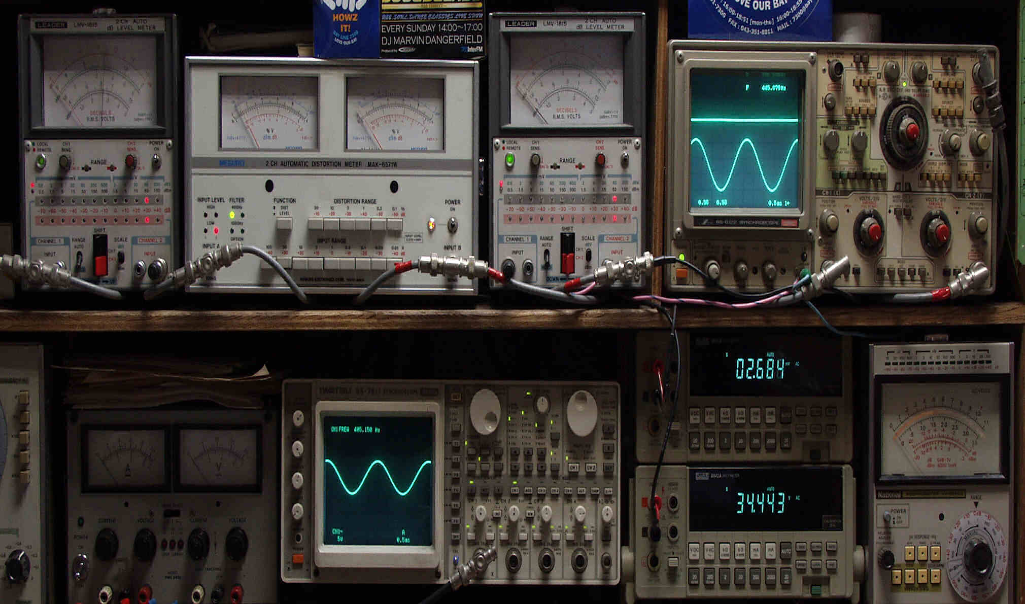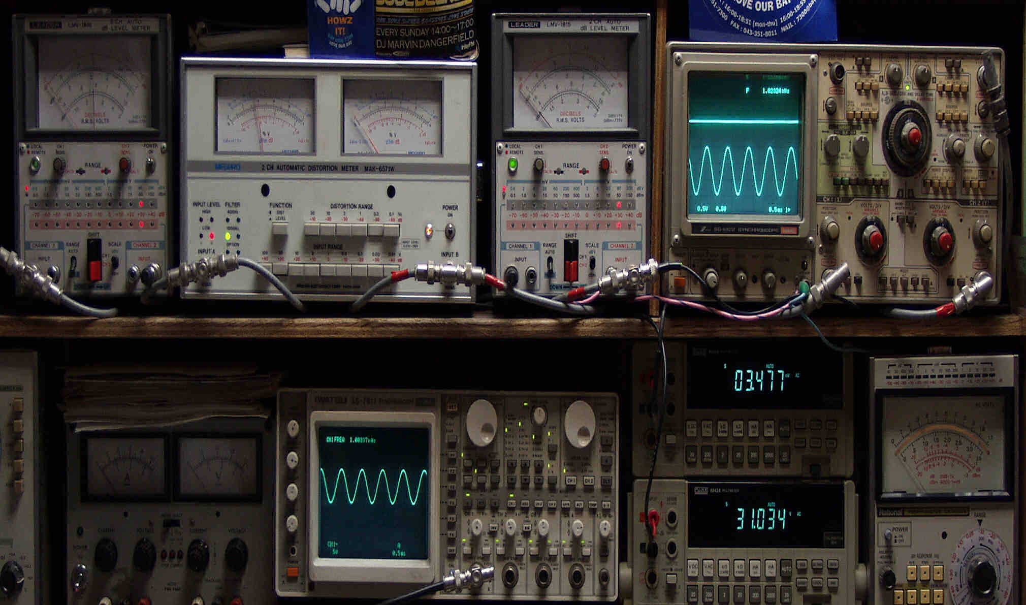 上段中左 歪み率計=出力の歪み率測定 左メータ=L出力、右メータ=R出力
