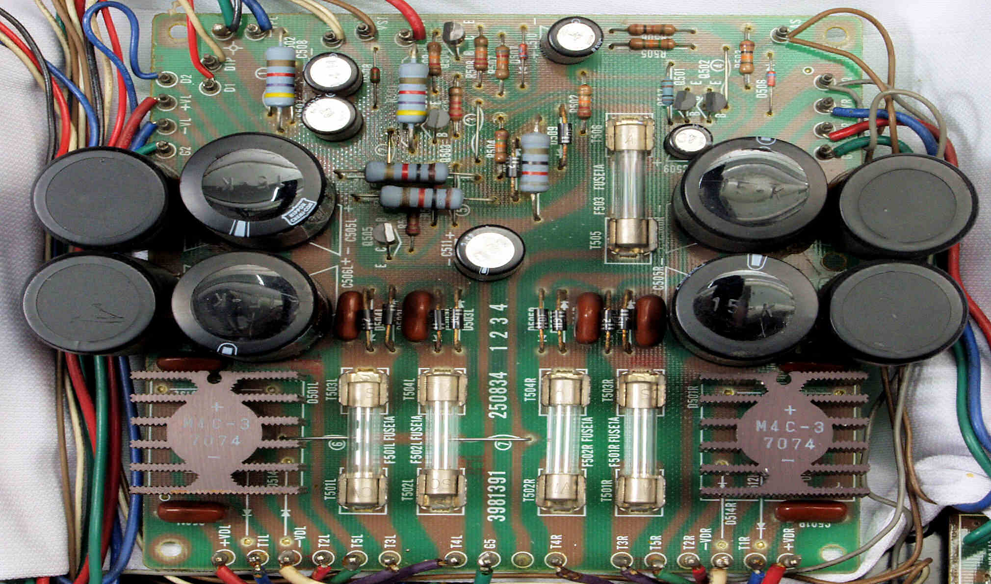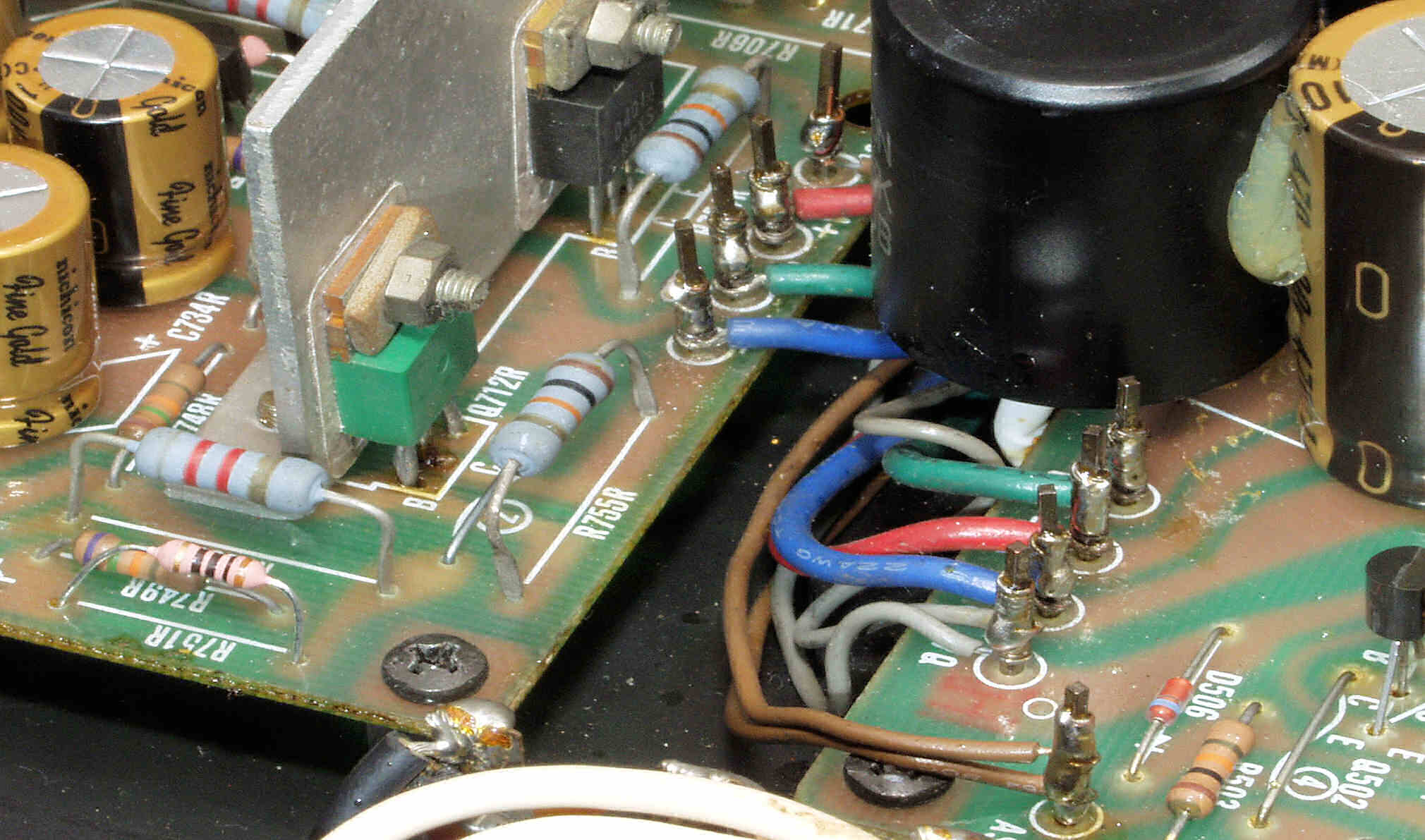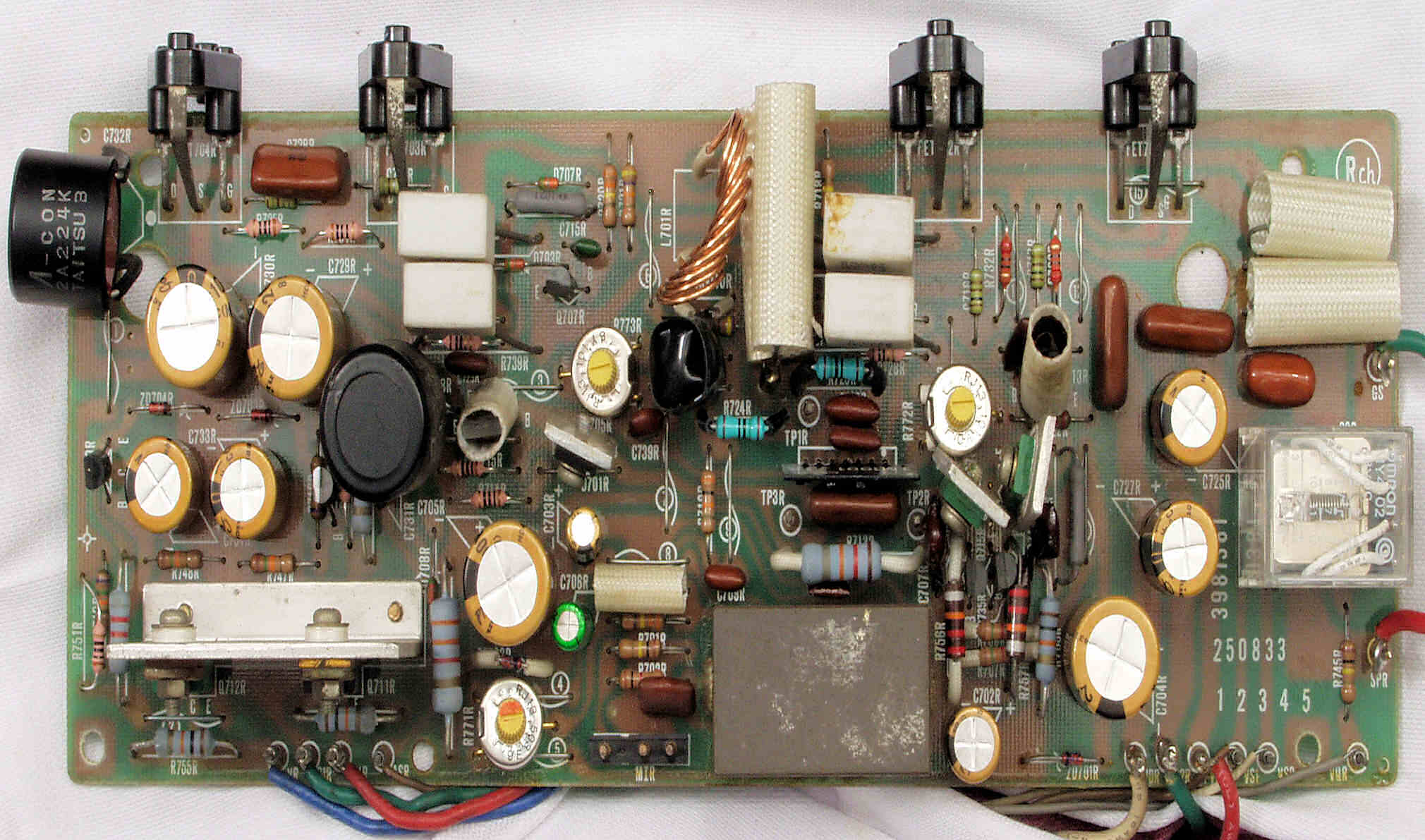 | C12. 修理後 R側ドライブ基板 初段FET(電界効果トランジスター)、バランス・バイアス調整用半固定VR3個、SP接続リレー交換 フューズ入り抵抗全部、電解コンデンサー11個交換 |