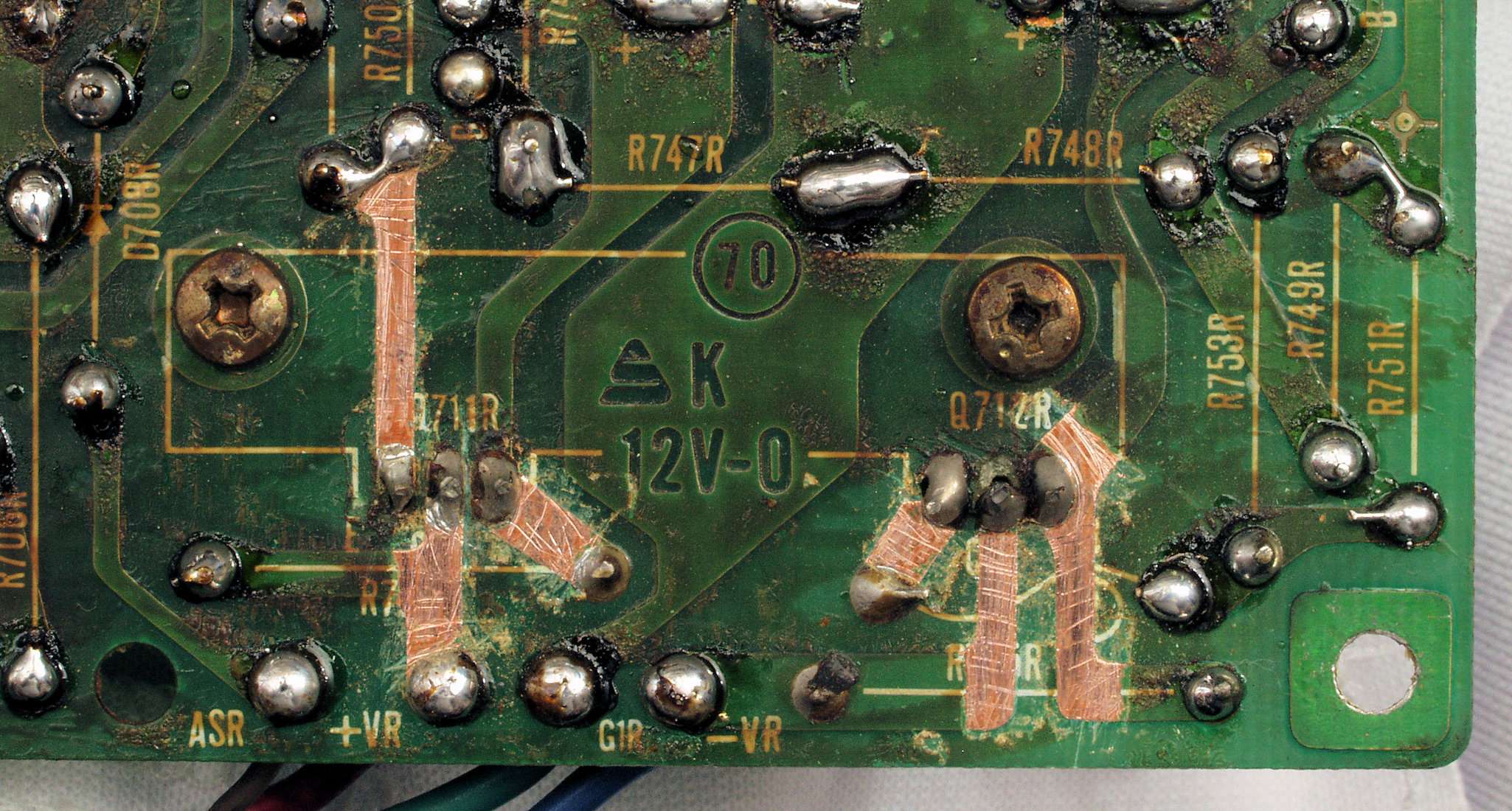 | C232. 修理中 R側ドライブ基板裏、 銅箔を広げる。 |