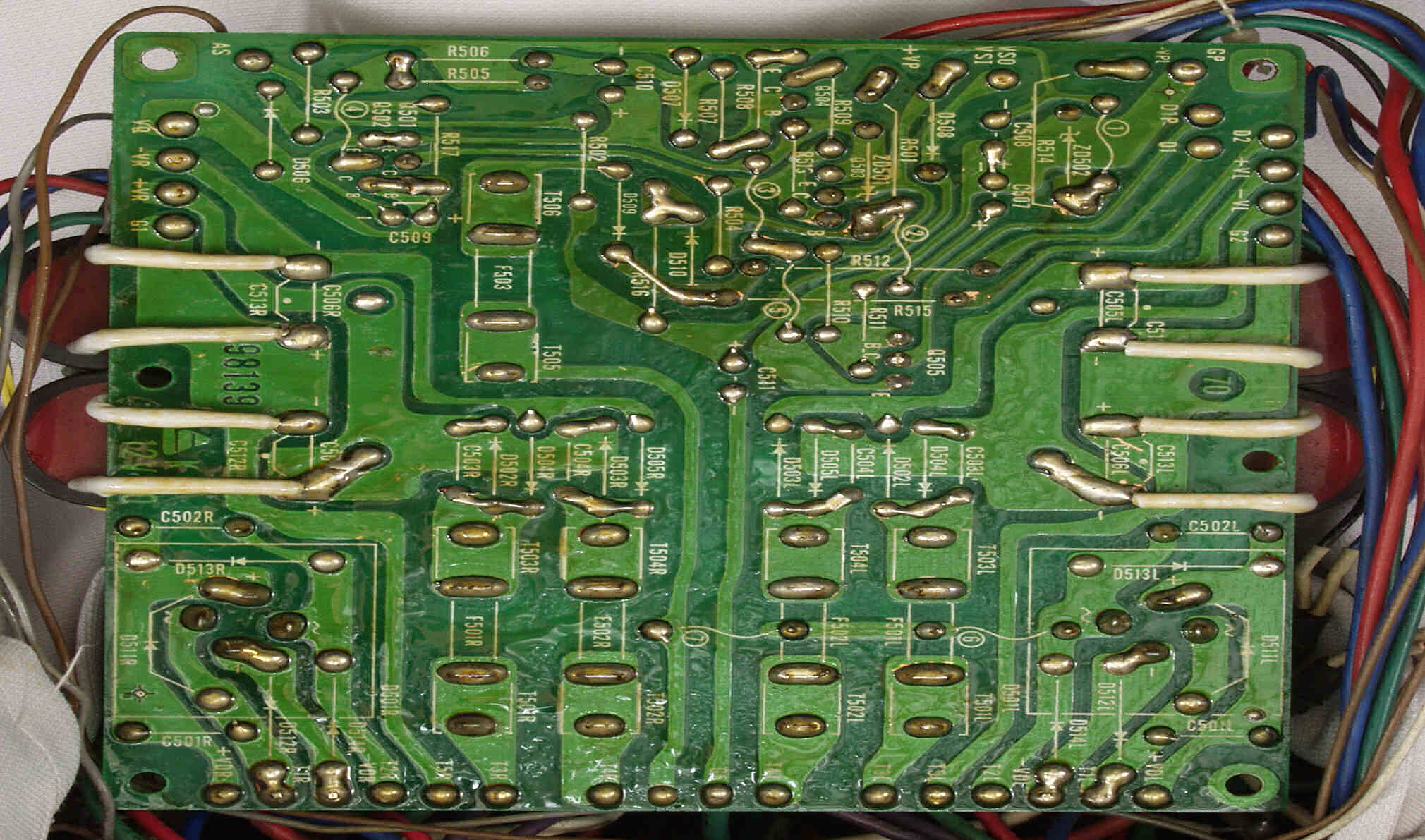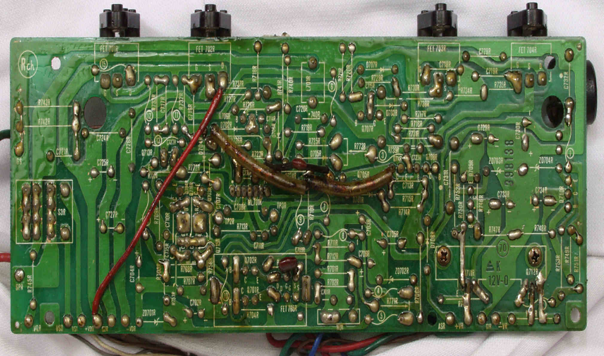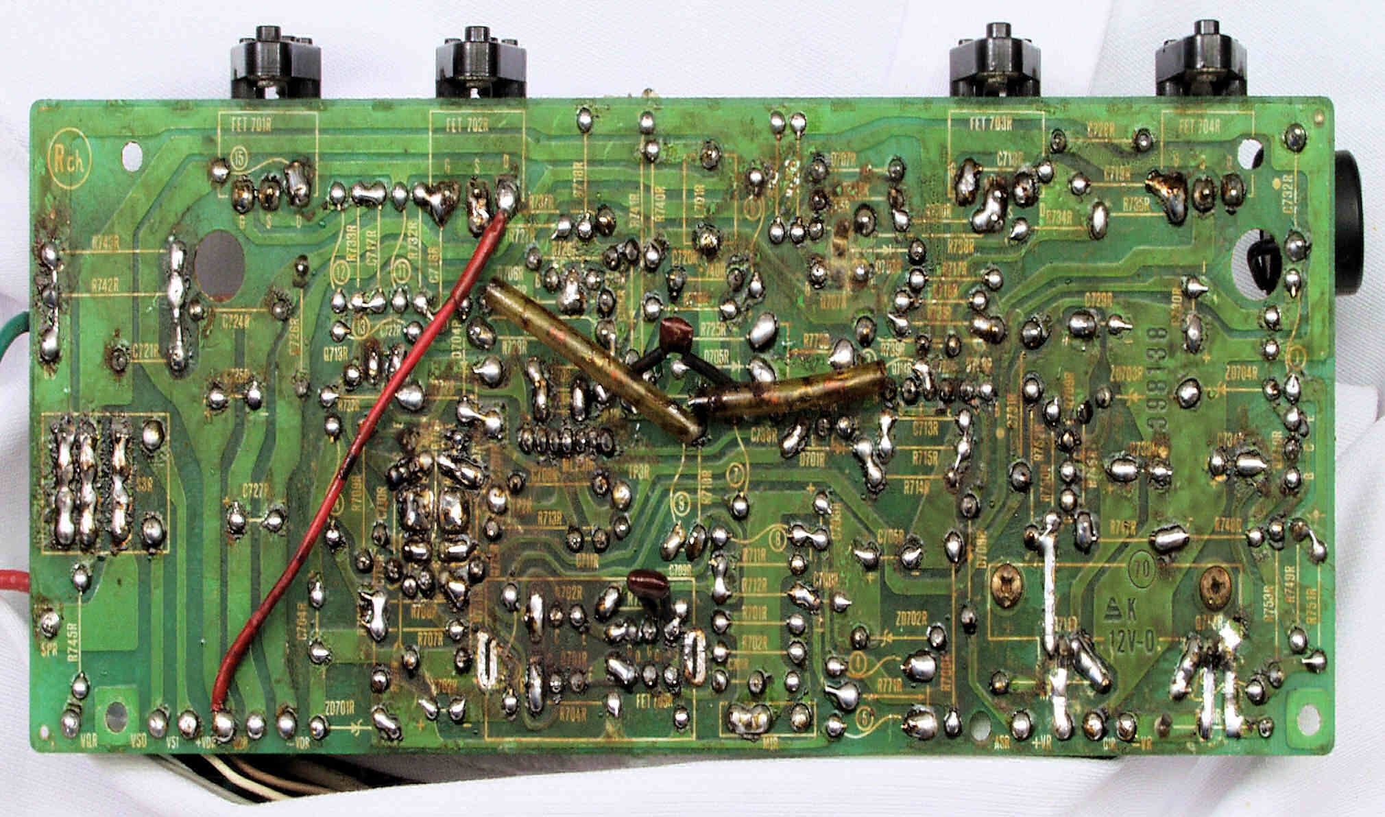 | C14. 修理(半田補正)後 R側ドライブ基板裏 半田を全部やり直す。 普通はこれで完成。 |