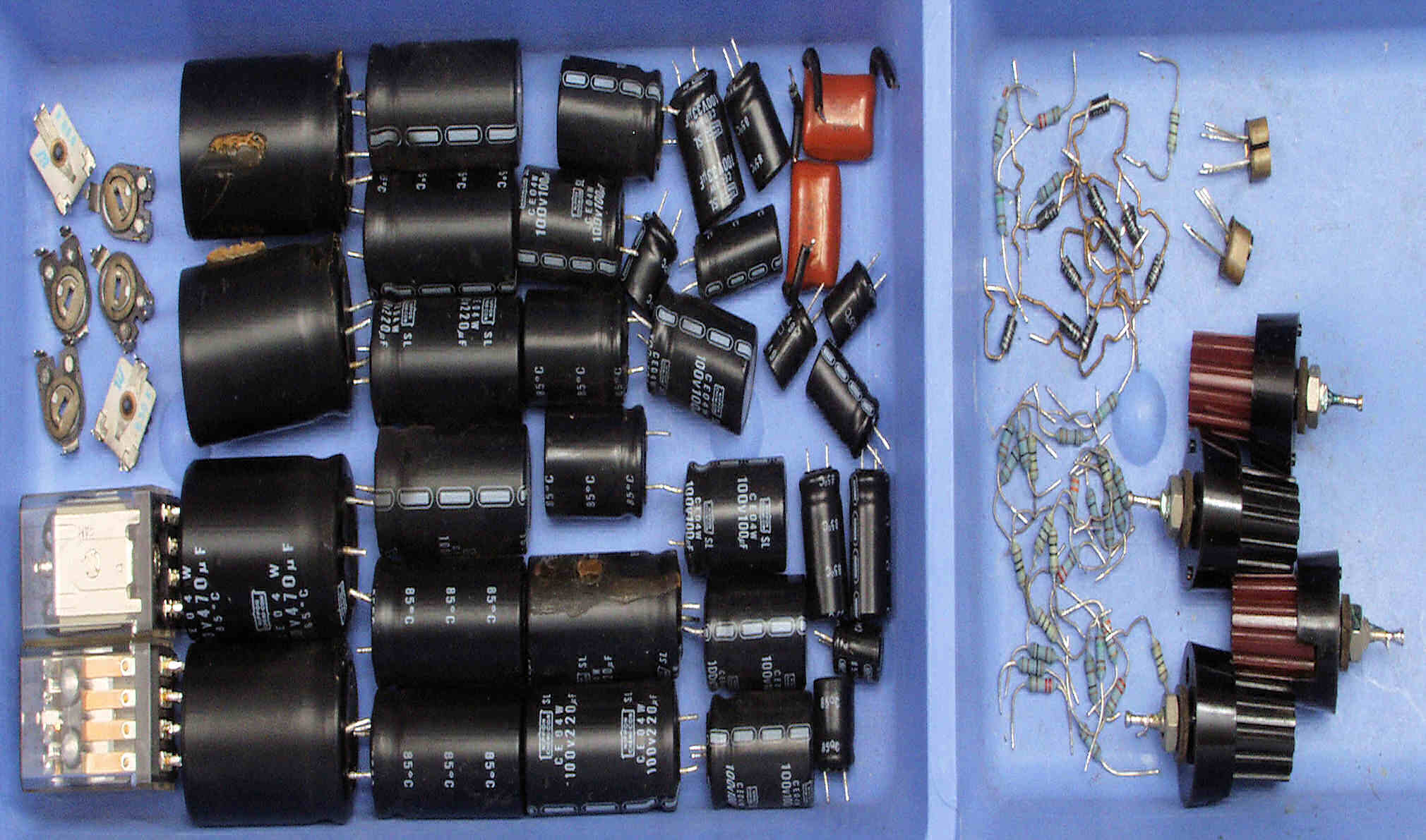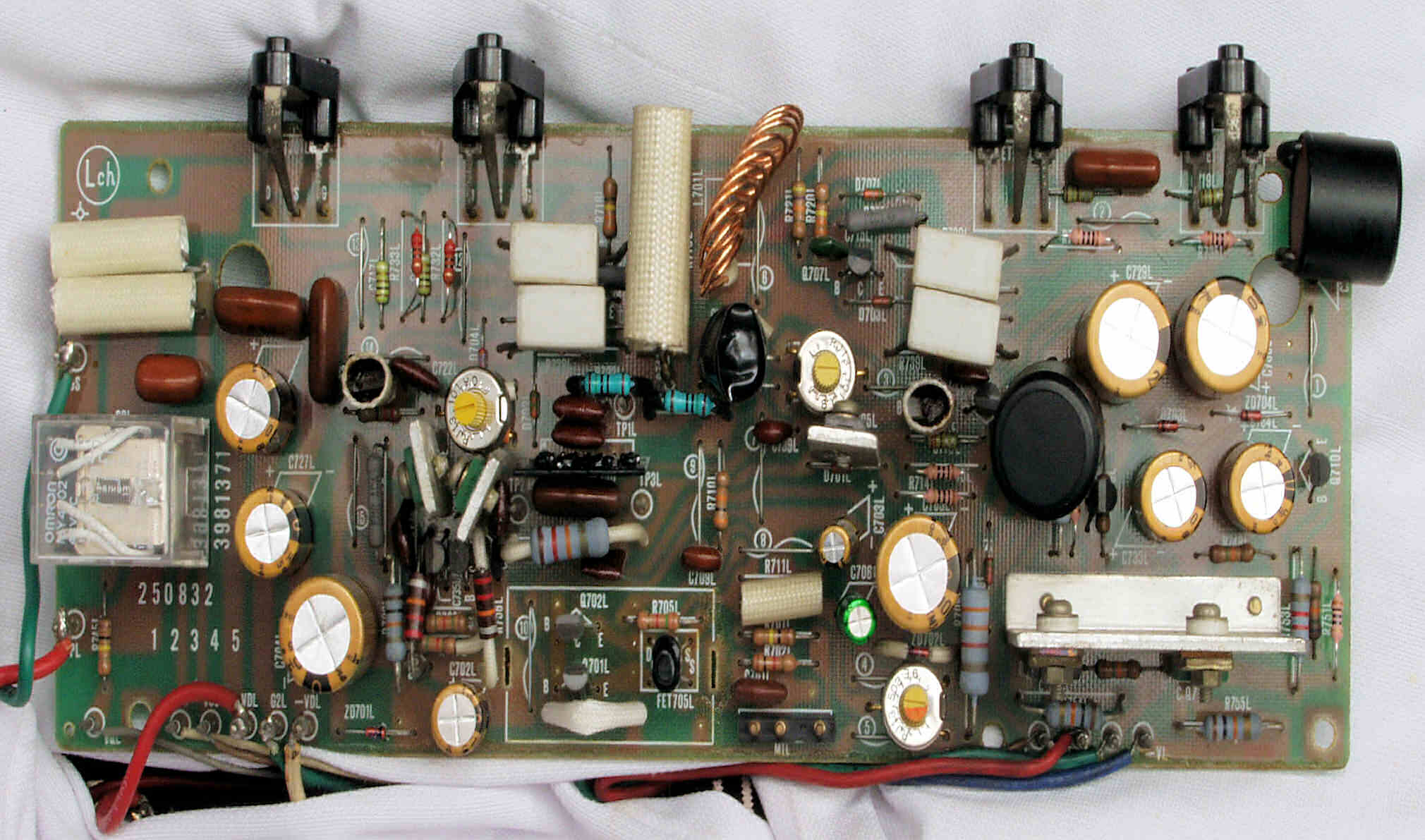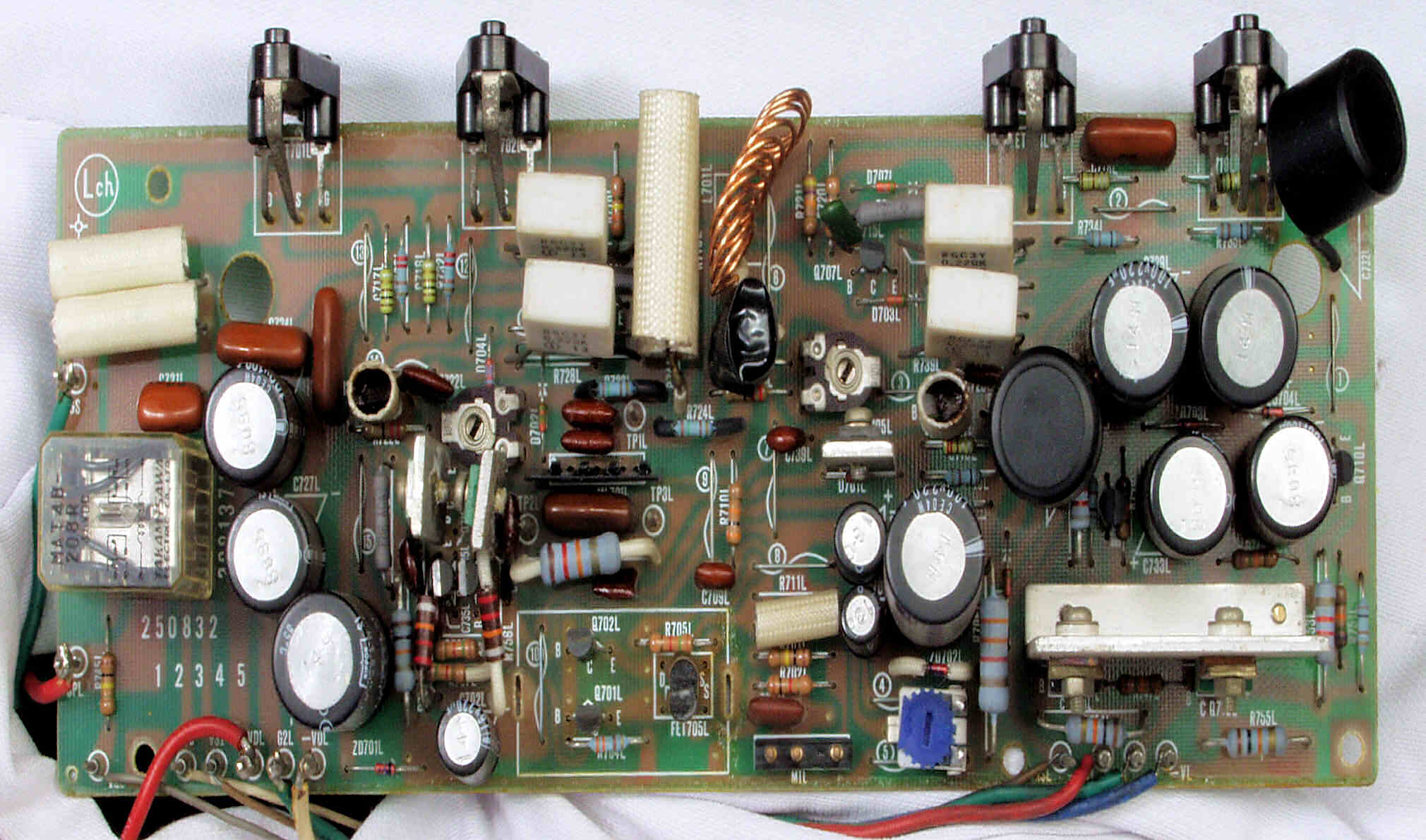 | C22. 修理後 L側ドライブ基板 初段FET(電界効果トランジスター)、バランス/バイアス調整用半固定VR3個、SP接続リレー交換 フューズ入り抵抗全部、電解コンデンサー11個交換 |