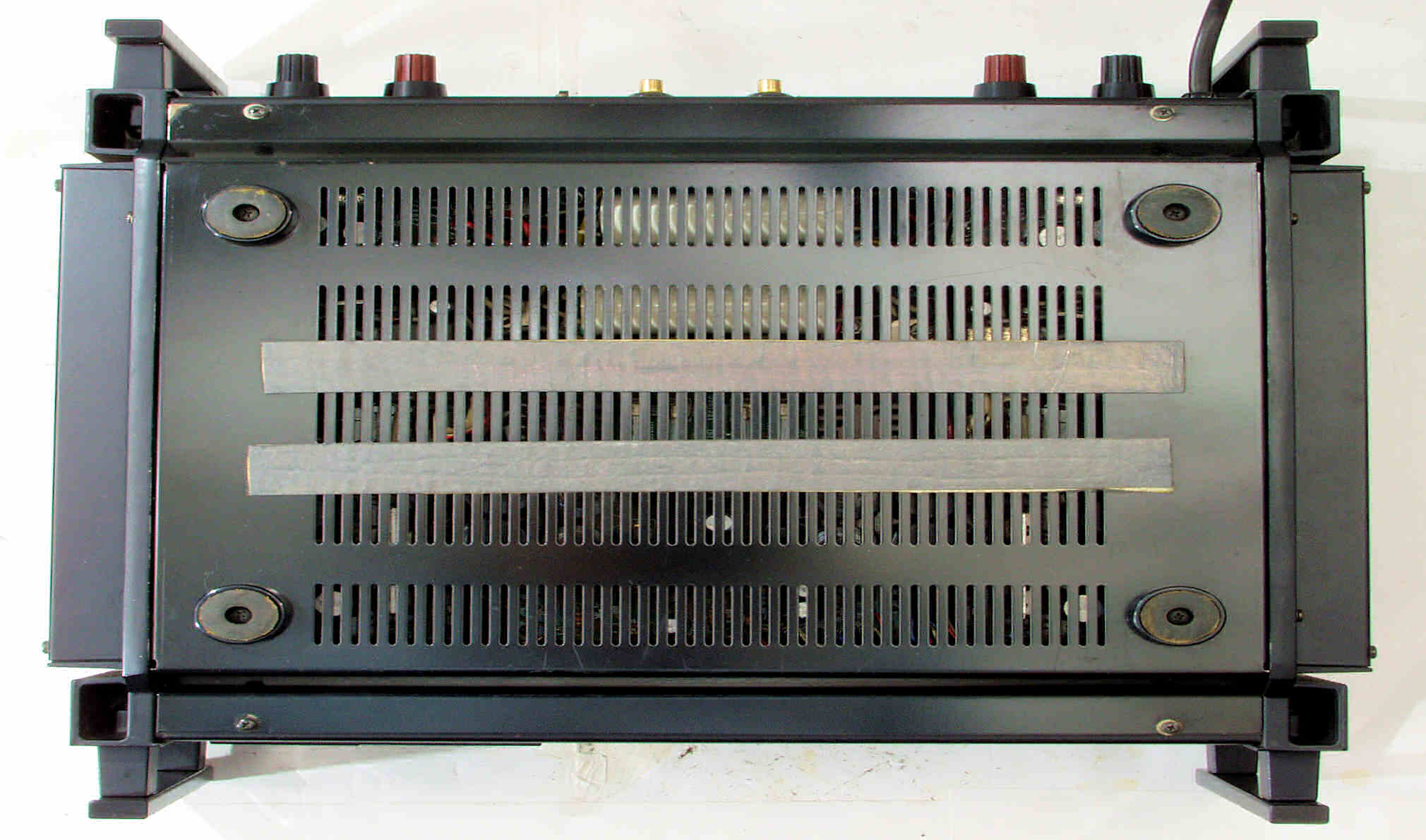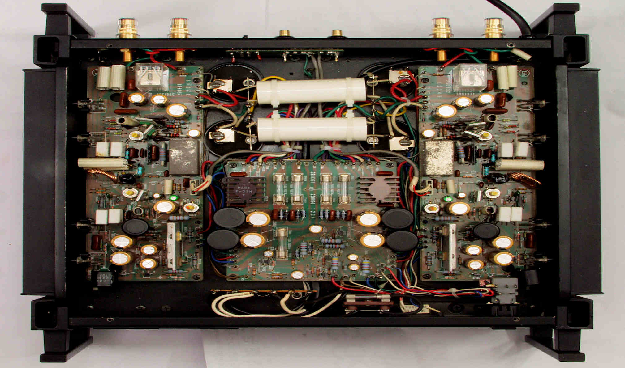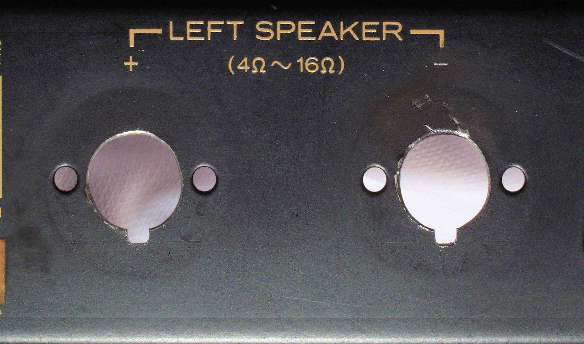 | 注意 このAMPはアースラインが浮いています。 AMPのシャーシにSPの線(アース側)やプリAMPのアースもも接続してはいけません。 RL−SPのアース線も接続(共通)してもいけません、+−の撚りのあるのも使用出来ません。 又、DC(directconnection)入力が可能ですが、絶対に使用しないこと=ここ参照 |