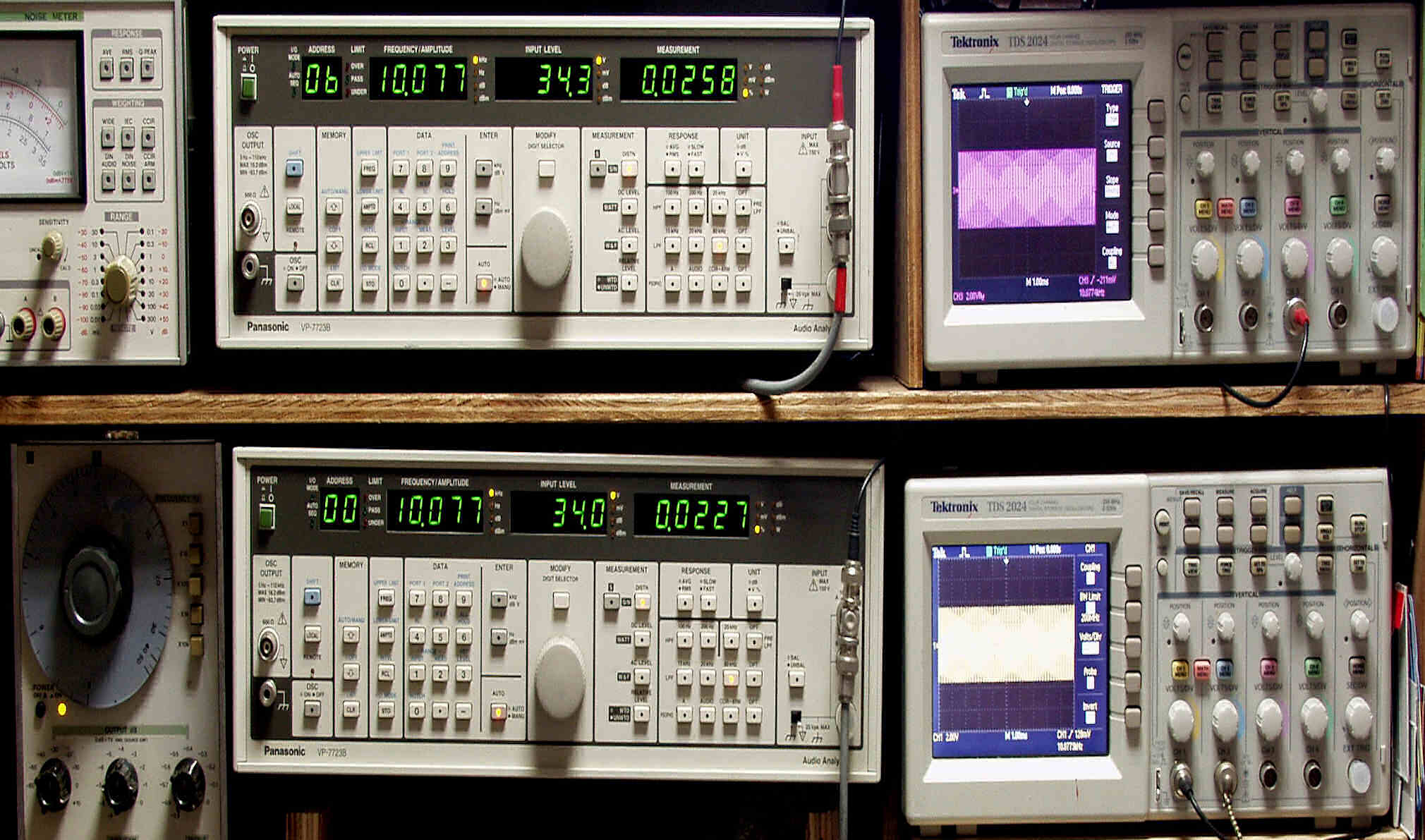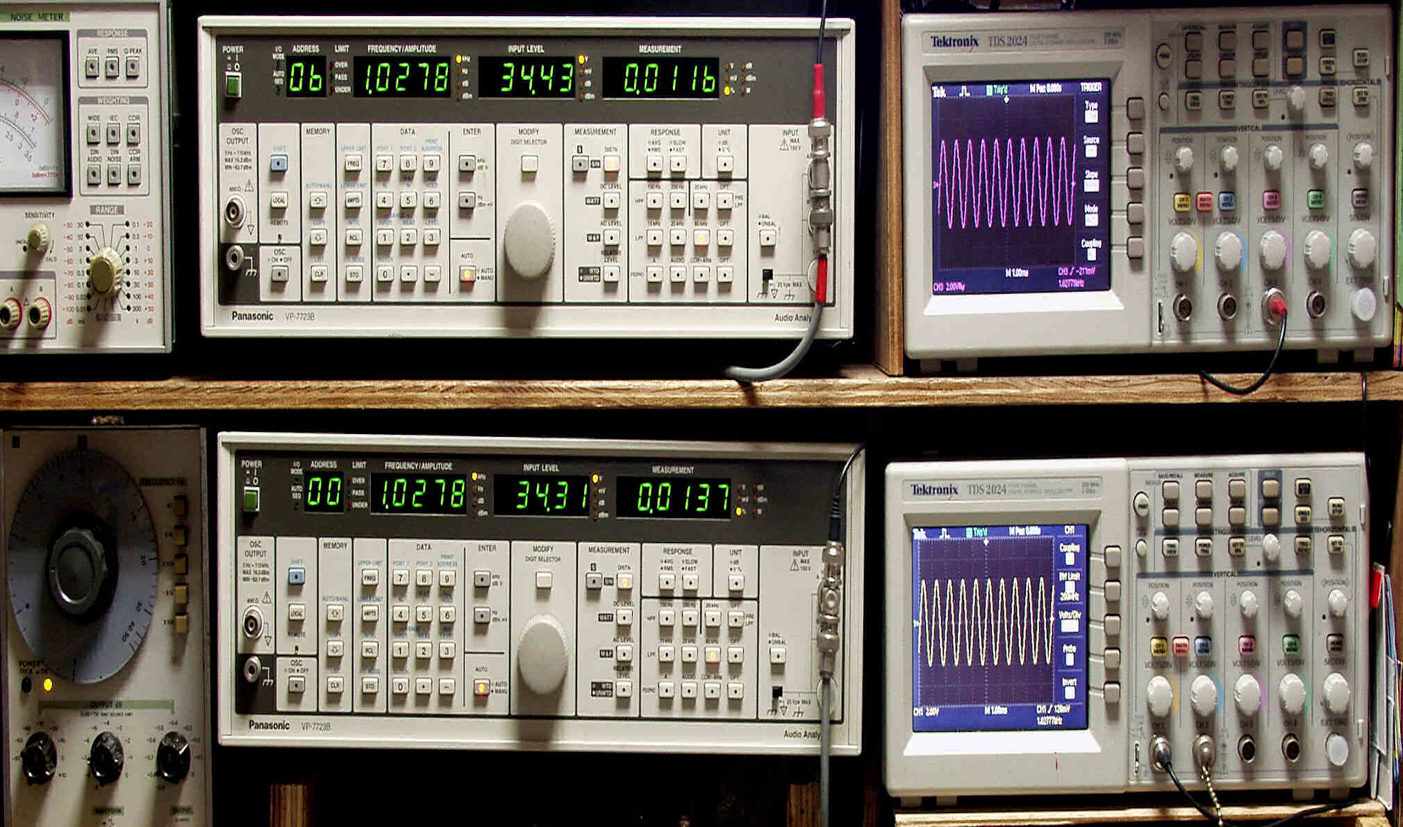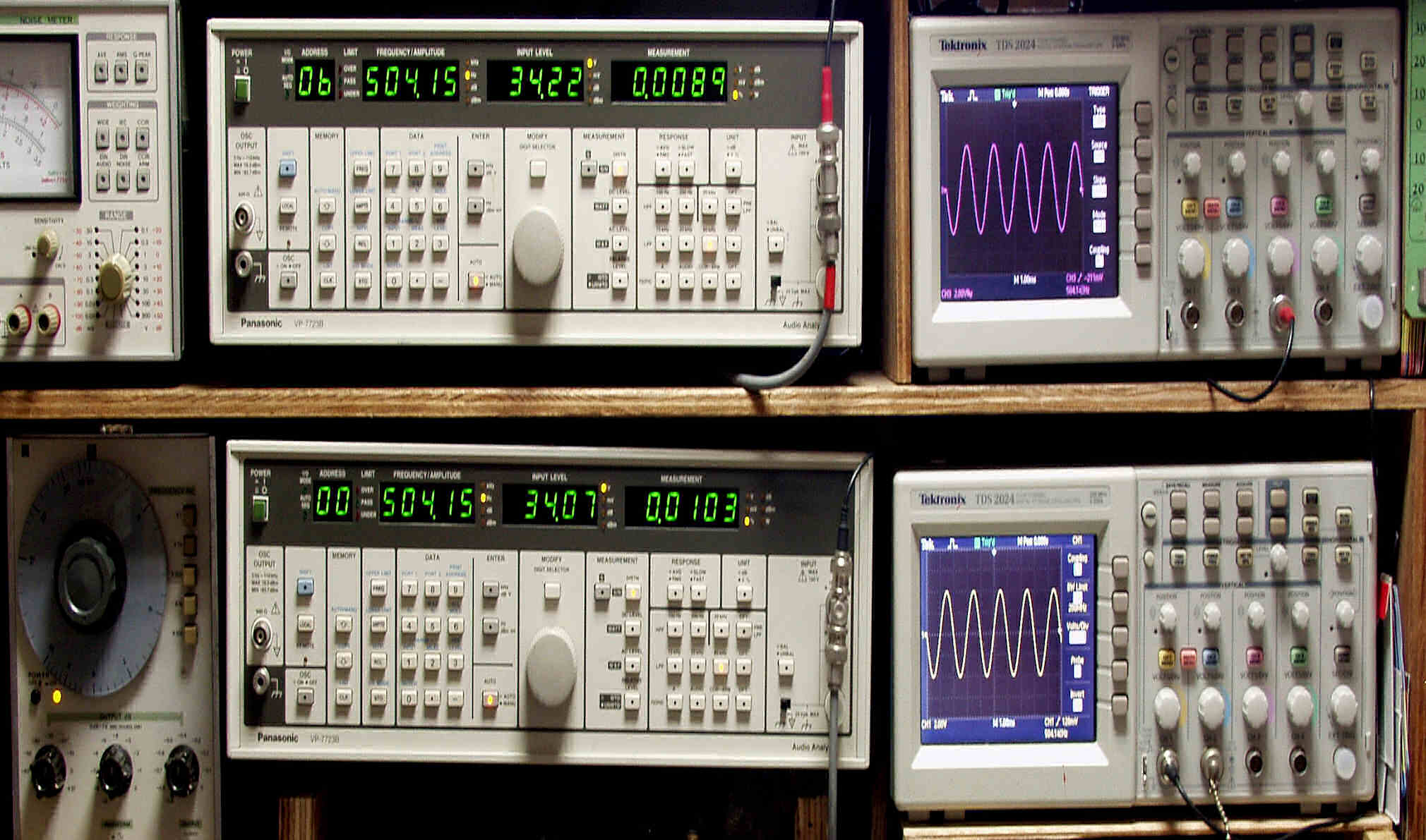 | E. 調整・測定 E1. 出力・歪み率測定。 「見方」。 上段中央オーディオアナライザ VP−7723B=R側測定。LED表示は右から、「歪み率」、「SP出力電圧」、「周波数」。 下段中央オーディオアナライザ VP−7723B=L側測定。LED表示は右から、「歪み率」、「SP出力電圧」、「周波数」。 上段右端オシロ TDS−2024=R側出力波形表示。(交流電圧が5V以上の場合1/10のATTが入ります)。 下段右端オシロ TDS−2024=L側出力波形表示。(交流電圧が5V以上の場合1/10のATTが入ります)。 下段左端 オーディオ発振器 VP−7201A より100Hz〜10kHzの信号を出し(歪み率=約0.003%)、ATT+分配器を通し、AMPに入力。 よって、ダイアル設定出力レベルより低くなります。 測定機器の仕様や整備の様子はこちら、「VP−7723B」「VP−7201A」 |