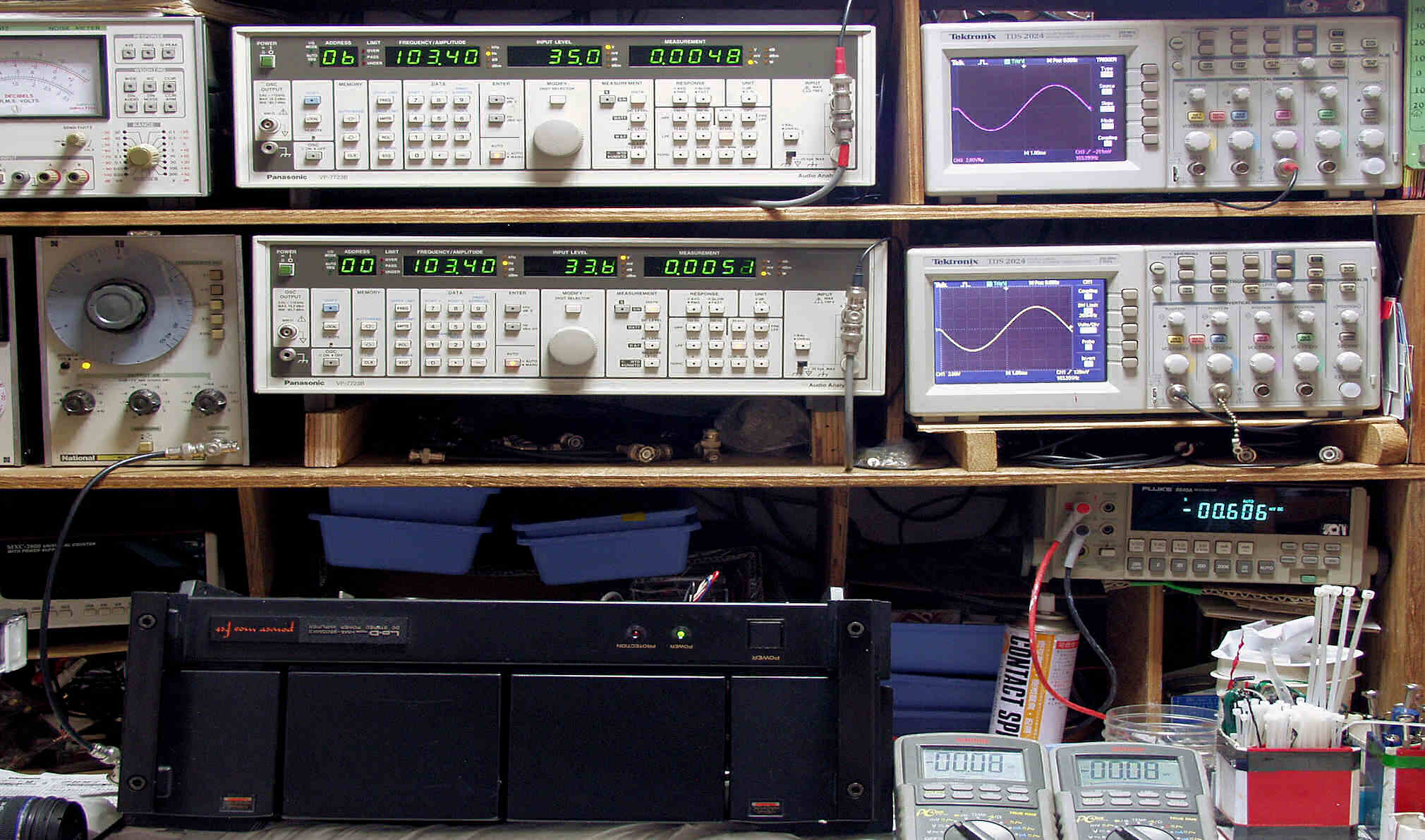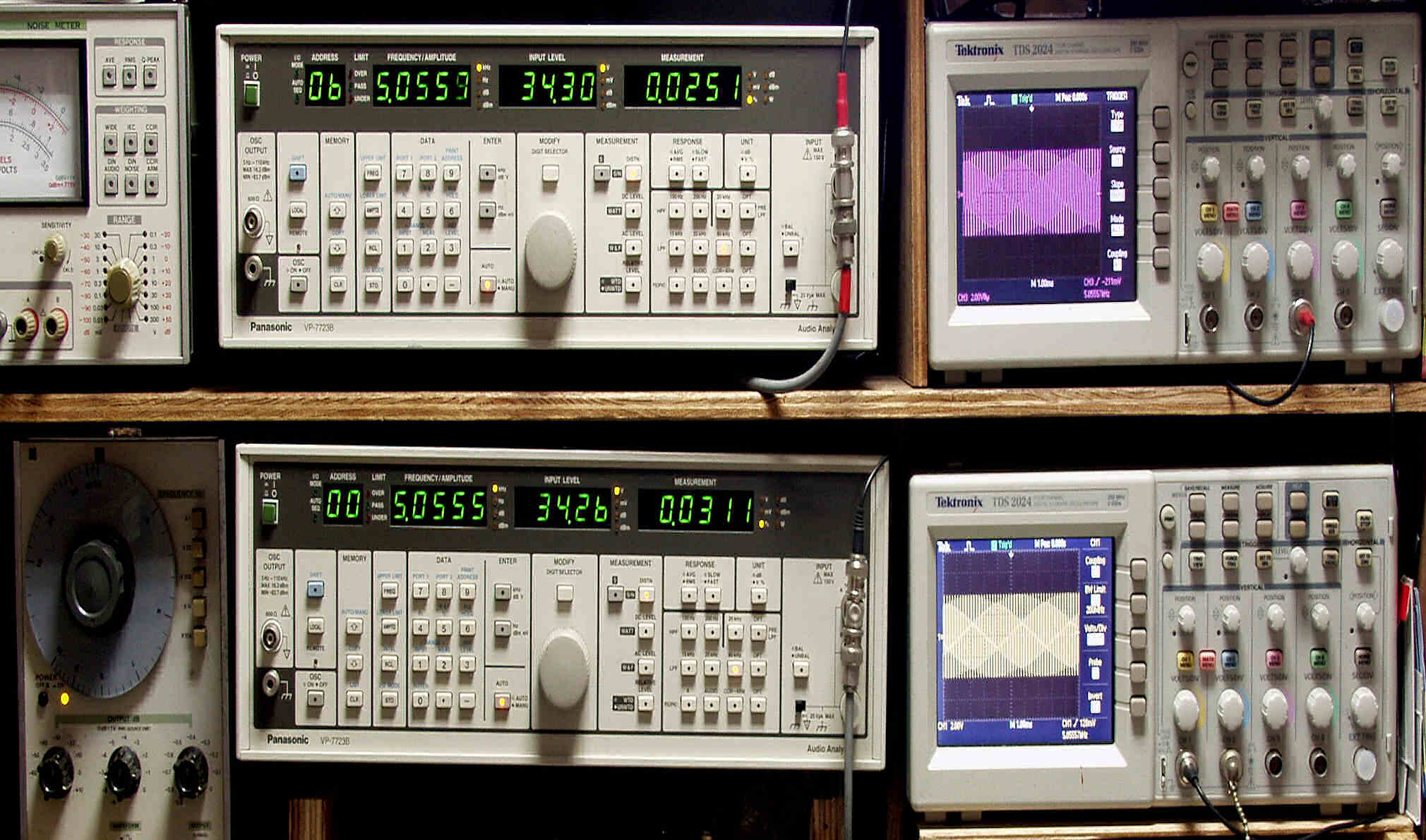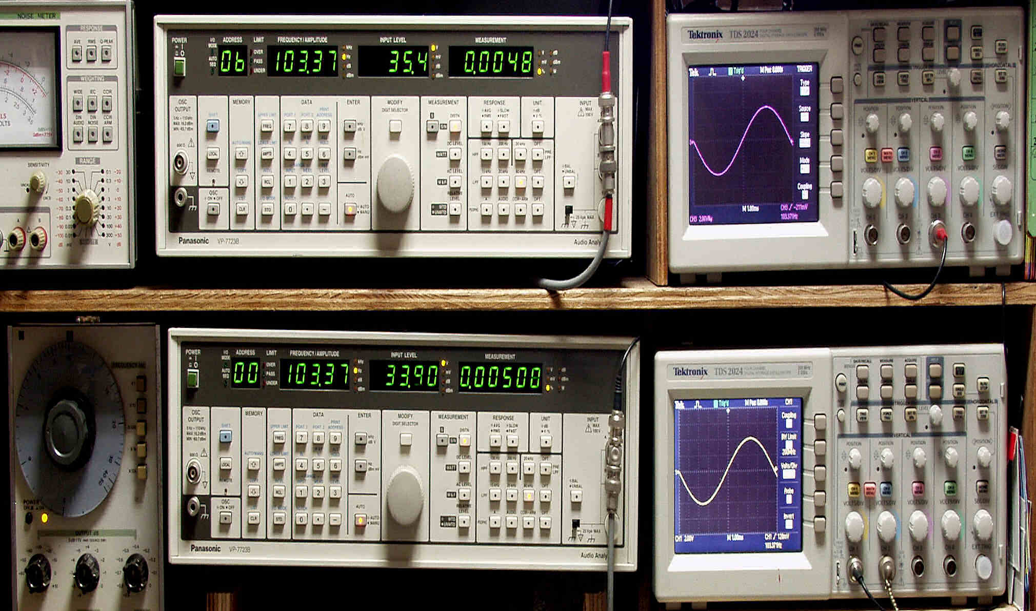 | E. 調整・測定 E1. 出力・歪み率測定。 「見方」。 上段中央オーディオアナライザ VP−7723B=R側測定。LED表示は右から、「歪み率」、「SP出力電圧」、「周波数」。 下段中央オーディオアナライザ VP−7723B=L側測定。LED表示は右から、「歪み率」、「SP出力電圧」、「周波数」。 上段右端オシロ TDS−2024=R側出力波形表示。(交流電圧が5V以上の場合1/10のATTが入ります)。 下段右端オシロ TDS−2024=L側出力波形表示。(交流電圧が5V以上の場合1/10のATTが入ります)。 下段左端 オーディオ発振器 VP−7201A より100Hz〜10kHzの信号を出し(歪み率=約0.003%)、ATT+分配器を通し、AMPに入力。 よって、ダイアル設定出力レベルより低くなります。 測定機器の仕様や整備の様子はこちら、「VP−7723B」「VP−7201A」 |
