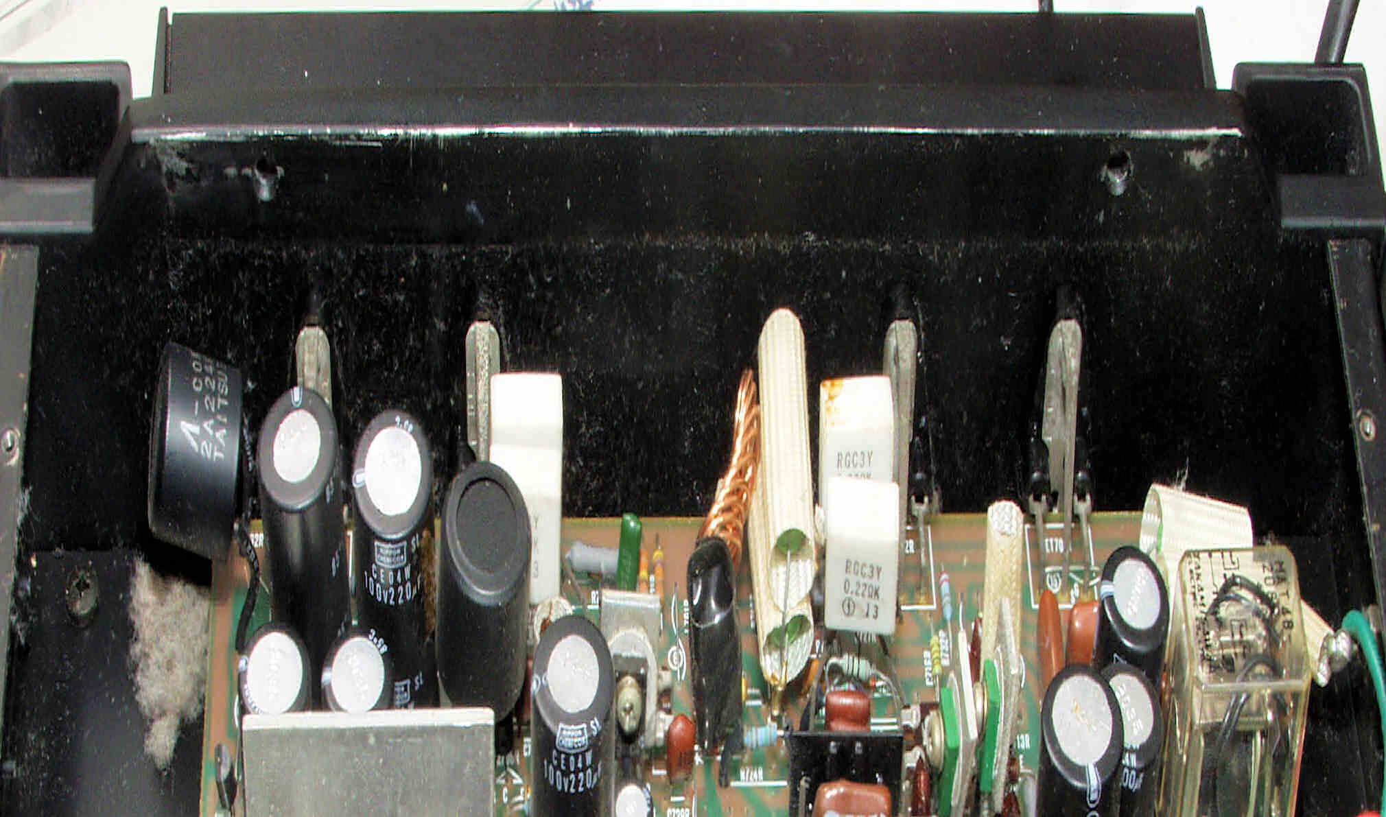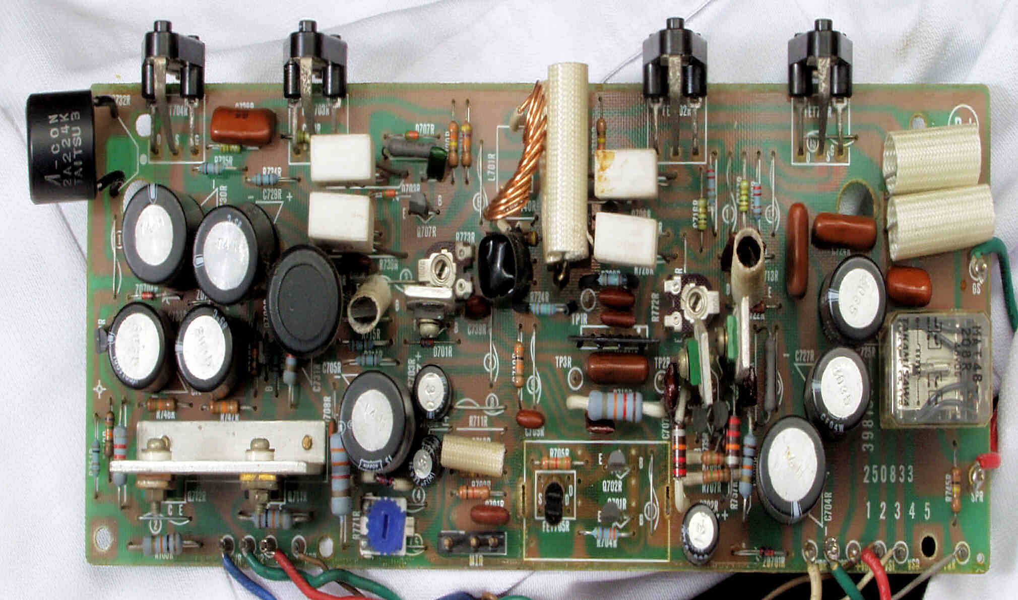 | C52. 修理後 電源基板 フューズ入り抵抗全部、電解コンデンサー9個、整流ダイオード10個、ヒューズ交換、 輪ゴムは接着材が固まるまで使用 |