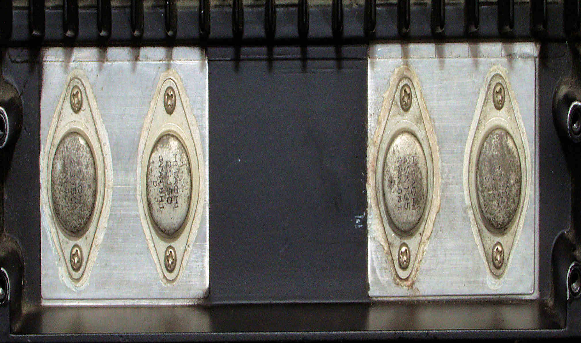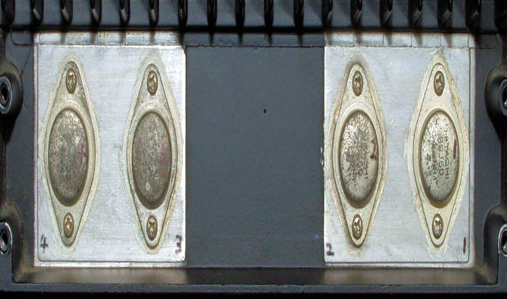 | C332. 修理中 L側終段FET(電界効果トランジスター)、取り付けよう絶縁マイカー、取り外し回数が多いのか、穴が変形している。 熱伝導の良い「シリコン製絶縁シート」は比誘電率が、シリコーンオイル=2.60〜2.75、雲母=5〜8と、 2倍の開きがあり、高域特性に影響が出るので、現在は未採用。 |