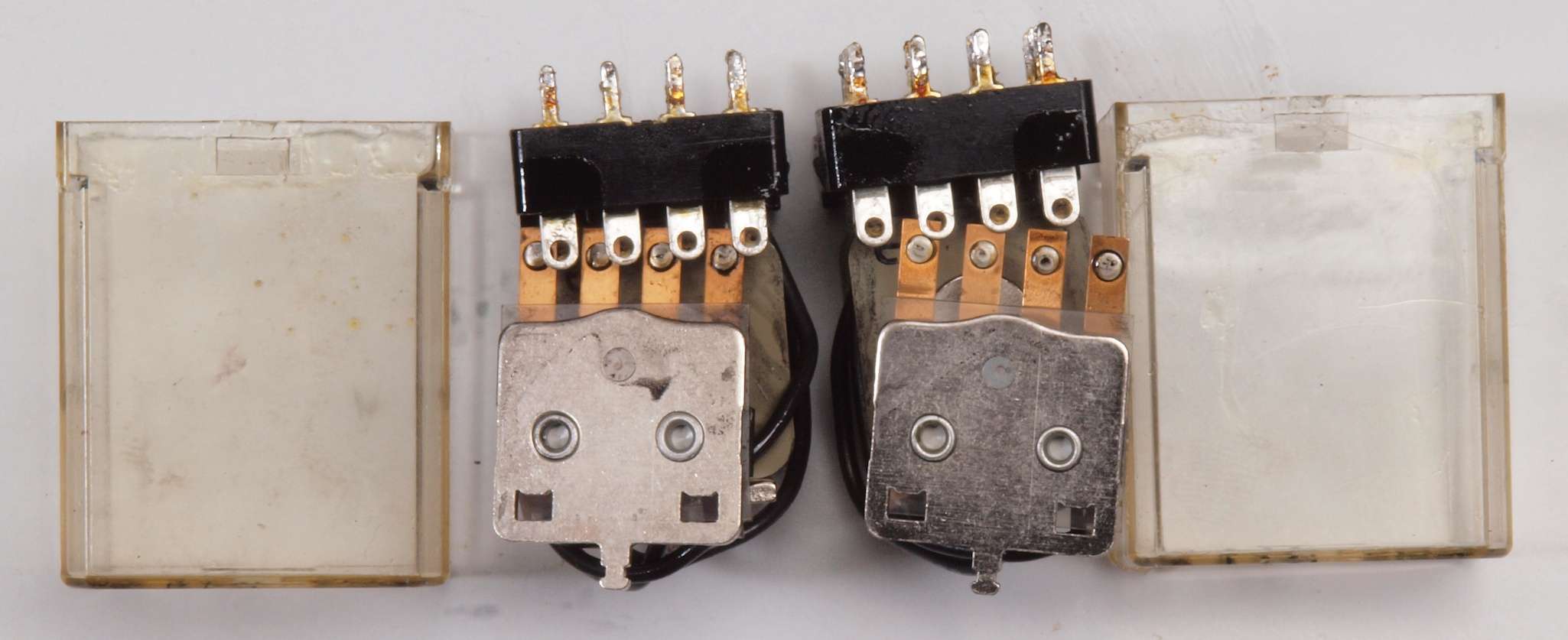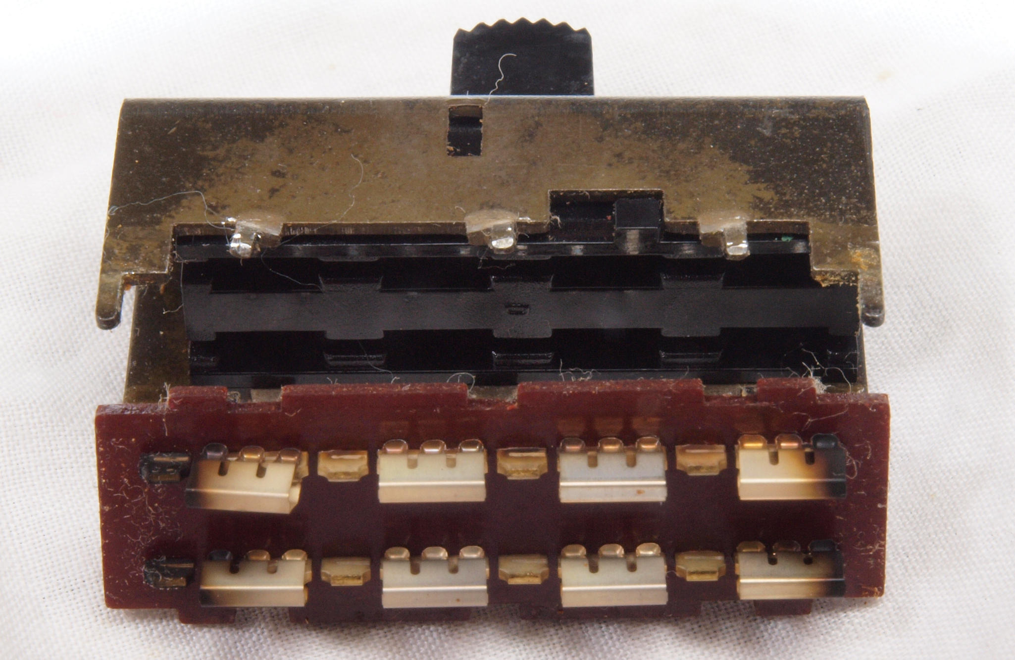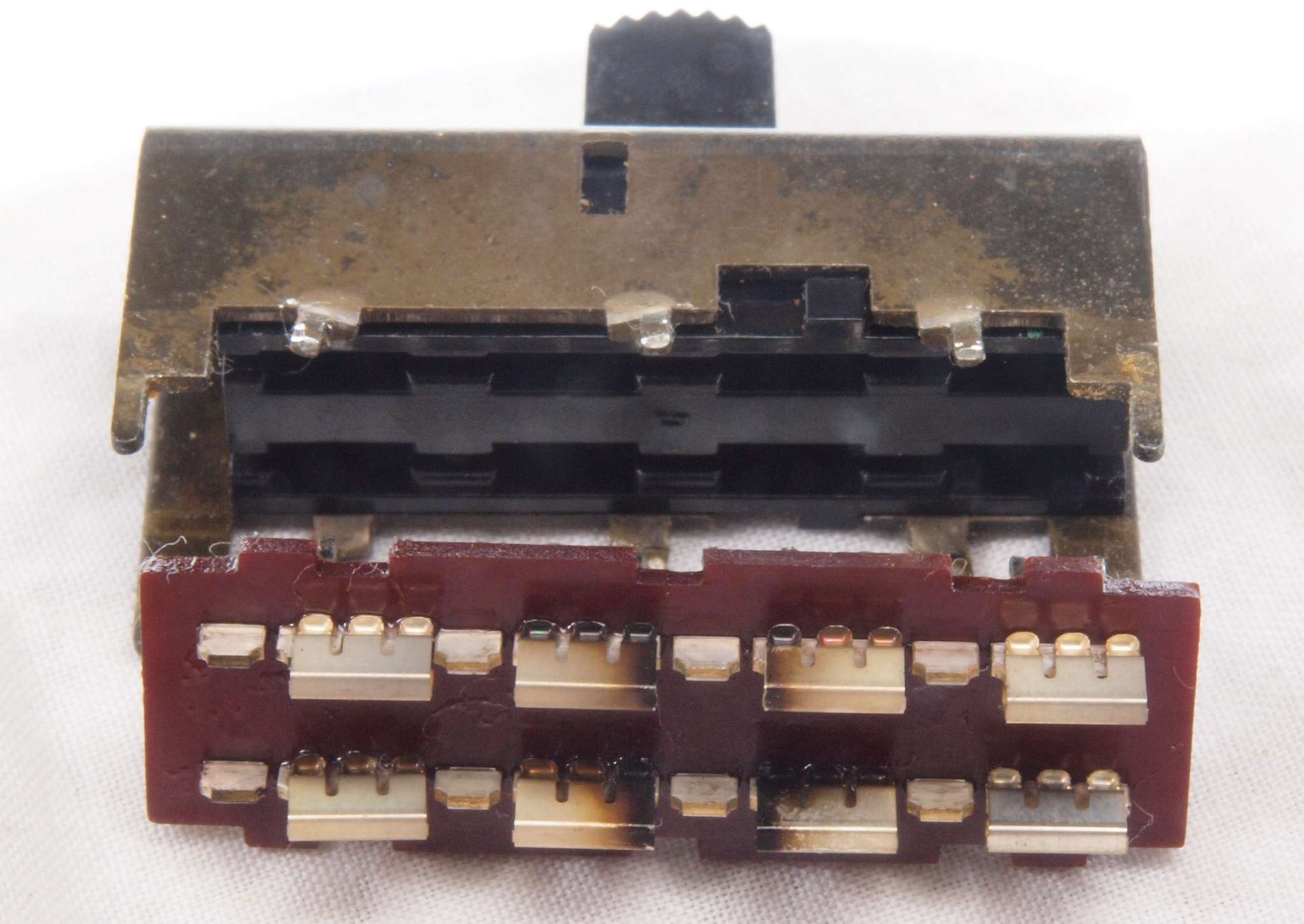 | C6E. 修理中 RCA端子基板の切り換えSW分解。端子を洗浄する。 使用するのは端の1回路のみ、内側の綺麗な接触子と交換して組む。 |