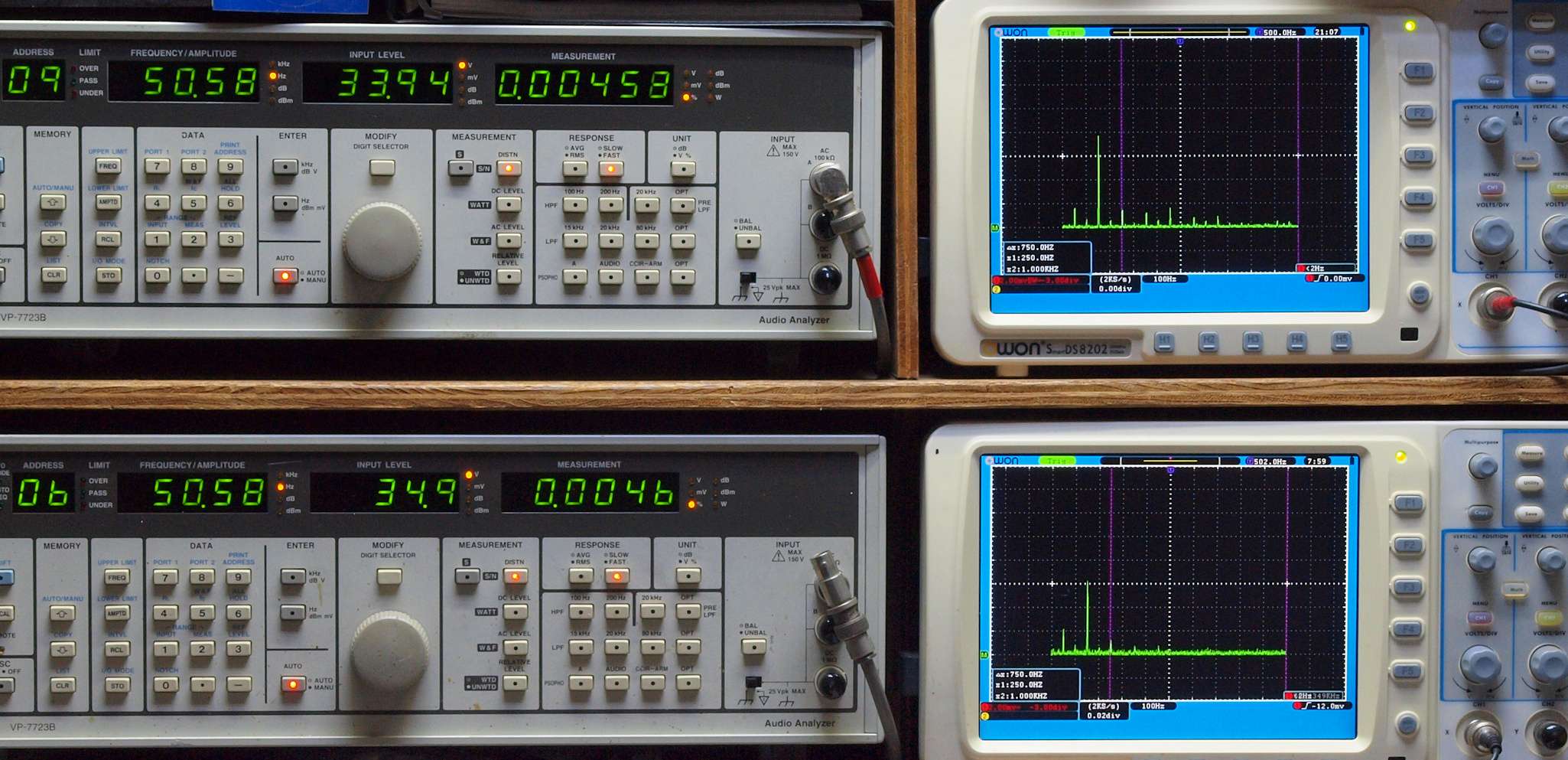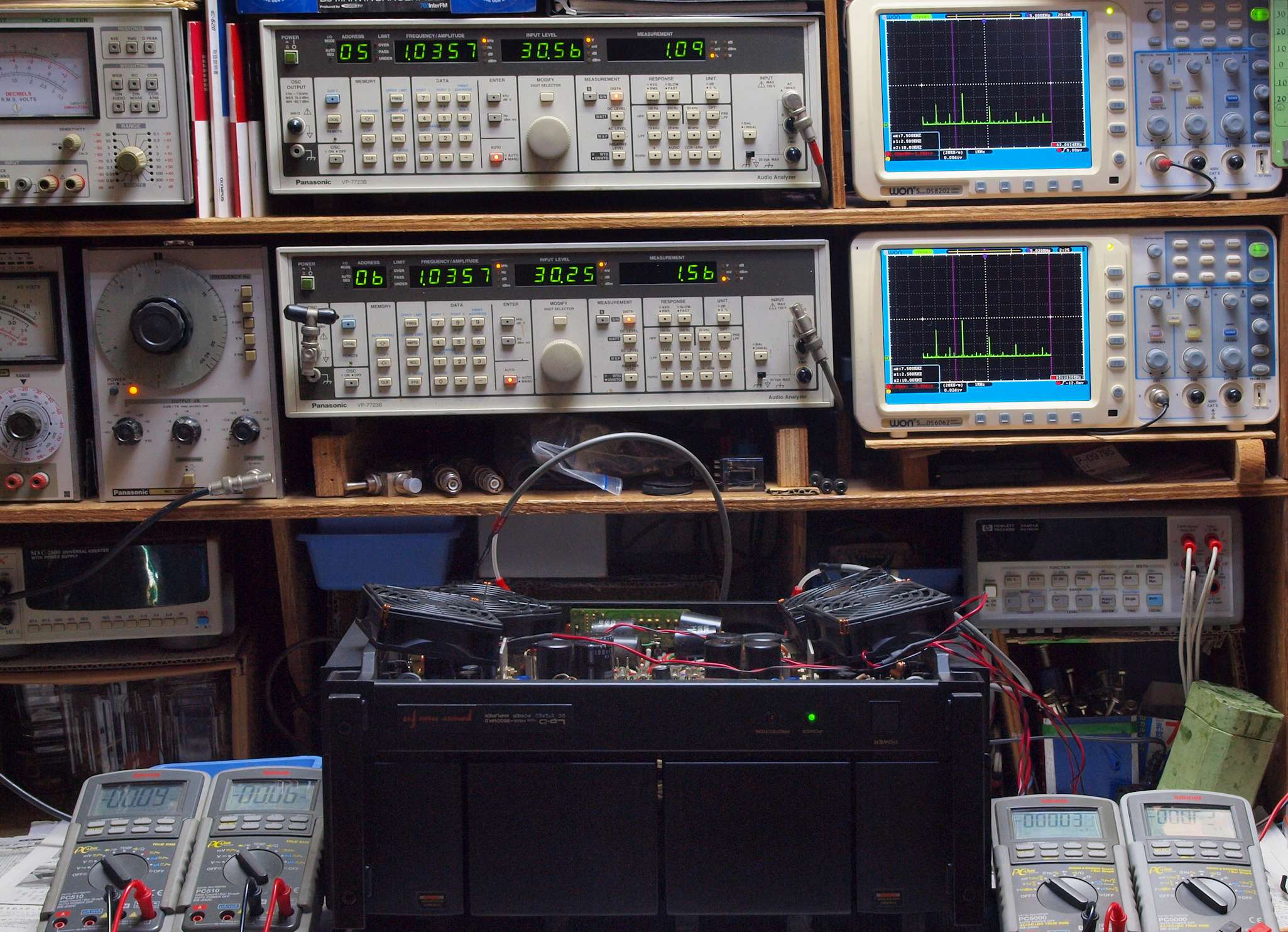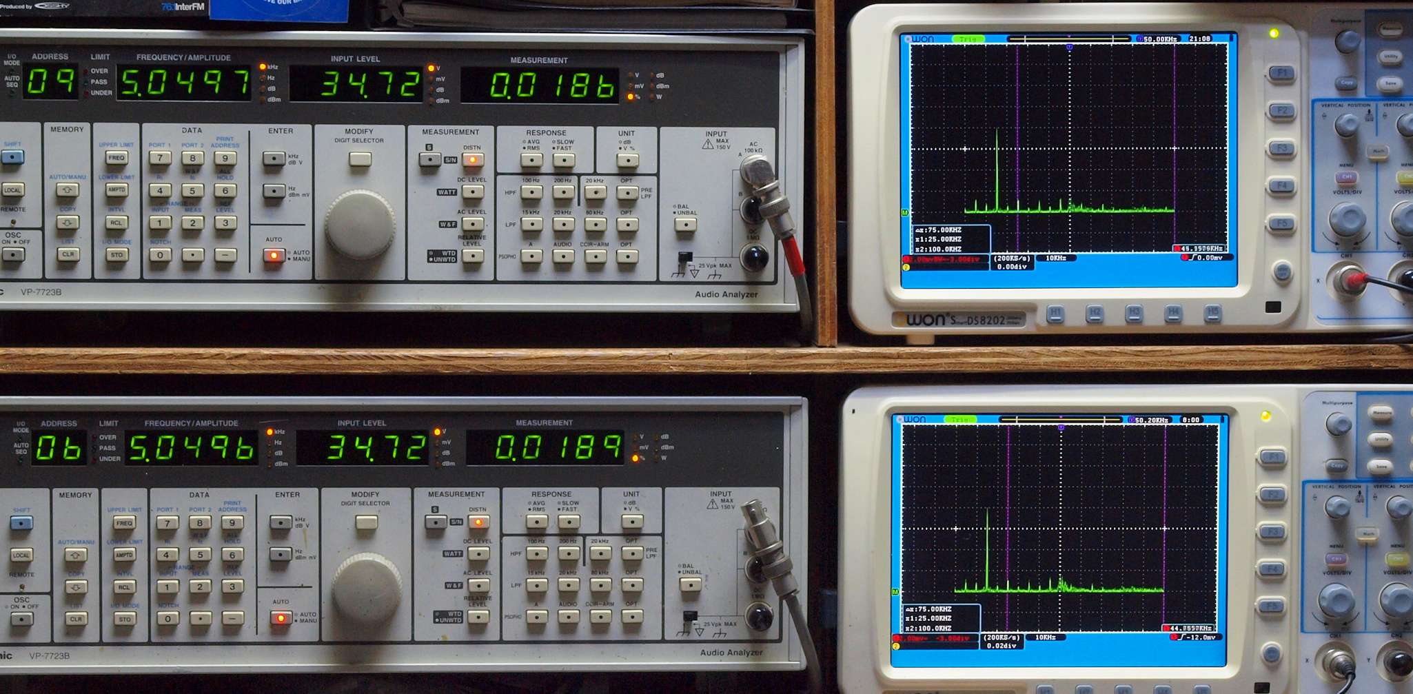 | E. 測定・調整。 画像をクリックすると、大きく(横幅2050ドット)表示されます。 E1. 出力・歪み率測定・調整 「見方」。 上段中 右側SP出力を「Audio Analyzer Panasonic VP−7723B」により測定。 表示LED、 左端=メモリーNo、 中左=周波数測定、 中右=出力電圧測定、 右端=歪み率測定。 上段右端 VP−7723Bの基本波除去出力を「owon SDS8202(200MHZ)」で「FFT分析」表示。 下段中 左側SP出力を「Audio Analyzer Panasonic VP−7723B」により測定。 表示LED、 左端=メモリーNo、 中左=周波数測定、 中右=出力電圧測定、 右端=歪み率測定。 下段右端 VP−7723Bの基本波除去出力を「owon SDS6062(200MHZ)」で「FFT分析」表示。 下段左端 オーディオ発振器 VP−7201A より50Hz〜100kHzの信号を出し(歪み率=約0.003%)、ATT+分配器を通し、AMPに入力。 よって、ダイアル設定出力レベルより低なります。測定機器の仕様や整備の様子はこちら、「VP−7723B」「VP−7201A」。 FFT画面の見方はこちら。 |