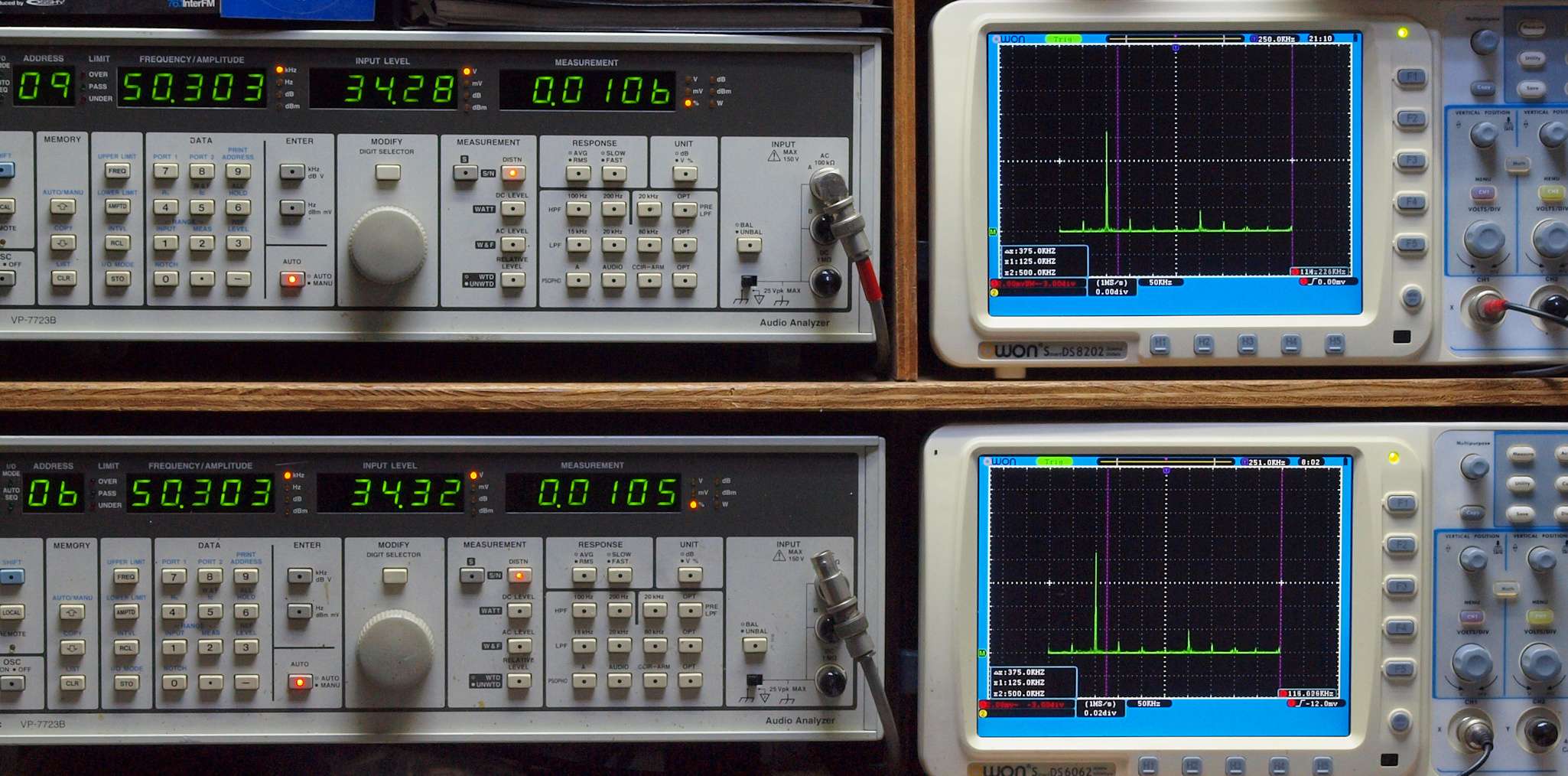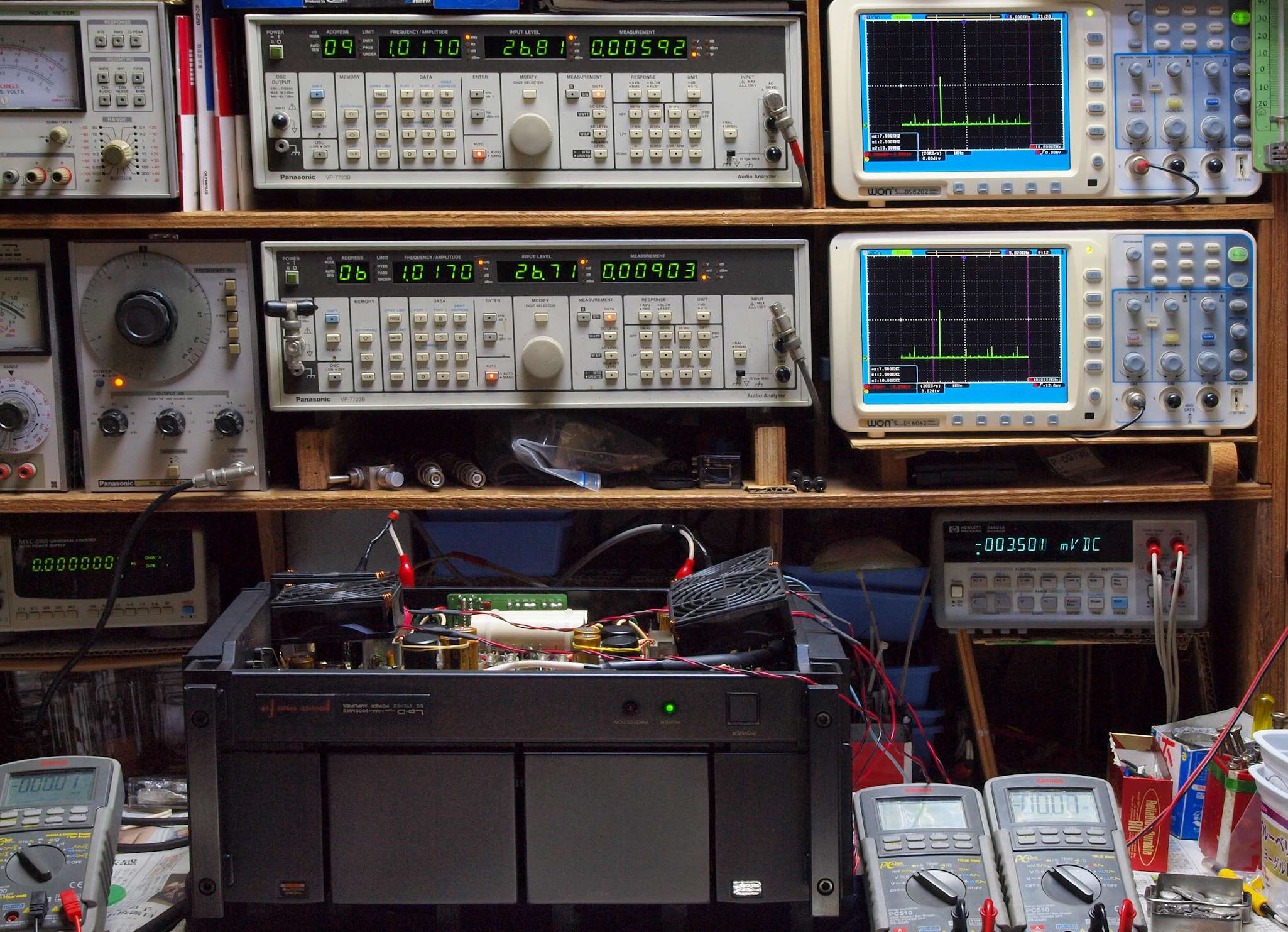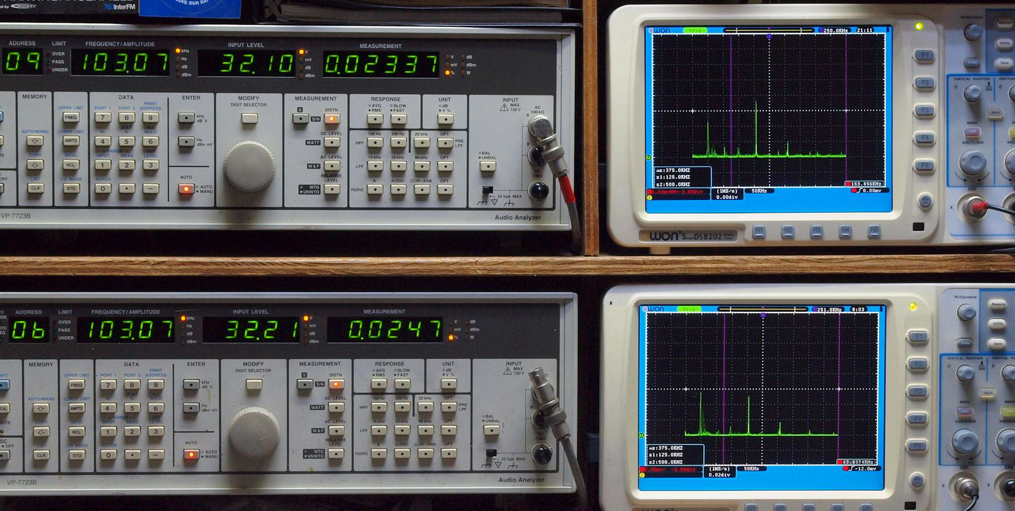 | E. 測定・調整。 画像をクリックすると、大きく(横幅2050ドット)表示されます。 E1. 出力・歪み率測定・調整 「見方」。 上段中 右側SP出力を「Audio Analyzer Panasonic VP−7723B」により測定。 表示LED、 左端=メモリーNo、 中左=周波数測定、 中右=出力電圧測定、 右端=歪み率測定。 上段右端 VP−7723Bの基本波除去出力を「owon SDS8202(200MHZ)」で「FFT分析」表示。 下段中 左側SP出力を「Audio Analyzer Panasonic VP−7723B」により測定。 表示LED、 左端=メモリーNo、 中左=周波数測定、 中右=出力電圧測定、 右端=歪み率測定。 下段右端 VP−7723Bの基本波除去出力を「owon SDS6062(200MHZ)」で「FFT分析」表示。 下段左端 オーディオ発振器 VP−7201A より50Hz〜100kHzの信号を出し(歪み率=約0.003%)、ATT+分配器を通し、AMPに入力。 よって、ダイアル設定出力レベルより低なります。測定機器の仕様や整備の様子はこちら、「VP−7723B」「VP−7201A」。 FFT画面の見方はこちら。 |
