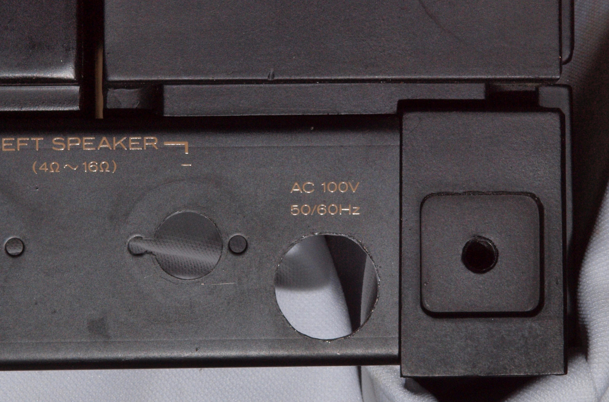 | C92. 修理中 電源ケーブル取り付け部穴加工前。 SP接続端子との距離を取る為に、下右方向へ広げる為、昔ながらのヤスリで削る。 |