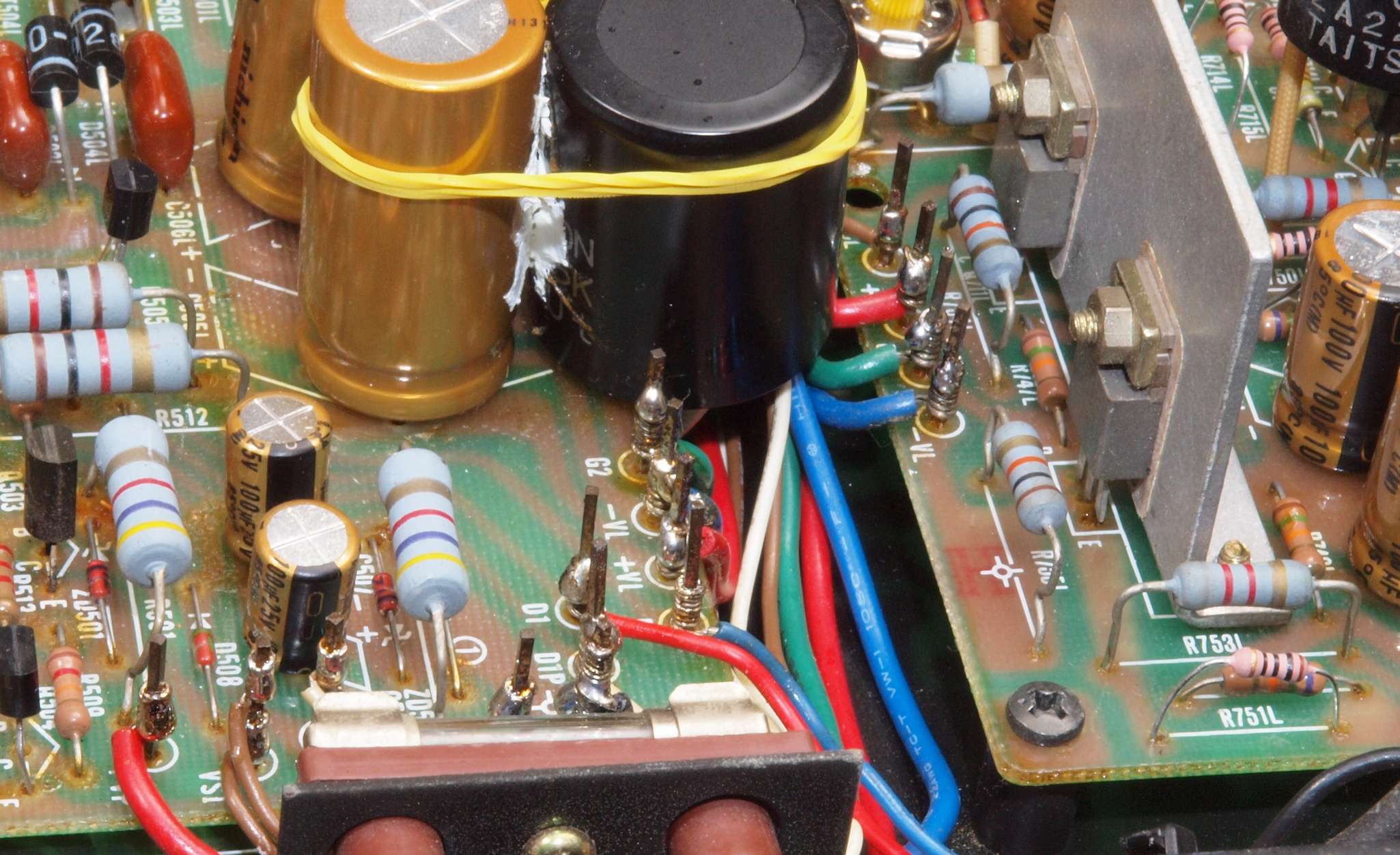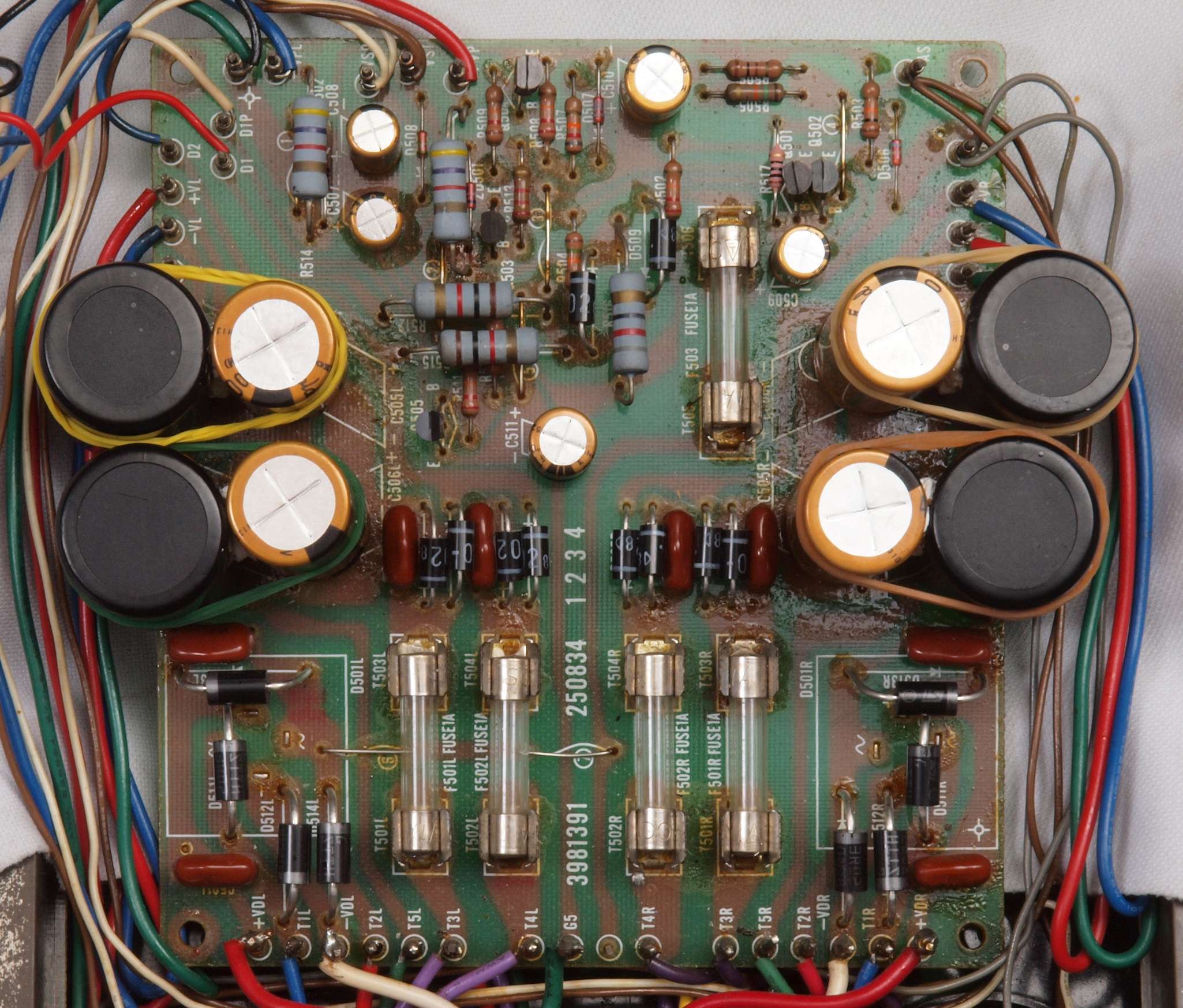 | C51. 修理前 電源基板。 入手難のヒューズ入り抵抗が全て普通の抵抗に交換されている。 |