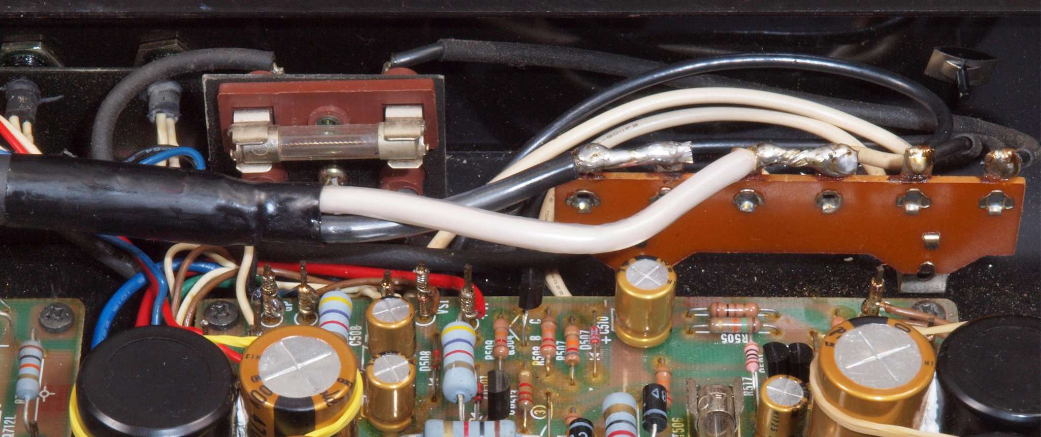 | C. 修理状況。 画像をクリックすると、大きく(横幅2050ドット)表示されます。 C11. 修理前 R側ドライブ基板。 入手難のヒューズ入り抵抗が全て普通の抵抗に交換されている。 |