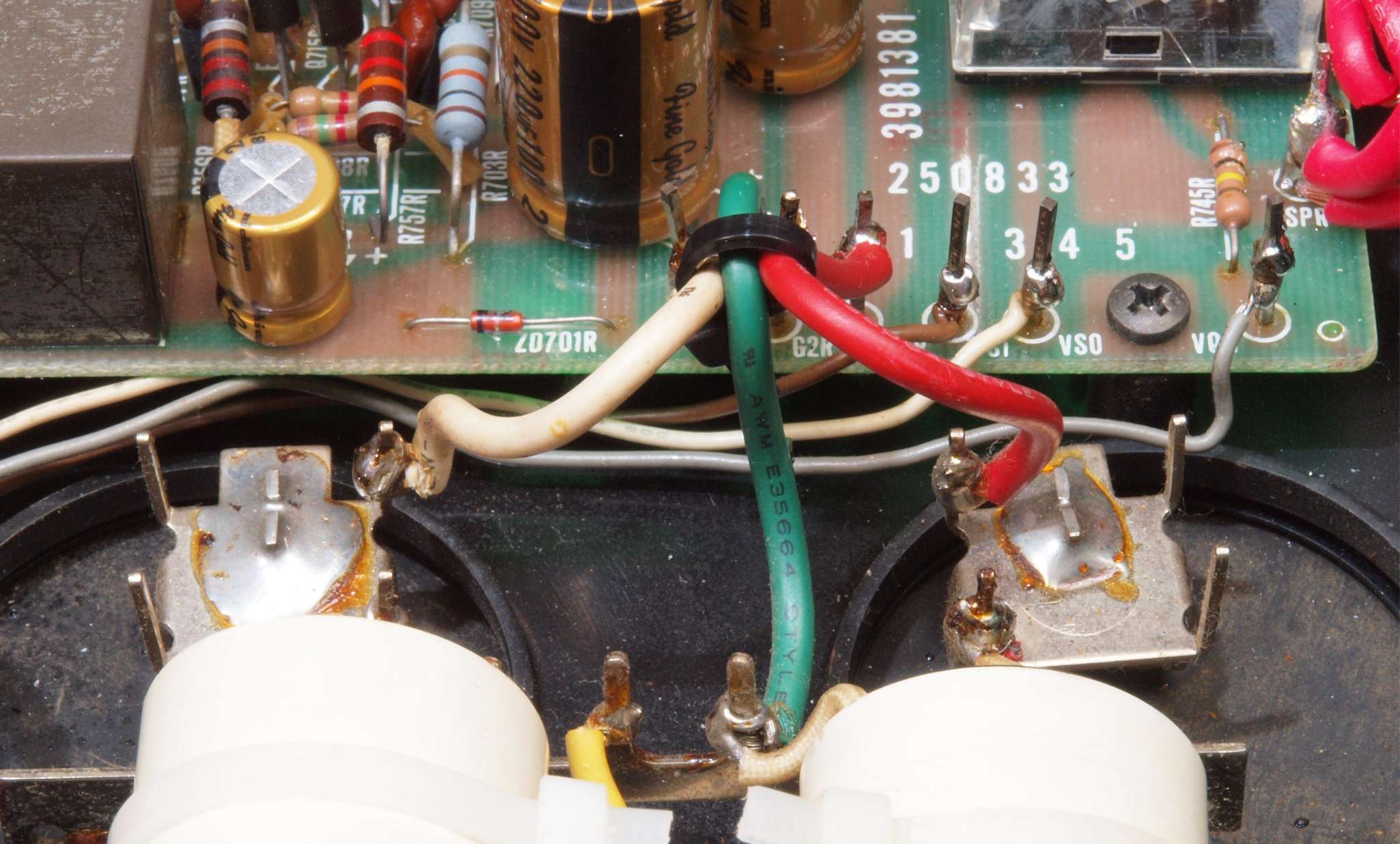 | C76. 修理後 R−SP端子裏配線。 WBTのネジ止めを生かし、ネジ止め接続+半田接続のW配線にした。理由はこちら。 白く着いているのは湿度が高かった為、接着材の蒸気、やがて消えます。 |