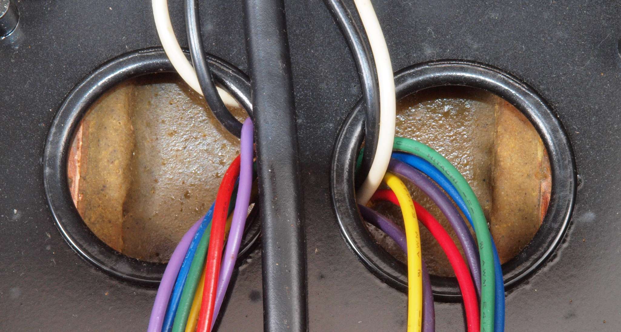 | C9B. 修理中 3Pプラグにケーブル取り付。 差し込み固定が一般ですが、時計方向に巻き付けると良い。 上のK線=巻き付いた端側、 下の白線=挿入した側。 これで差し込み固定の3倍位接触面積が増し、接触抵抗が低くなる。 |