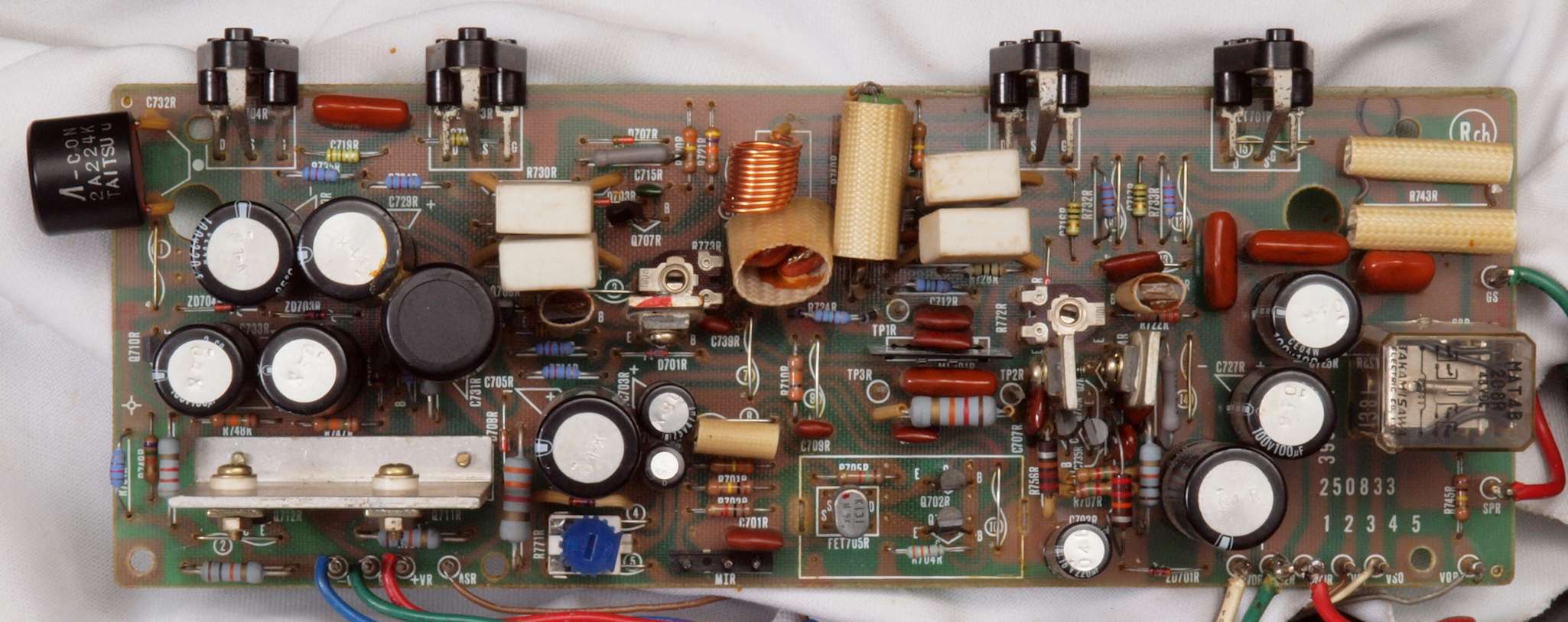 | C12. 修理後 R側ドライブ基板。 初段FET(電界効果トランジスター)、バランス・バイアス調整用半固定VR3個、SP接続リレー交換 ヒューズ入り抵抗全部、電解コンデンサー11個、足黒TR(トランジスター)1個交換。 |