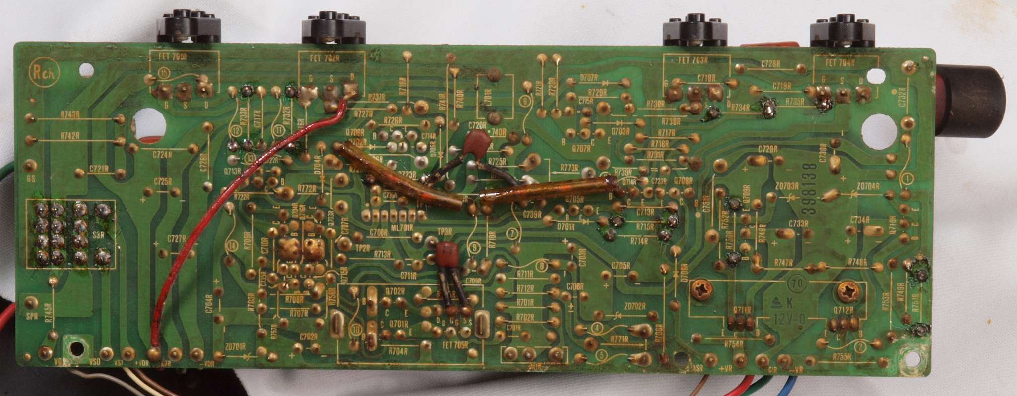 | C6A. 修理(半田補正)後 RCA端子基板裏 半田を全部やり直す フイルムコンデンサー2個増設 |
