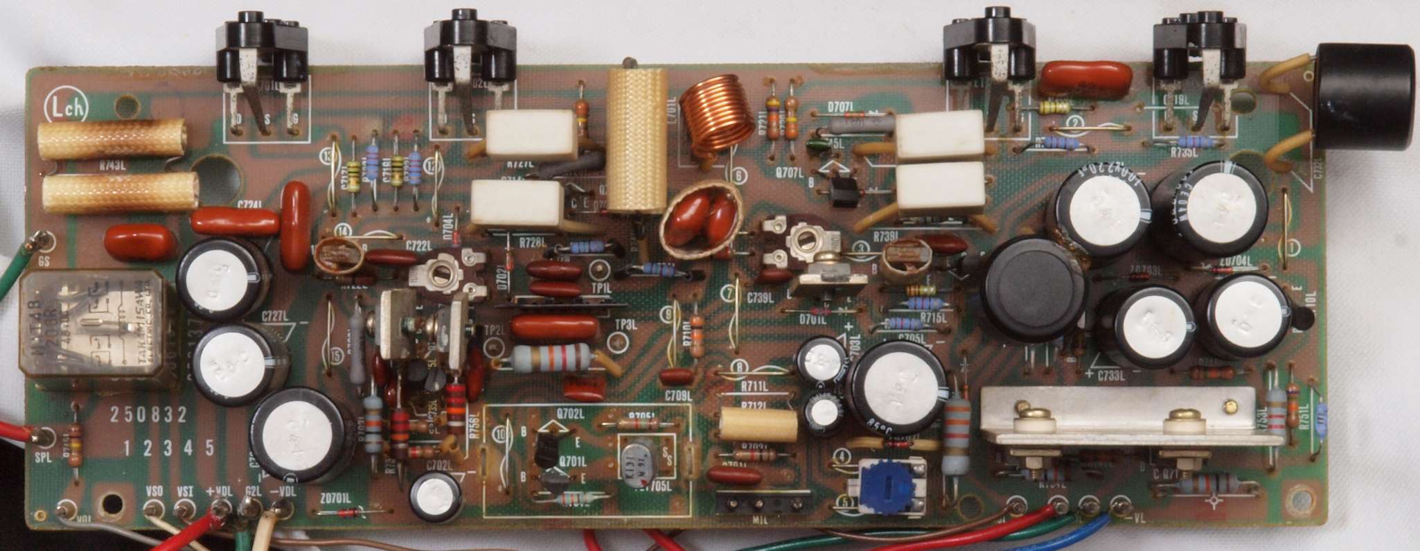 | C21. 修理前 L側ドライブ基板。 入手難のヒューズ入り抵抗が全て普通の抵抗に交換されている。 |
