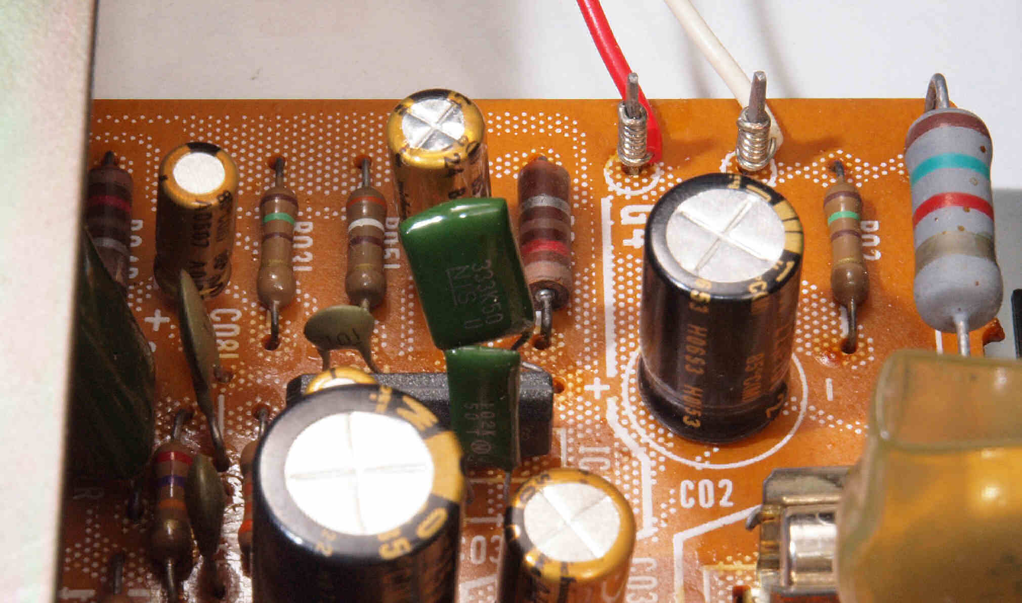 C213. 修理後 定電圧・HeadHornAMP基板。 電解コンデンサー固定用の接着材を取り除き、コート液を塗る。