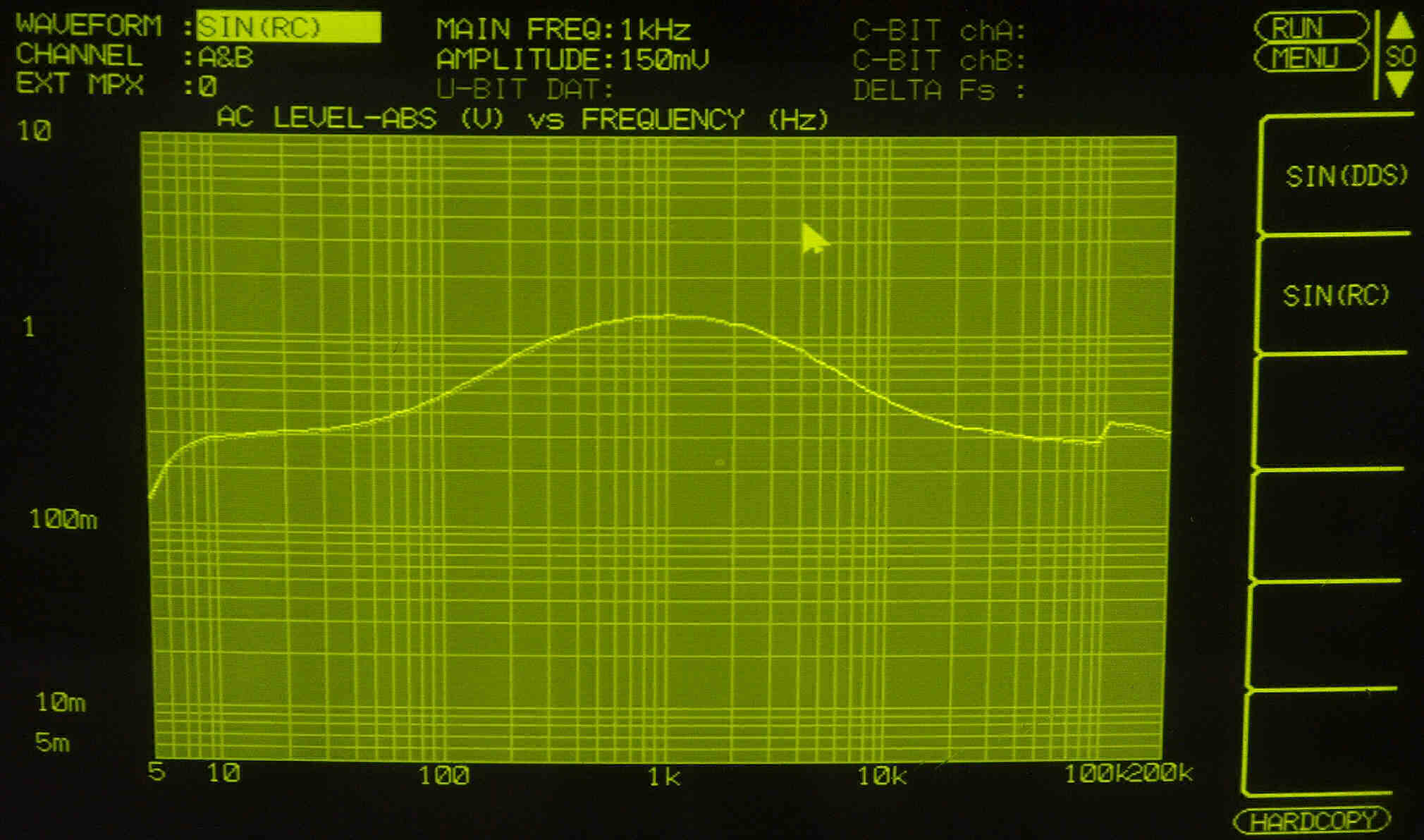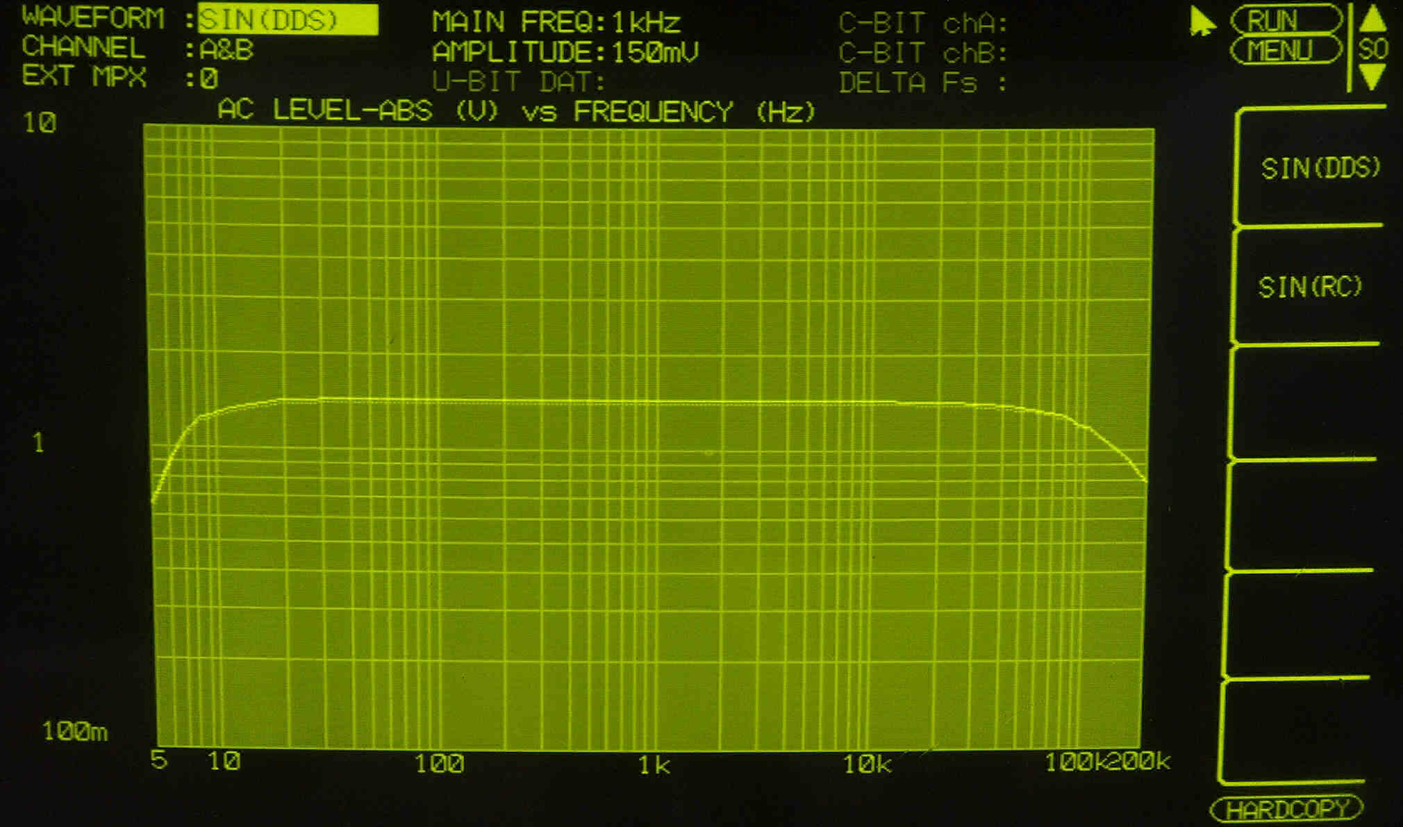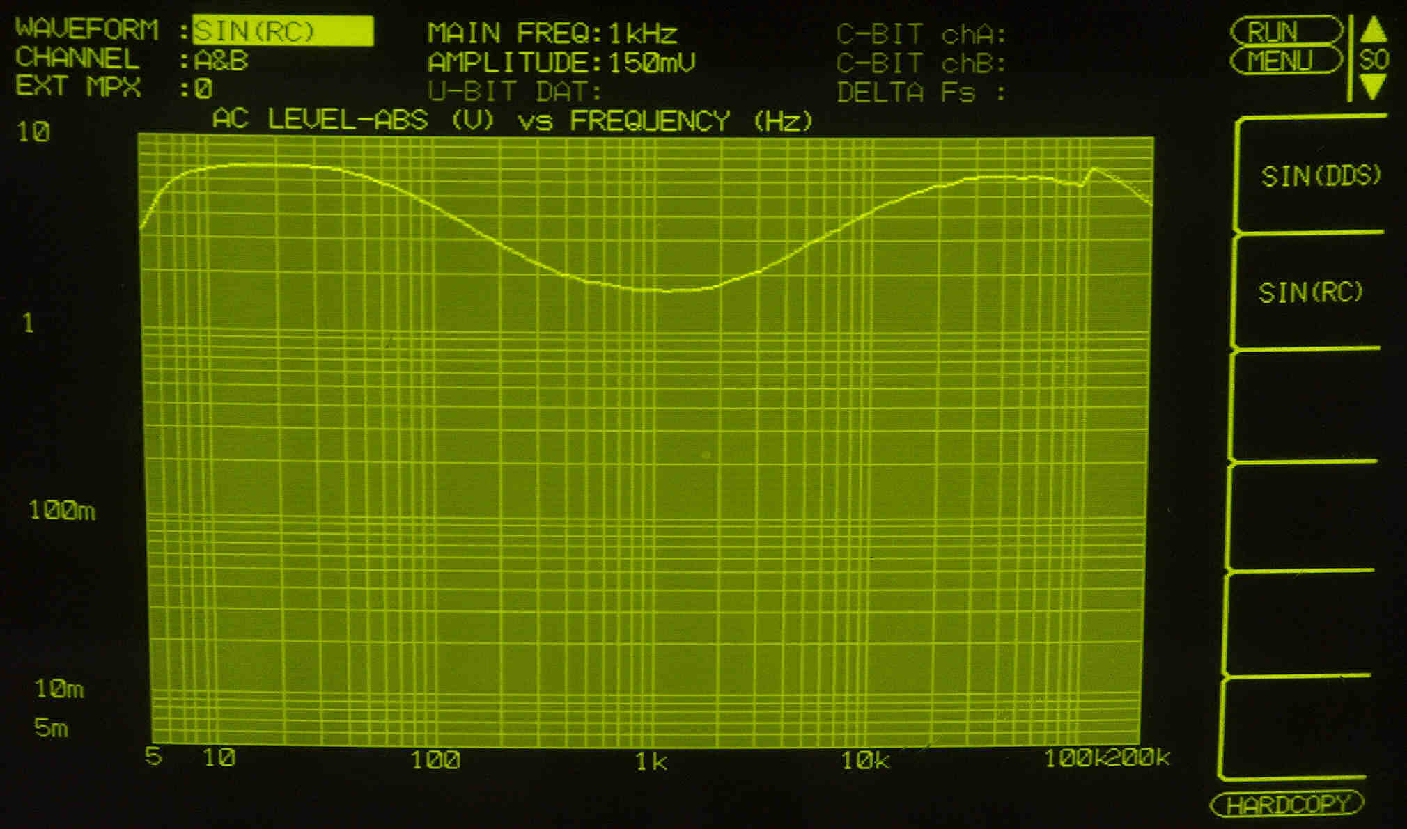 AUX入力端子へ150mV一定入力 VRはmax 左出力=薄(細い)色 右出力=濃い(太い)色