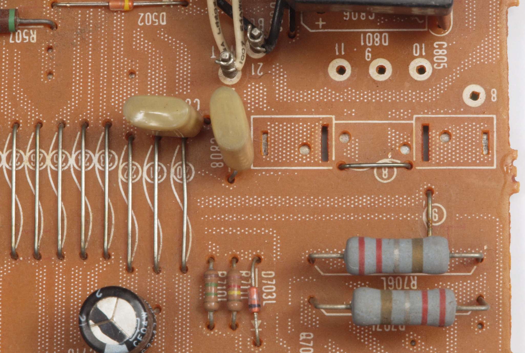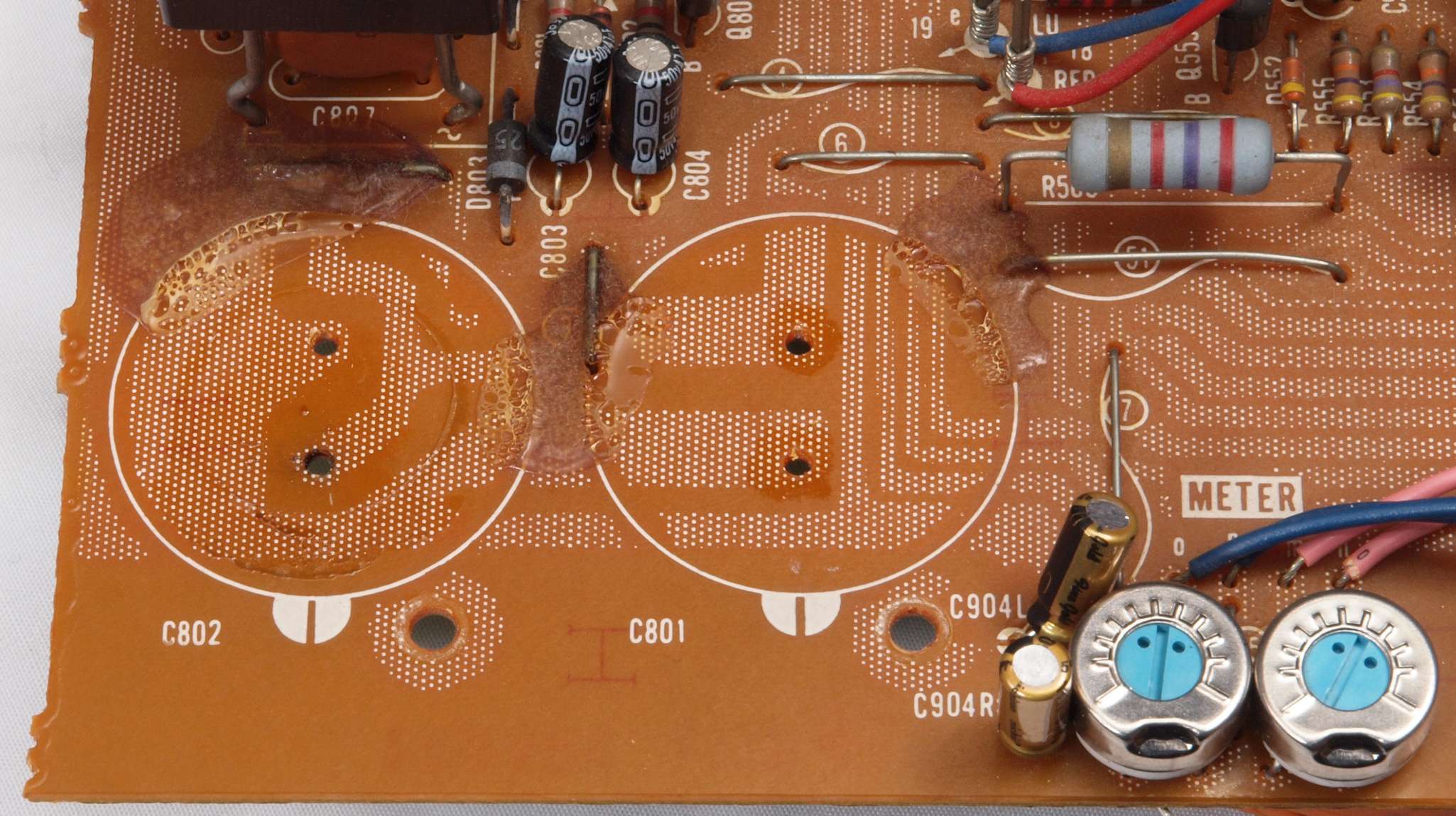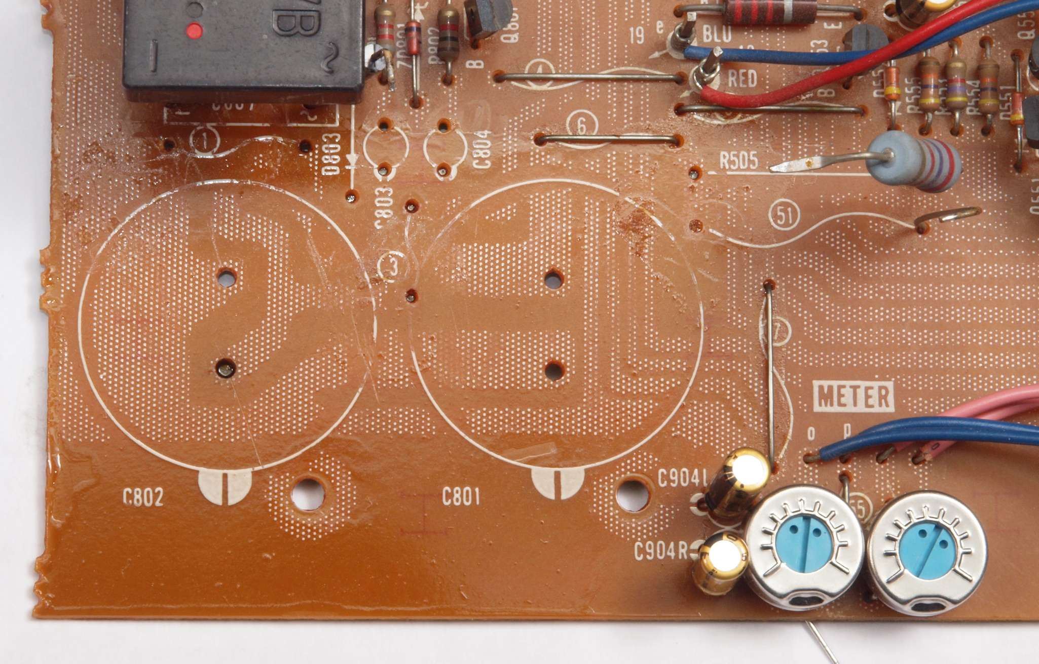 C12. 修理中 メイン基板。電解コンデンサー固定するトルエン溶媒の接着剤。