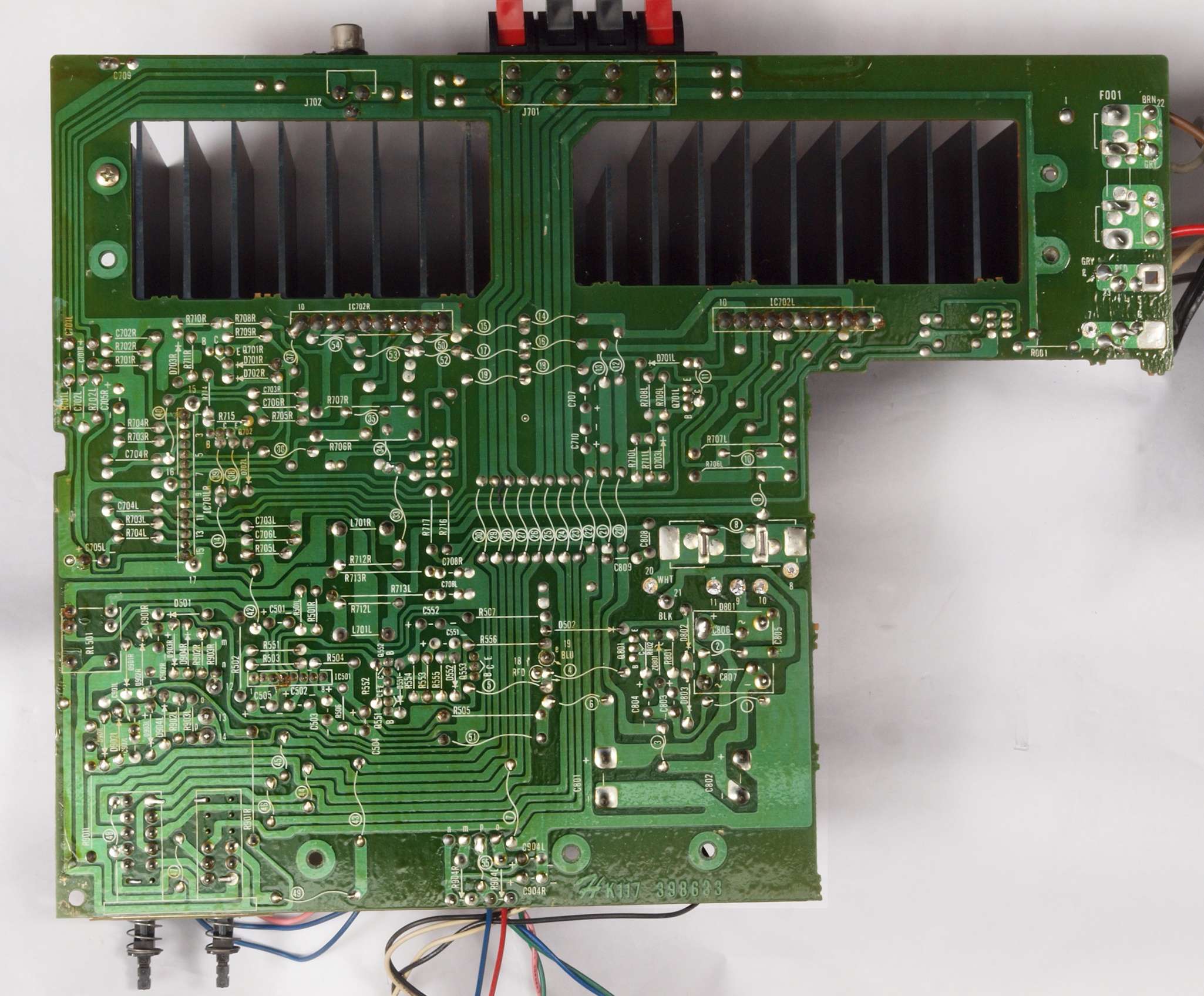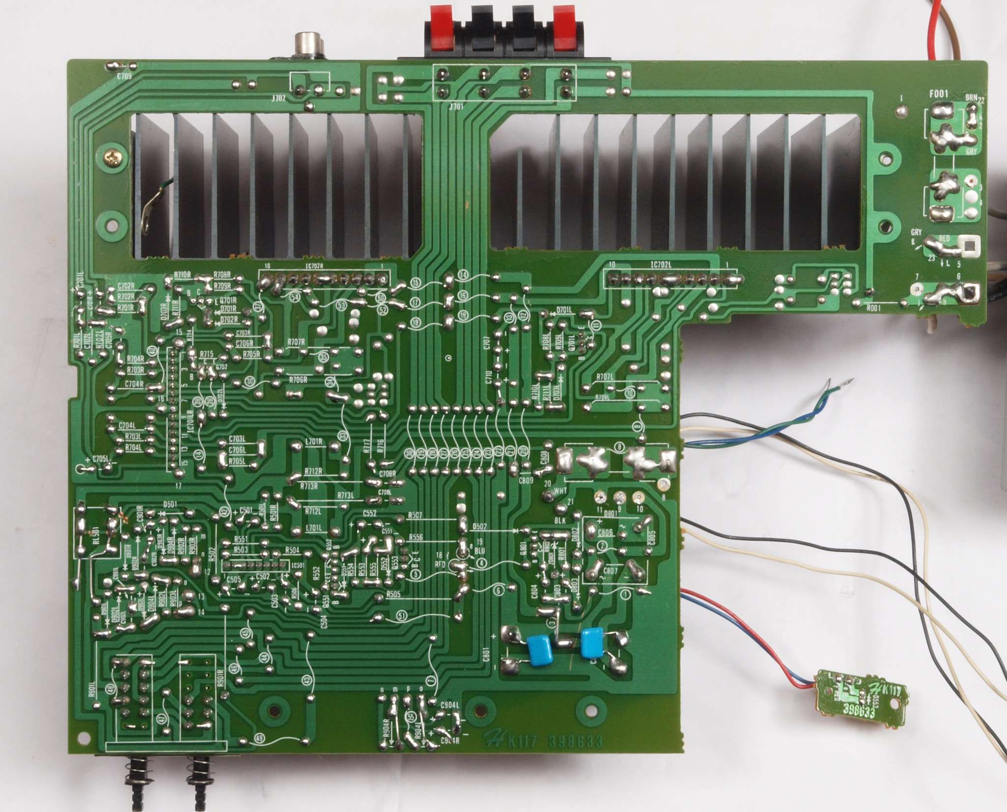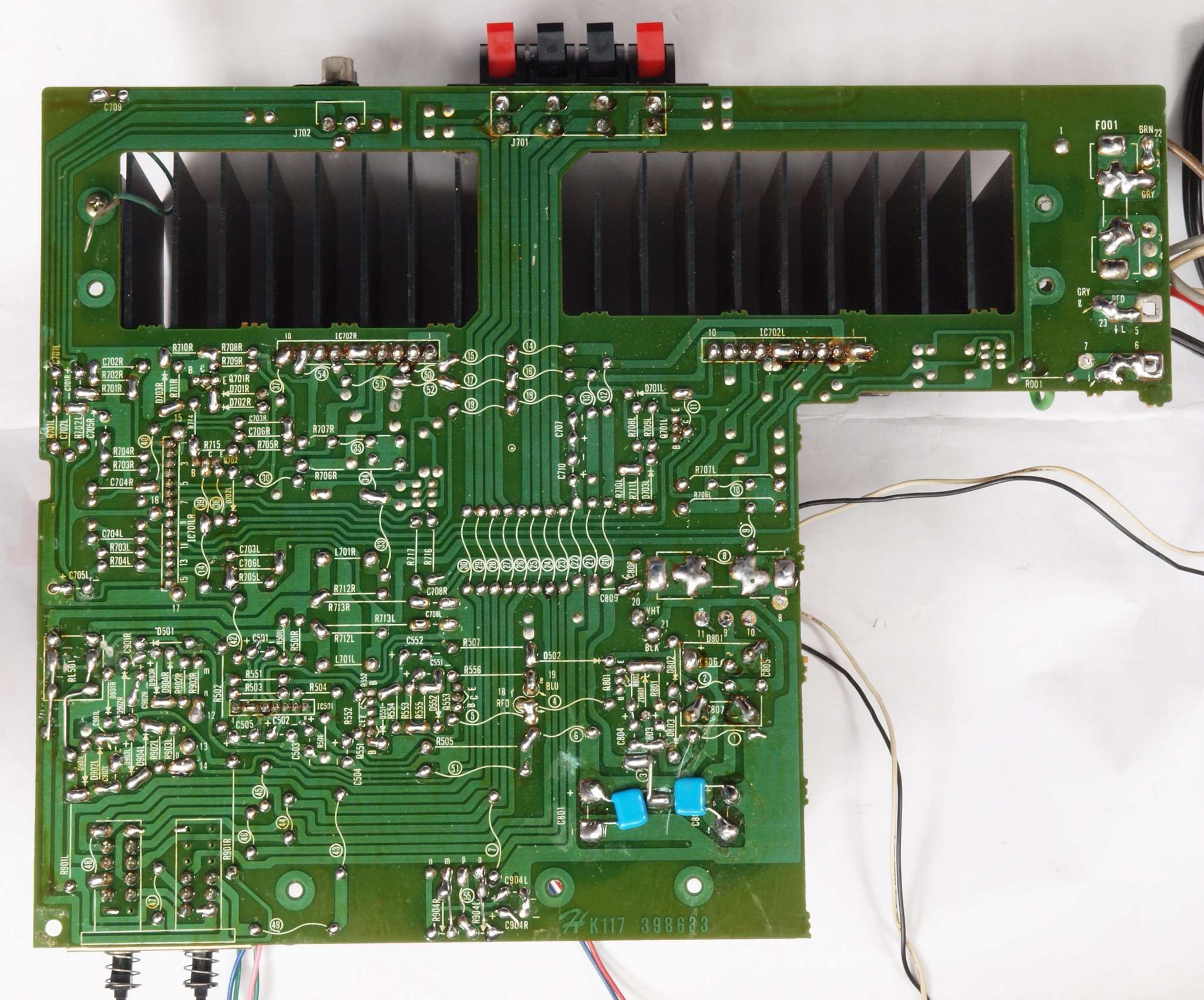 C16. 修理(半田補正)後 メイン基板裏、 半田を全部やり直す。フイルムコンデンサー2個追加。