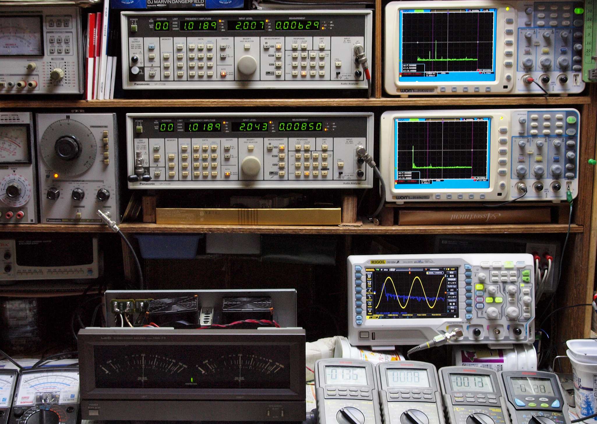 下段左端 オーディオ発振器 VP−7201A より50Hz〜100kHzの信号を出し(歪み率=約0.003%)、ATT+分配器を通し、AMPに入力。
