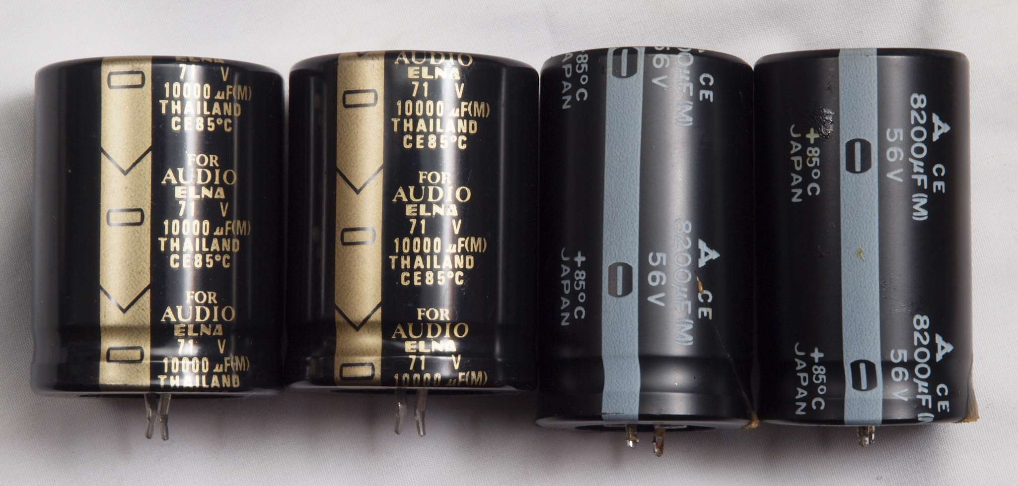 A51. 点検中 電源ブロック電解コンデンサー比較。交換する左=10000μ/71WV、付いていた右=8200μ/56WV。