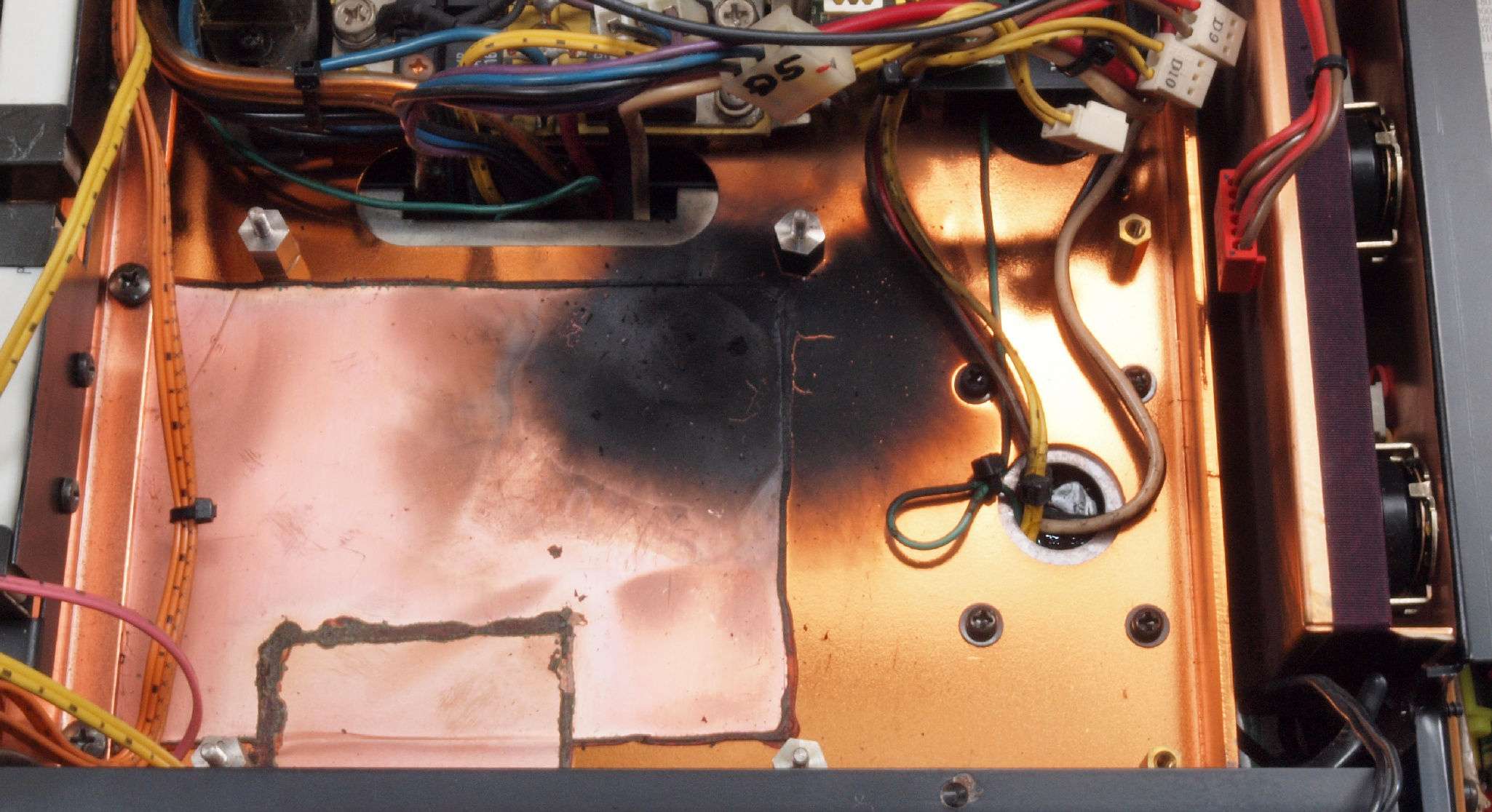 | A3. 点検中 上下ケース(蓋)、前パネルを取り、下から見る。 右側、プロテクト・定電圧基板下の焼け跡。 | ||||||||||||||||||||||||||||||||