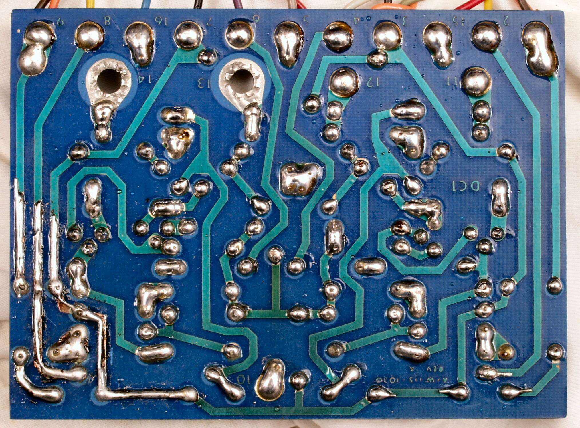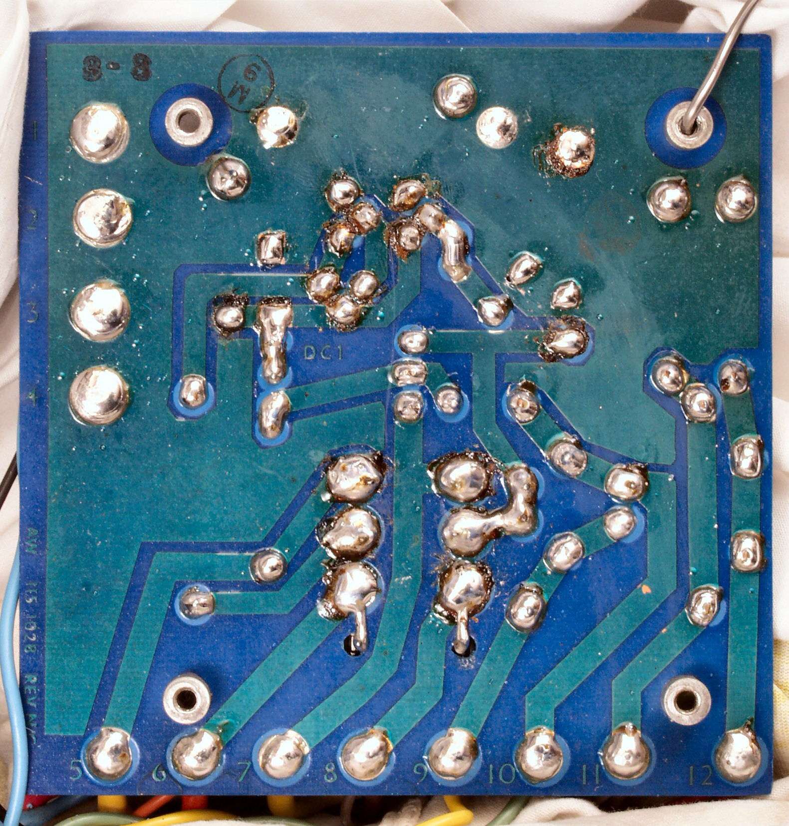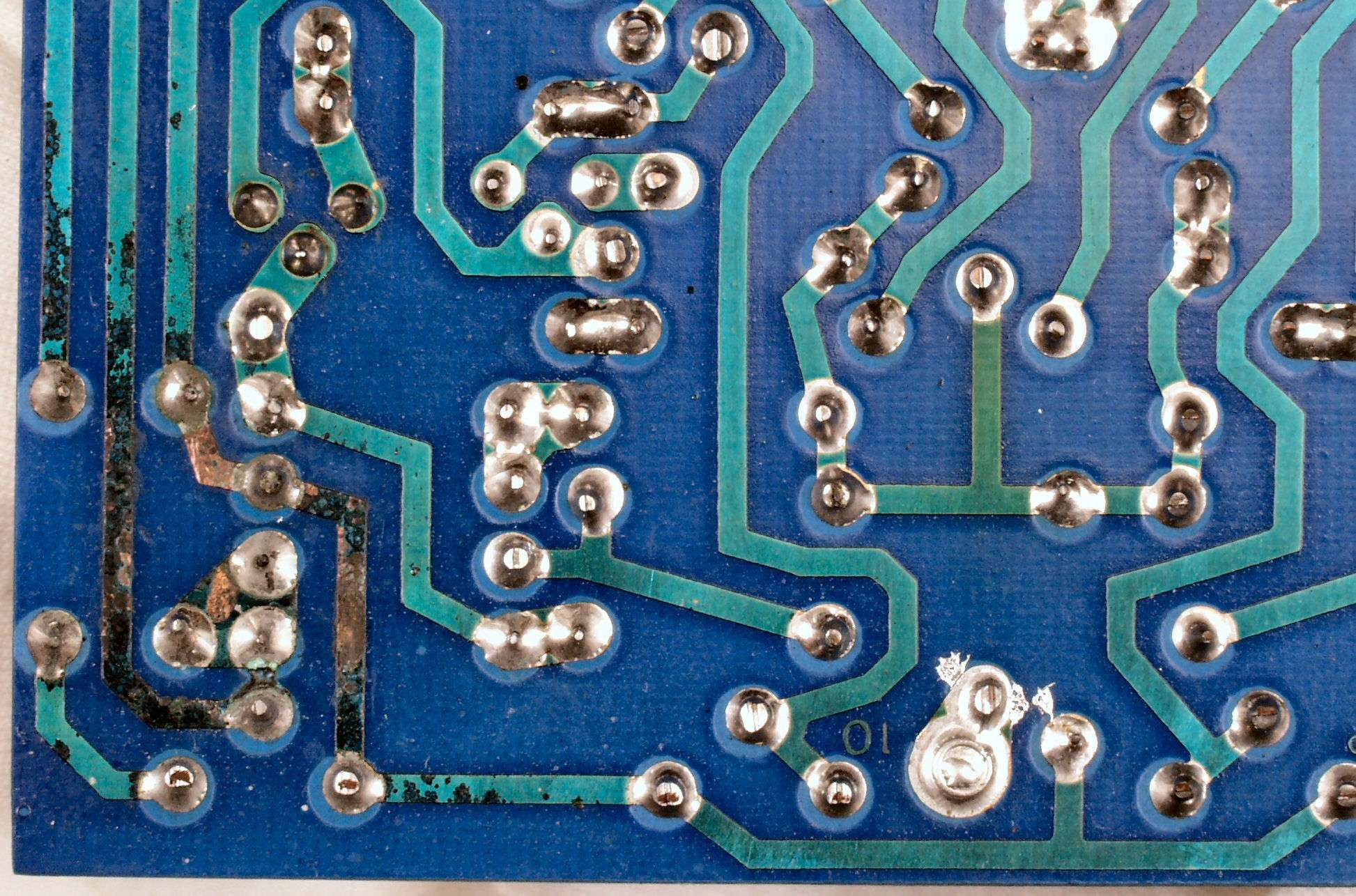 C−4C−1. 修理前  VU基板裏 接点復活剤の使用で腐食した銅箔、右下はは半田屑が付いている