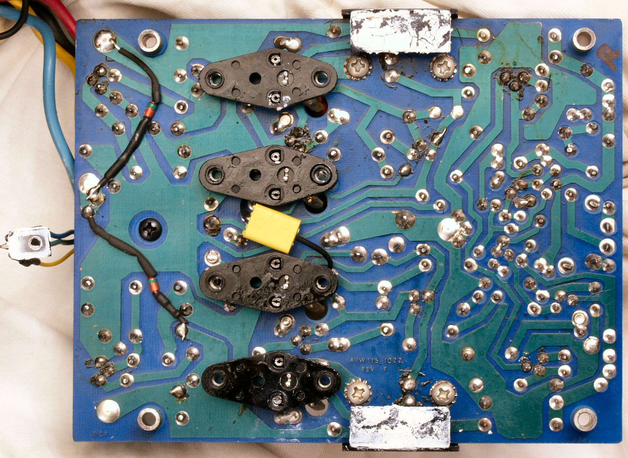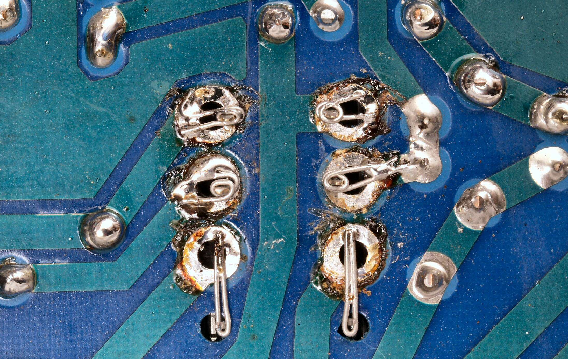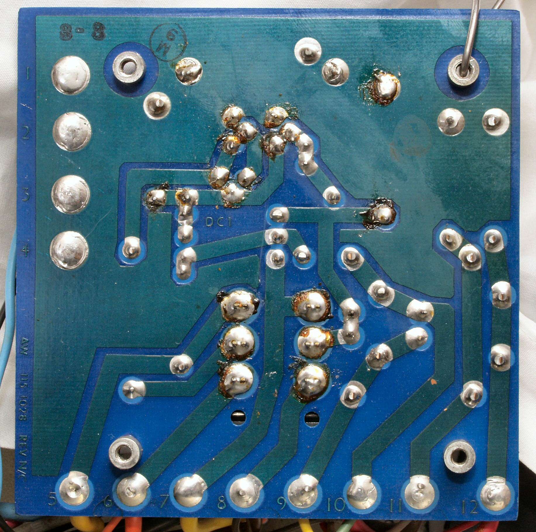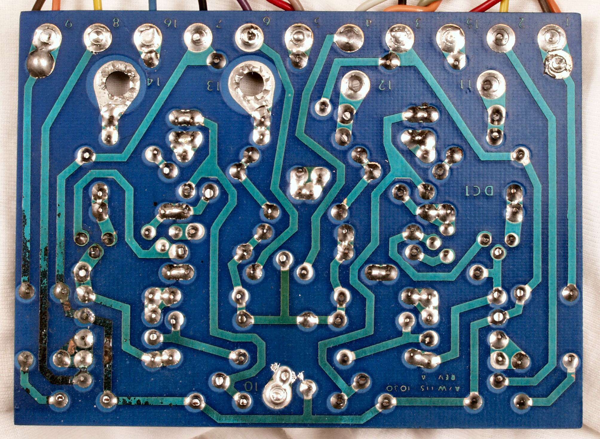C−4C−1. 修理前  VU基板裏 接点復活剤の使用で腐食した銅箔、右下はは半田屑が付いている