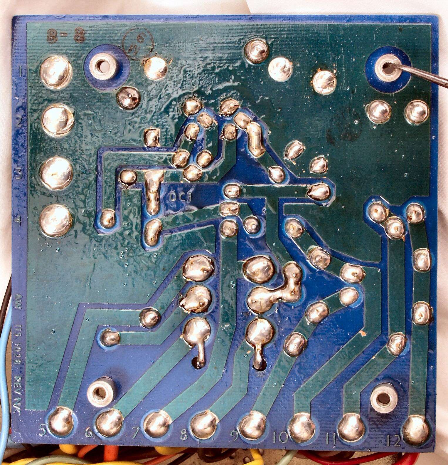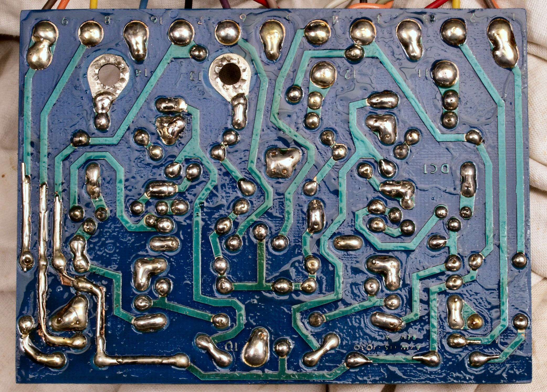 C−4D. 修理(半田補正)後 VU基板裏,、腐食した銅箔はメッキ線で補修する。