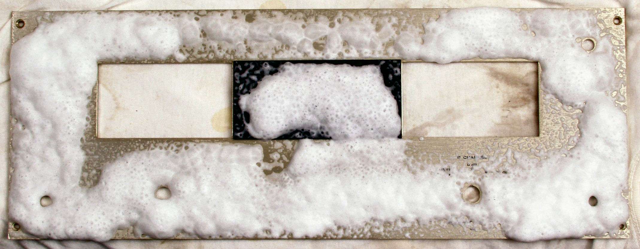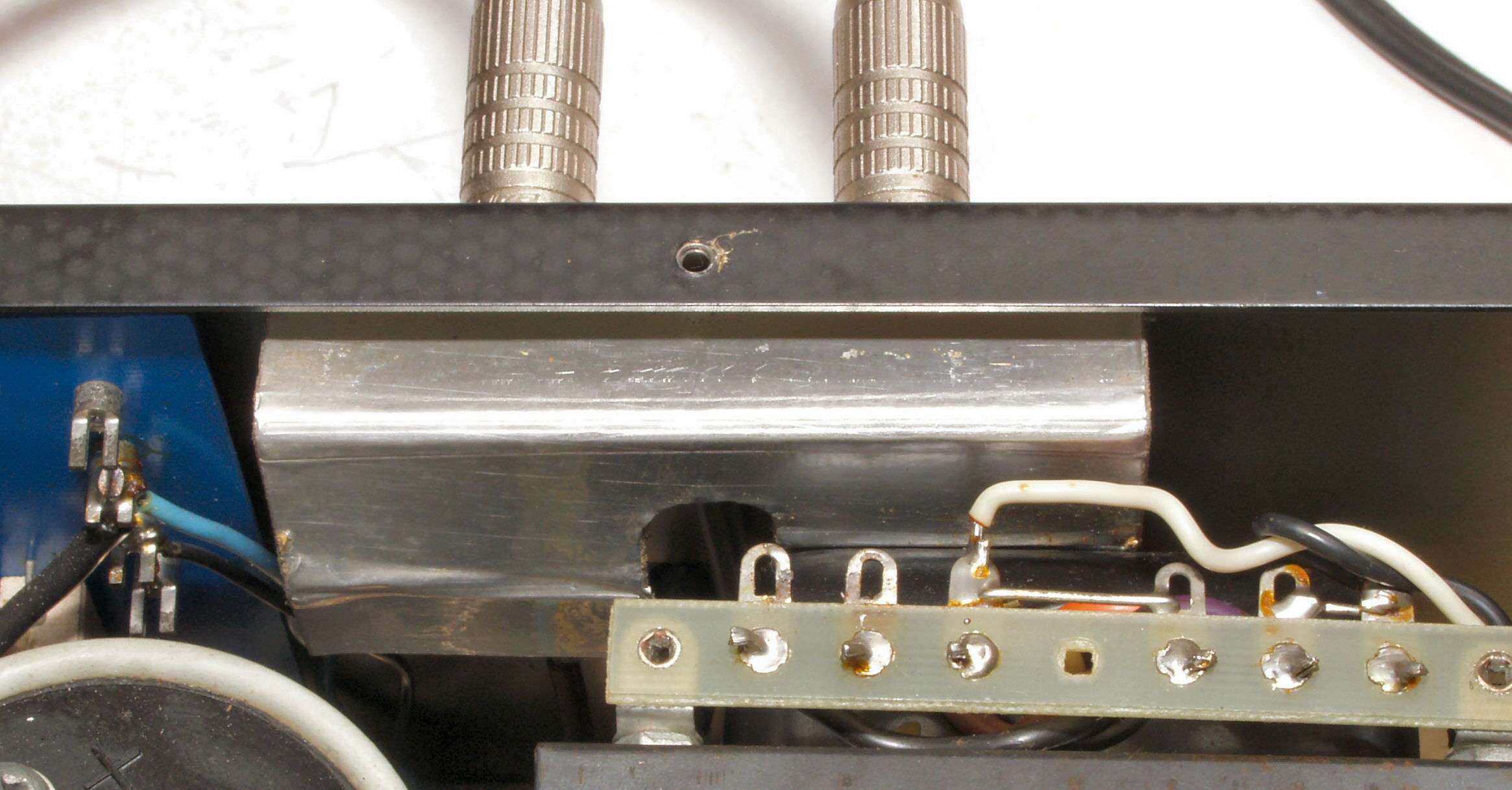 A−7. 点検中  入力RCA端子裏のシールド、紙にアルミホイール貼り。