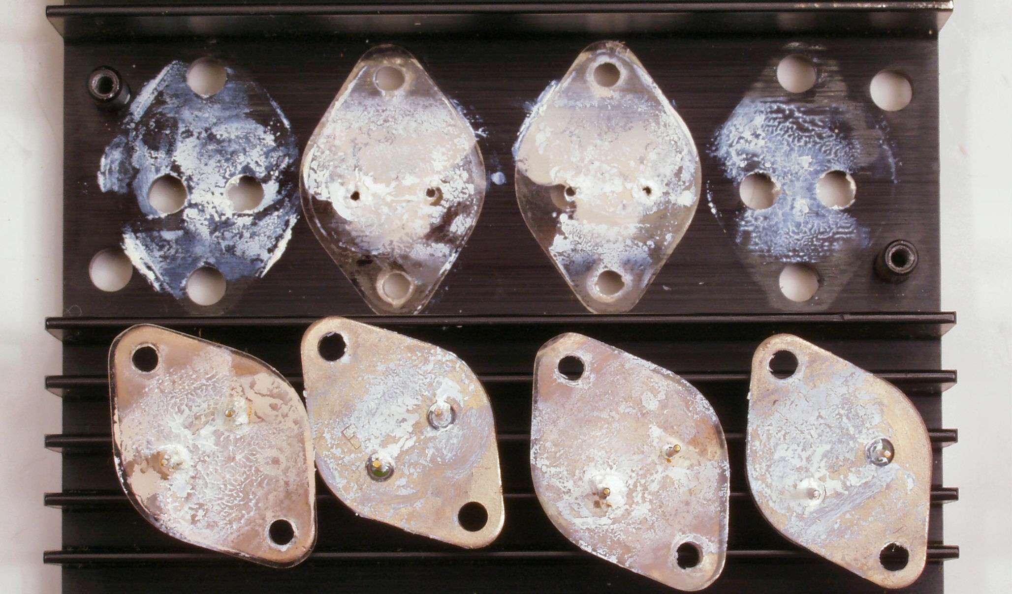 C−2A−1. 修理中  L側終段TR(トランジスター)を外した所、シリコングリスが少ない