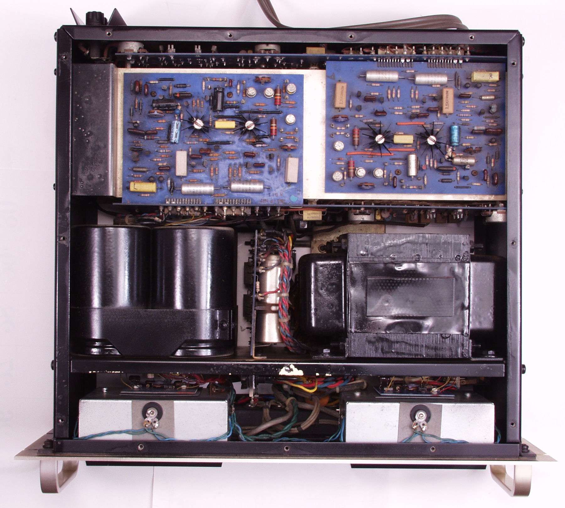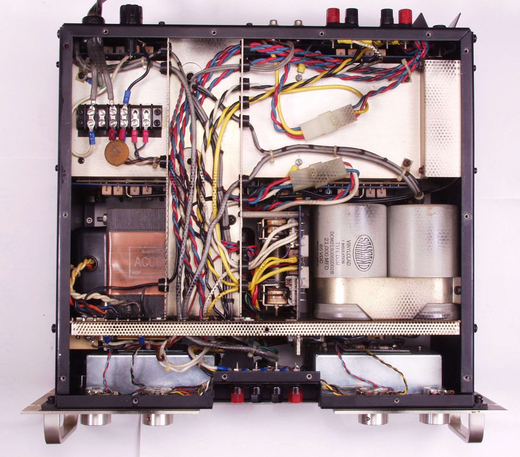 A1. 点検中 上から見る 定格出力250W8Ω/250W8Ω 大きい電解コンデンサー使用、容量は21000μ×4個