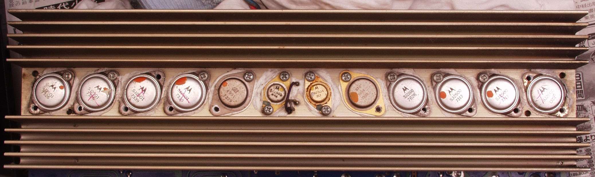 A5. 点検中 L側終段TR(トランジスター)、交換の形跡あり、赤×印の5個が焼損・短絡