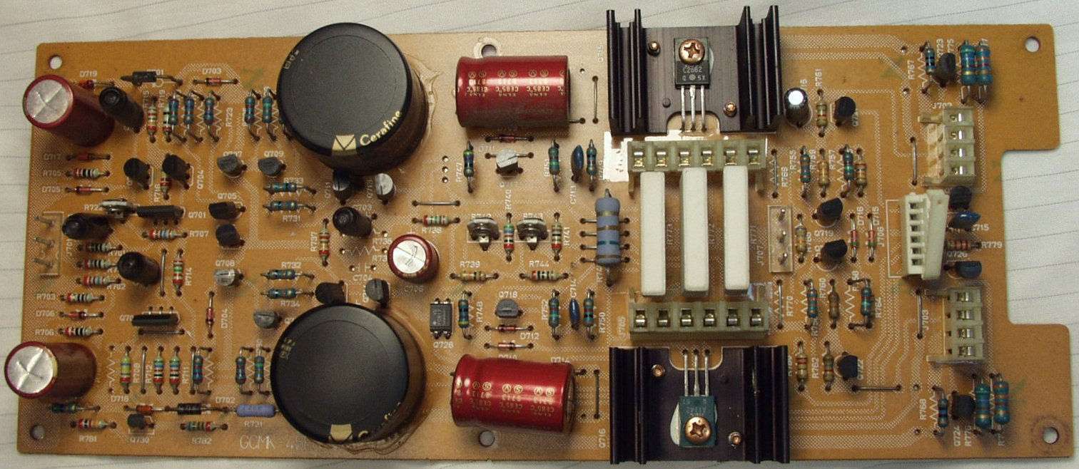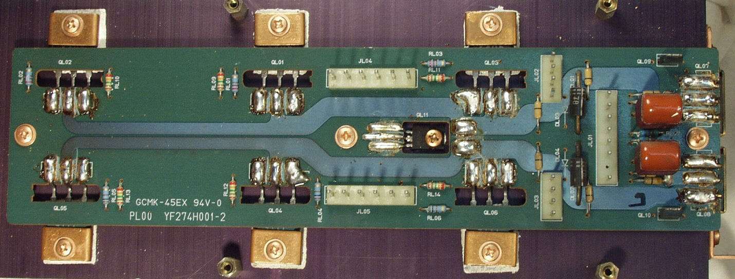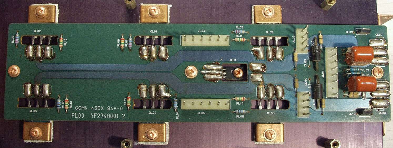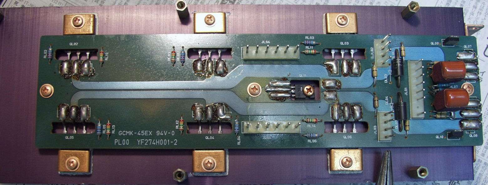 | A−1C. 修理前 ドライブAMP基盤 上の電解コンデンサーが、頭が膨らんで居るのが解ります | ||||||||||||||||||||||||||||||||||||||