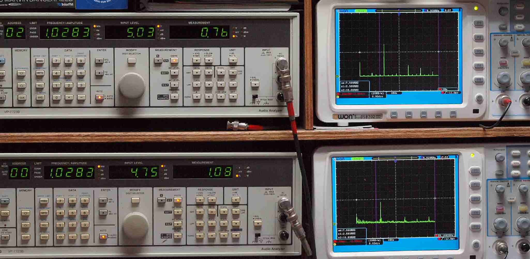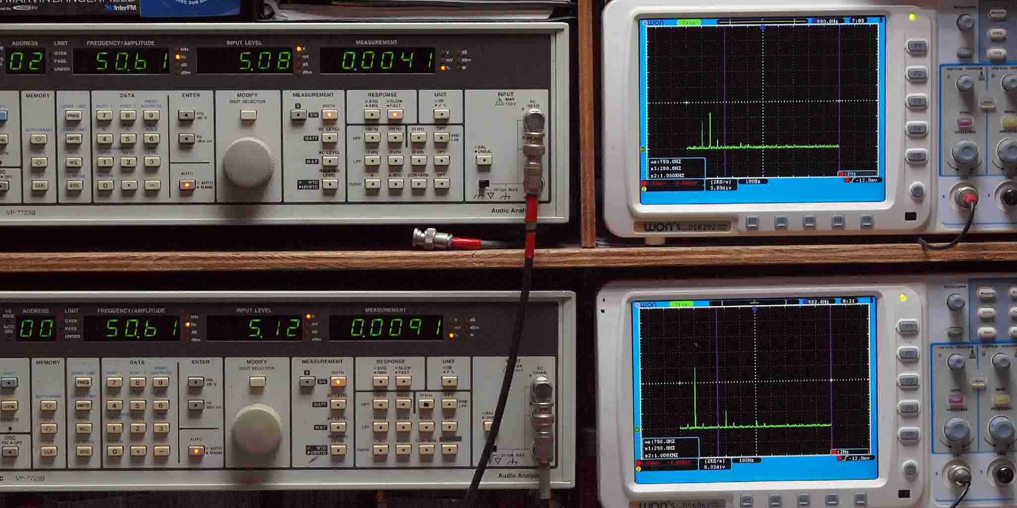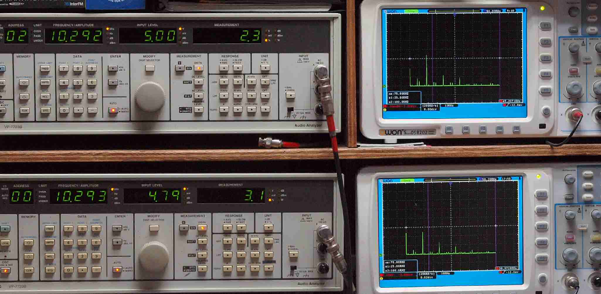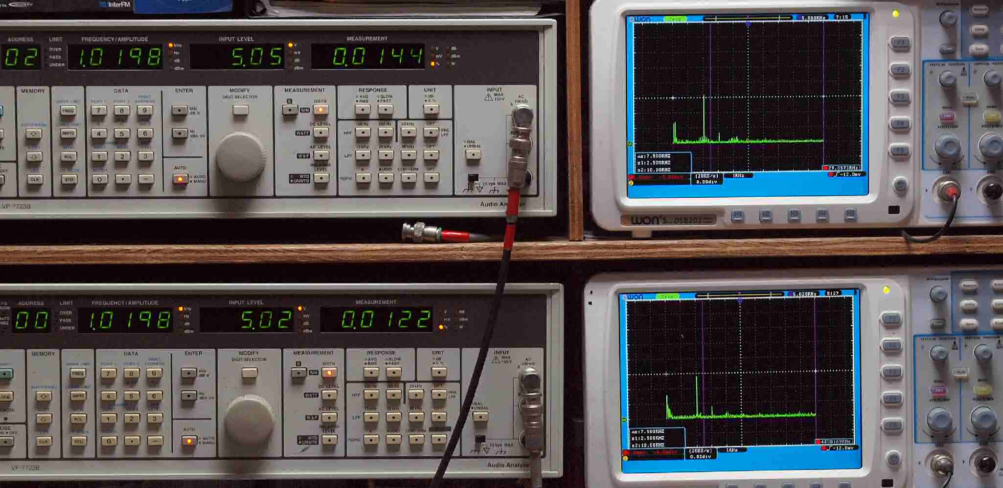 よって、ダイアル設定出力レベルより低くなります。測定機器の仕様や整備の様子はこちら、「VP−7723B」「VP−7201A」。 FFT画面の見方はこちら。
