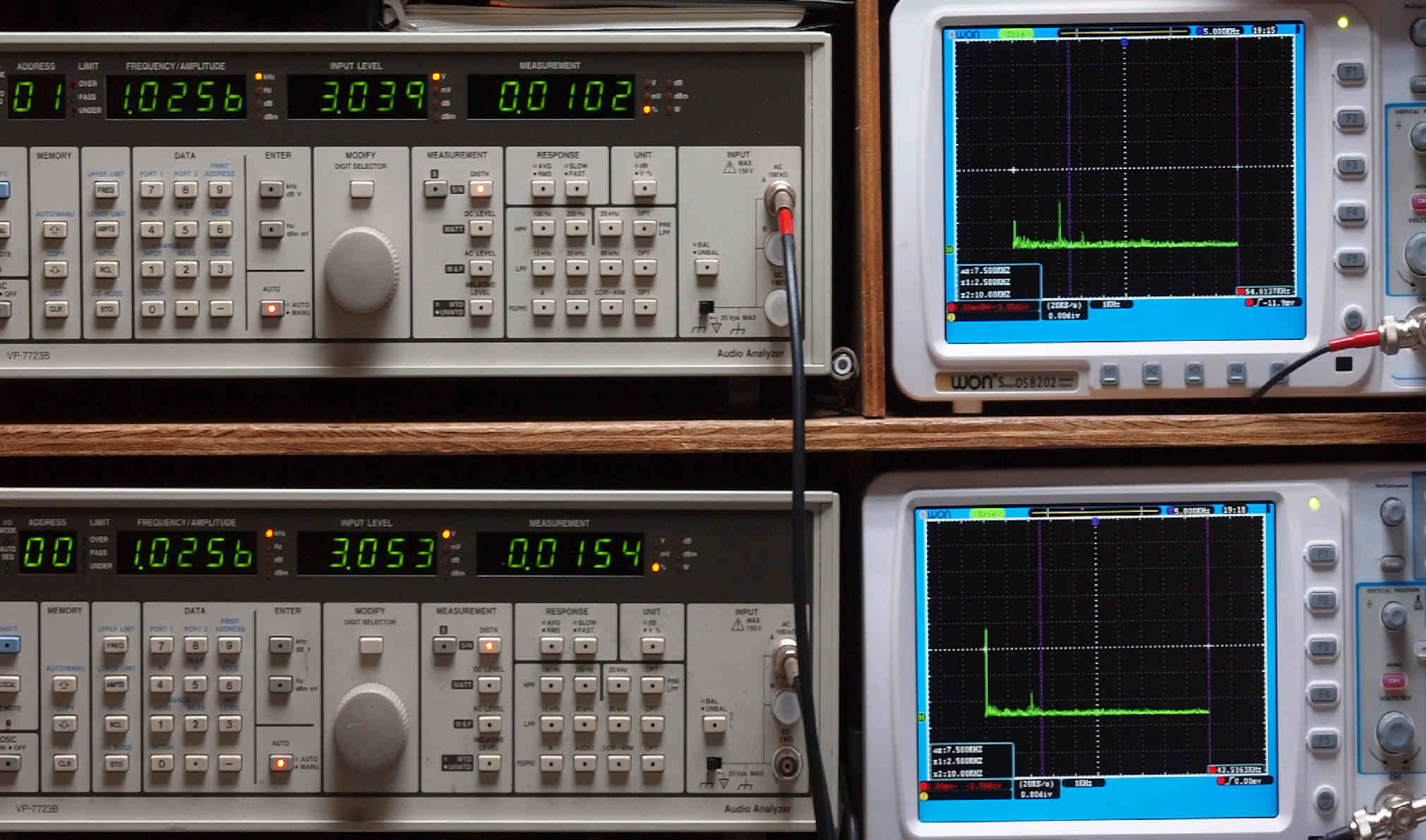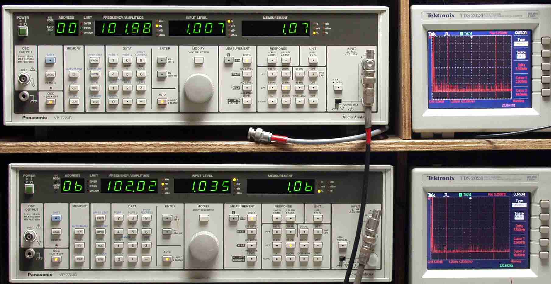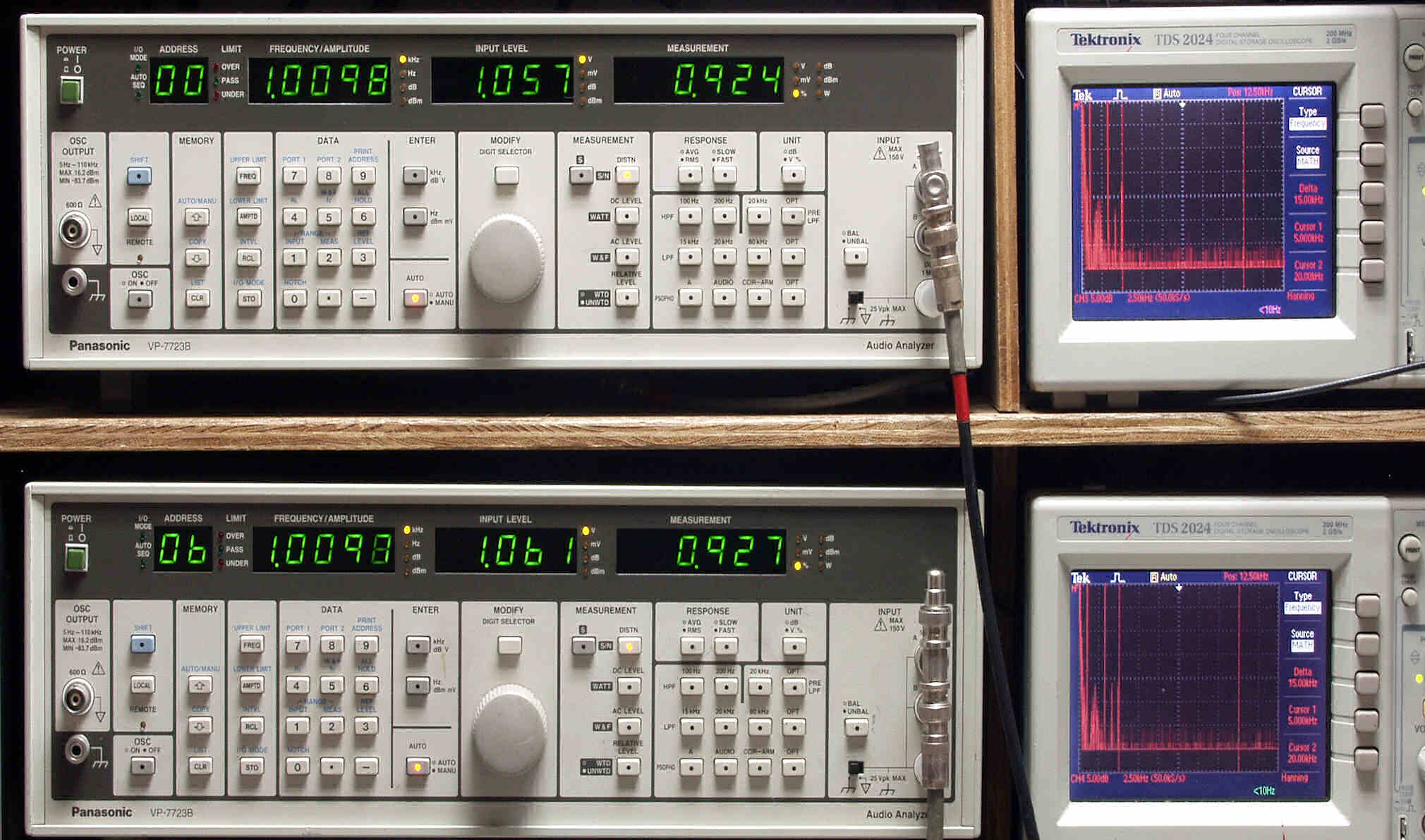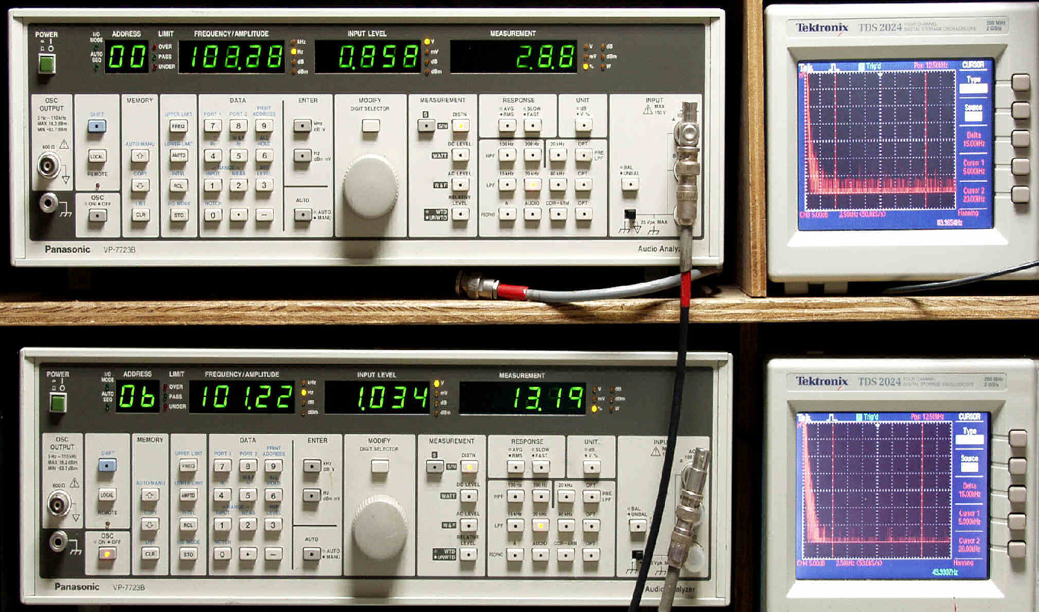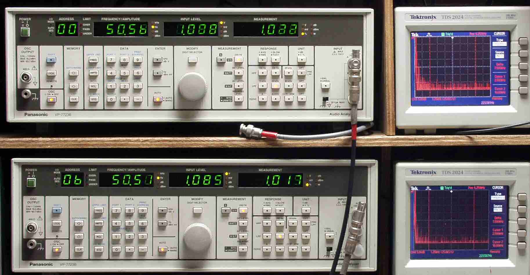 | E. 測定・調整 E1. 出力・歪み率測定・調整 「見方」。 上段中 右側SP出力を「Audio Analyzer Panasonic VP−7723B」により測定。 表示LED、 左端=メモリーNo、 中左=周波数測定、 中右=出力電圧測定、 右端=歪み率測定。 上段右端 VP−7723Bの基本波除去出力を「owon SDS8202(200MHZ)」で「FFT分析」表示。 下段中 左側SP出力を「Audio Analyzer Panasonic VP−7723B」により測定。 表示LED、 左端=メモリーNo、 中左=周波数測定、 中右=出力電圧測定、 右端=歪み率測定。 下段右端 VP−7723Bの基本波除去出力を「owon SDS6062(200MHZ)」で「FFT分析」表示。 下段左端 オーディオ発振器 VP−7201A より50Hz〜100kHzの信号を出し(歪み率=約0.003%)、ATT+分配器を通し、AMPに入力。 よって、ダイアル設定出力レベルより低くなります。測定機器の仕様や整備の様子はこちら、「VP−7723B」「VP−7201A」。 FFT画面の見方はこちら。 |