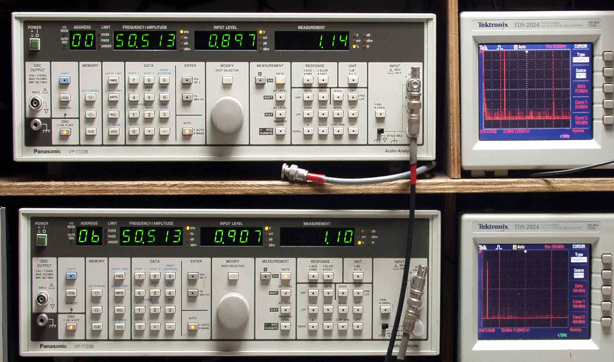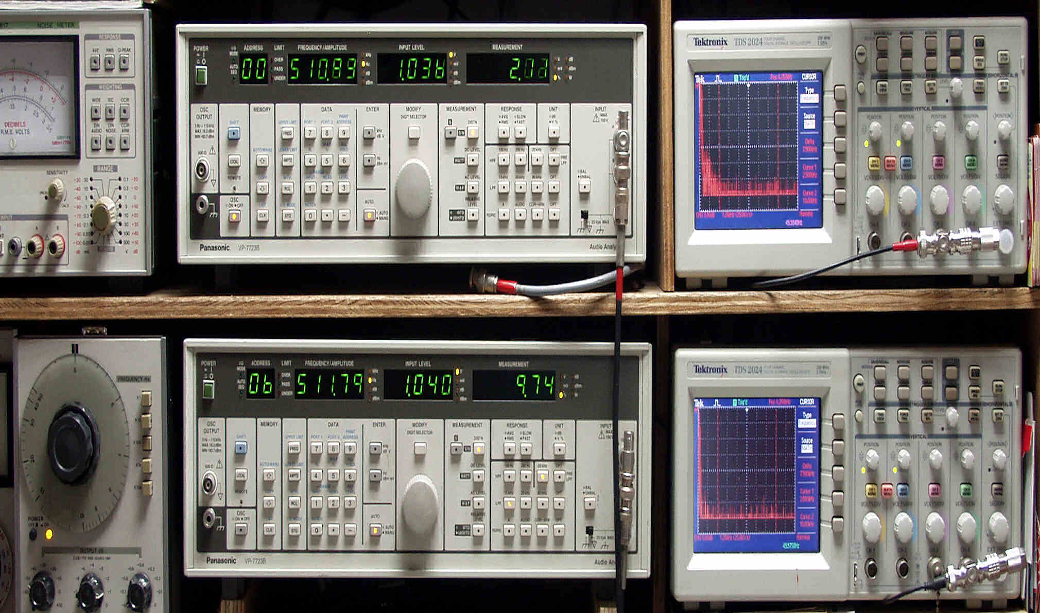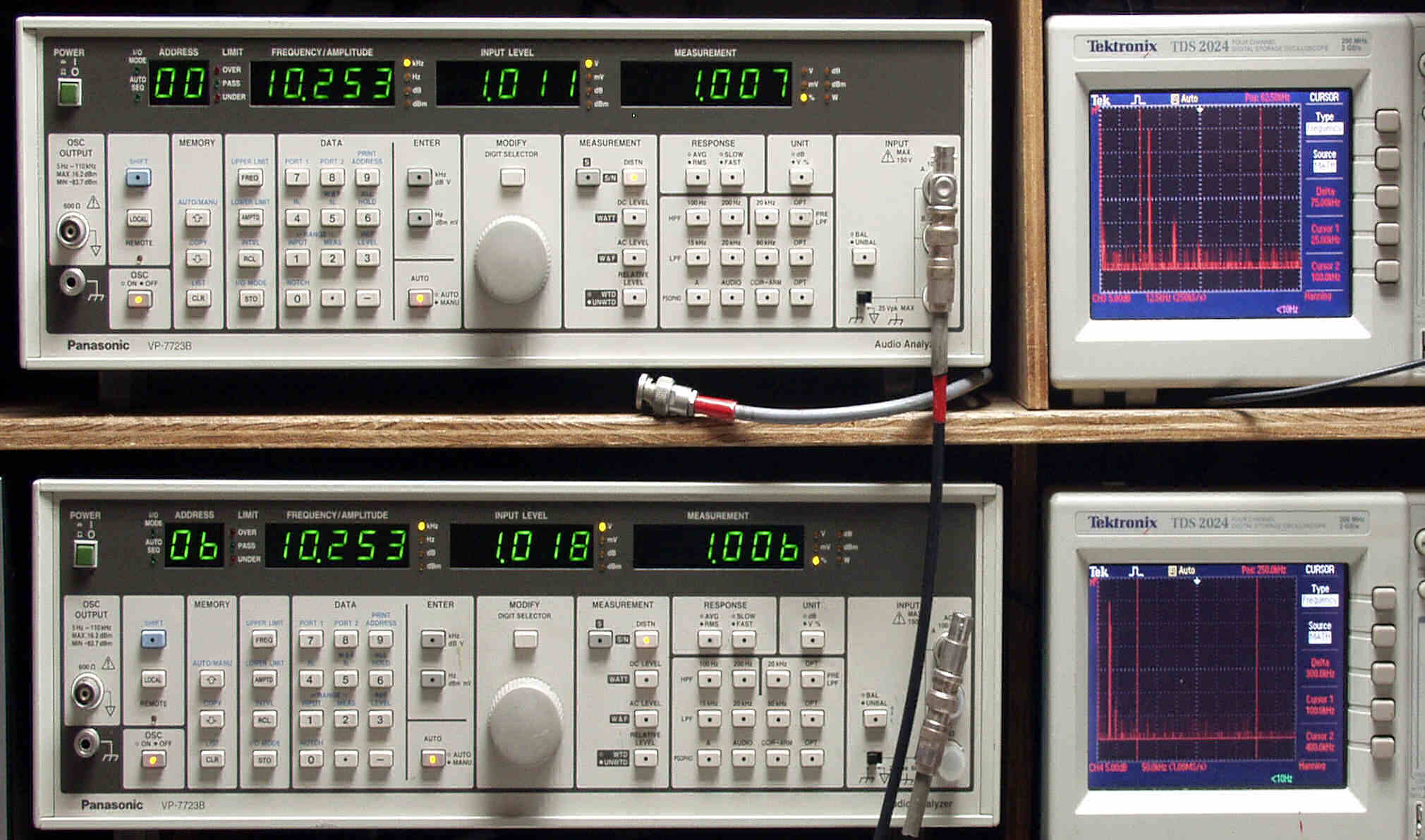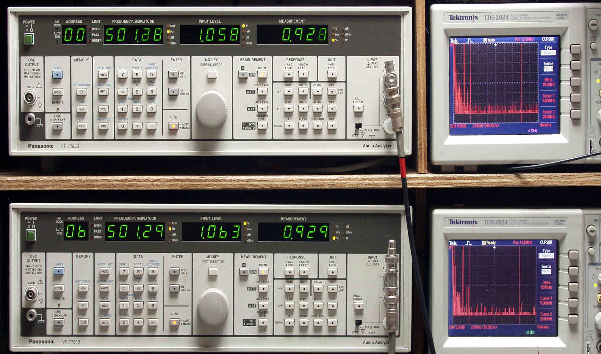 | E. 測定・調整 E1. 出力・歪み率測定・調整 「見方」。 上段中 右側SP出力を「Audio Analyzer Panasonic VP−7723B」により測定。 表示LED、 左端=メモリーNo、 中左=周波数測定、 中右=出力電圧測定、 右端=歪み率測定。 上段右端 VP−7723Bの基本波除去出力を「owon SDS8202(200MHZ)」で「FFT分析」表示。 下段中 左側SP出力を「Audio Analyzer Panasonic VP−7723B」により測定。 表示LED、 左端=メモリーNo、 中左=周波数測定、 中右=出力電圧測定、 右端=歪み率測定。 下段右端 VP−7723Bの基本波除去出力を「owon SDS6062(200MHZ)」で「FFT分析」表示。 下段左端 オーディオ発振器 VP−7201A より50Hz〜100kHzの信号を出し(歪み率=約0.003%)、ATT+分配器を通し、AMPに入力。 よって、ダイアル設定出力レベルより低くなります。測定機器の仕様や整備の様子はこちら、「VP−7723B」「VP−7201A」。 FFT画面の見方はこちら。 |
