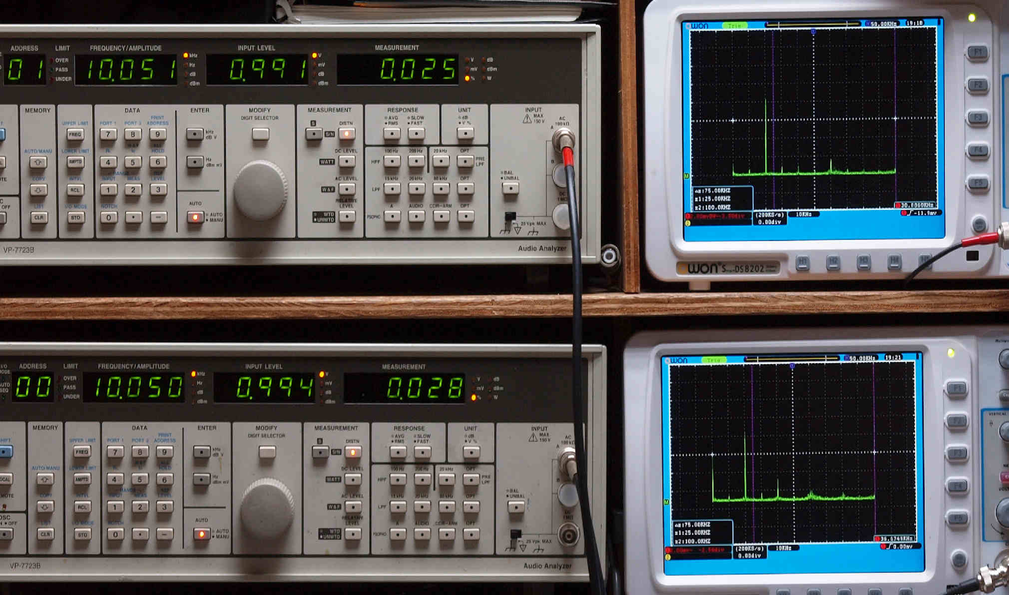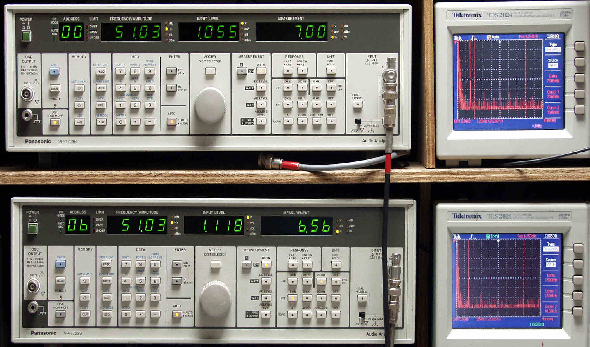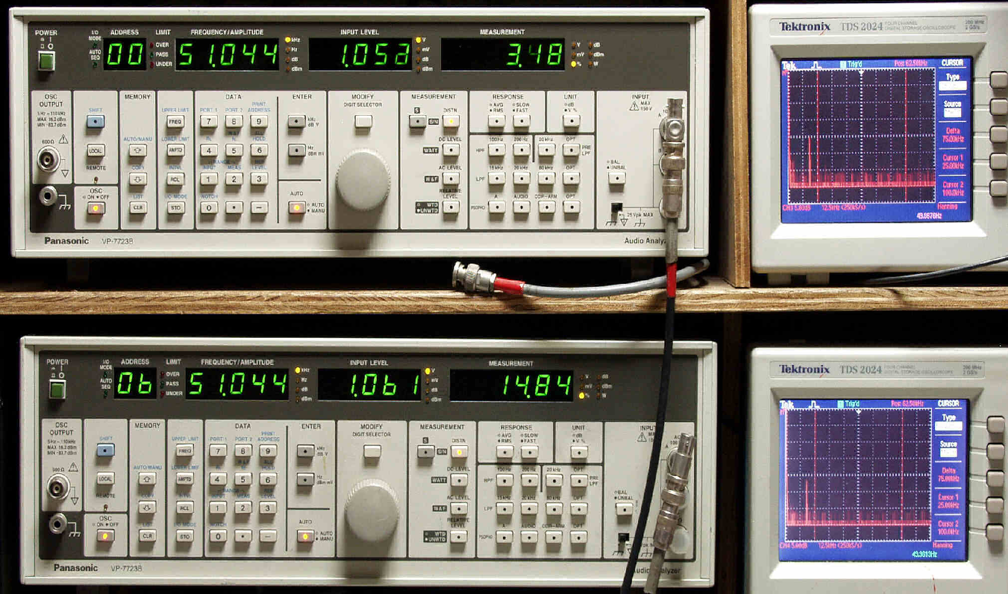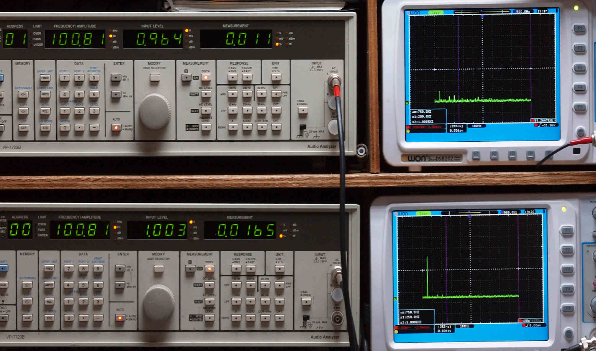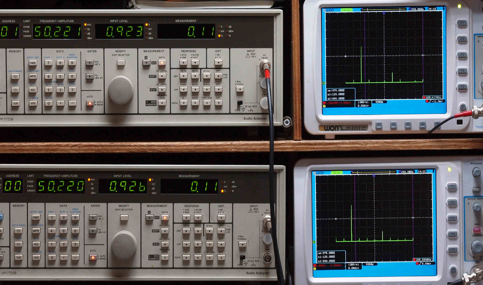 | E. 測定・調整 E1. 出力・歪み率測定・調整 「見方」。 上段中 右側SP出力を「Audio Analyzer Panasonic VP−7723B」により測定。 表示LED、 左端=メモリーNo、 中左=周波数測定、 中右=出力電圧測定、 右端=歪み率測定。 上段右端 VP−7723Bの基本波除去出力を「owon SDS8202(200MHZ)」で「FFT分析」表示。 下段中 左側SP出力を「Audio Analyzer Panasonic VP−7723B」により測定。 表示LED、 左端=メモリーNo、 中左=周波数測定、 中右=出力電圧測定、 右端=歪み率測定。 下段右端 VP−7723Bの基本波除去出力を「owon SDS6062(200MHZ)」で「FFT分析」表示。 下段左端 オーディオ発振器 VP−7201A より50Hz〜100kHzの信号を出し(歪み率=約0.003%)、ATT+分配器を通し、AMPに入力。 よって、ダイアル設定出力レベルより低くなります。測定機器の仕様や整備の様子はこちら、「VP−7723B」「VP−7201A」。 FFT画面の見方はこちら。 |