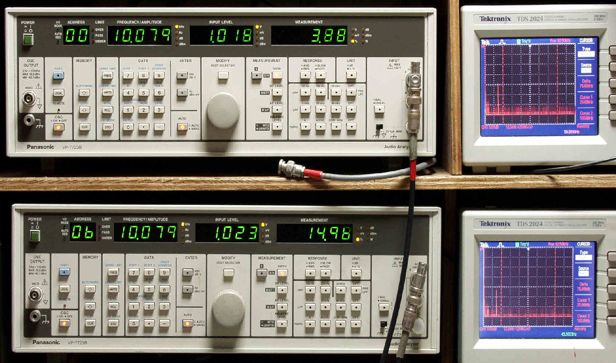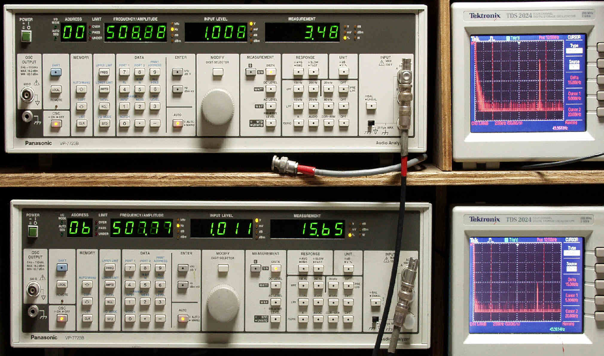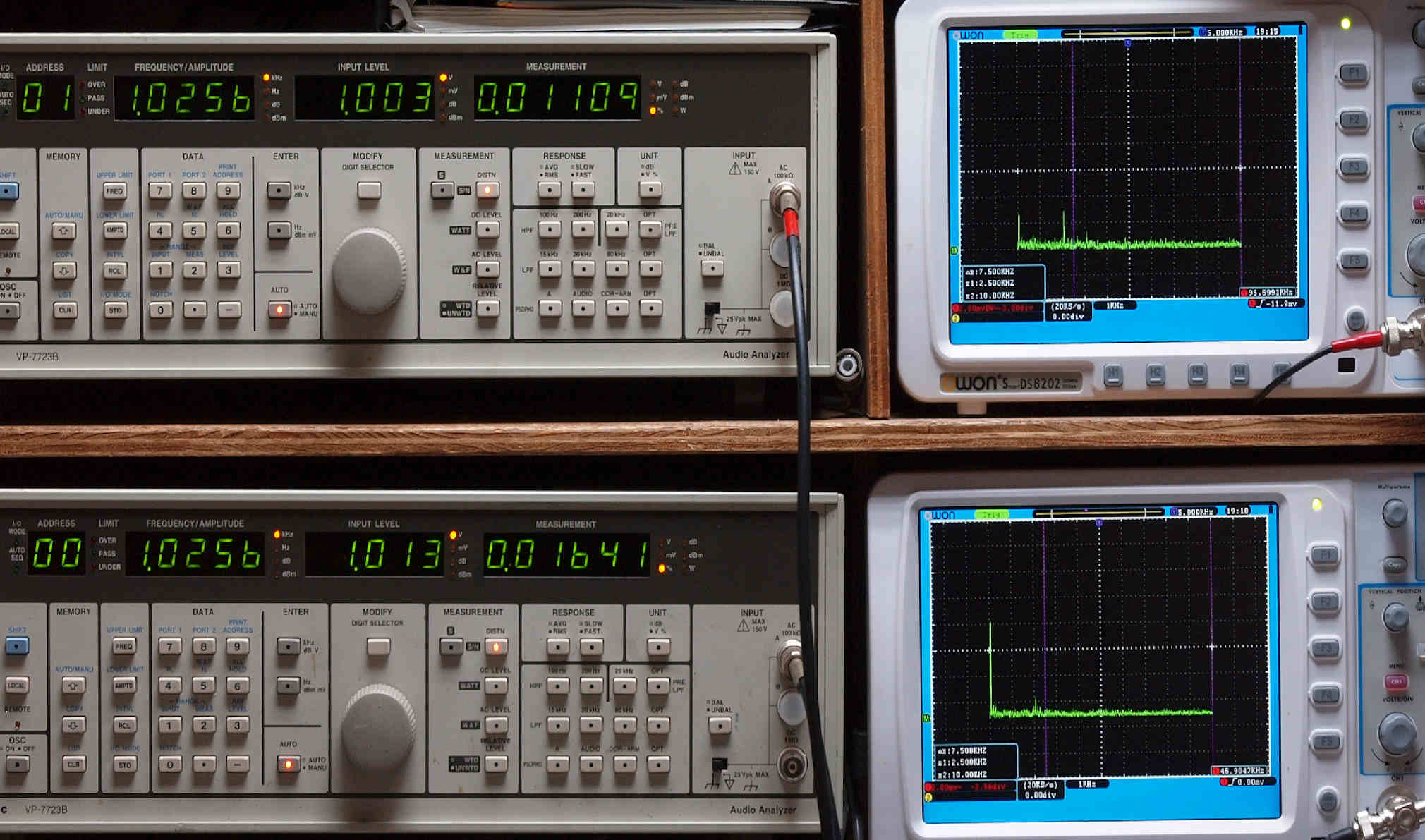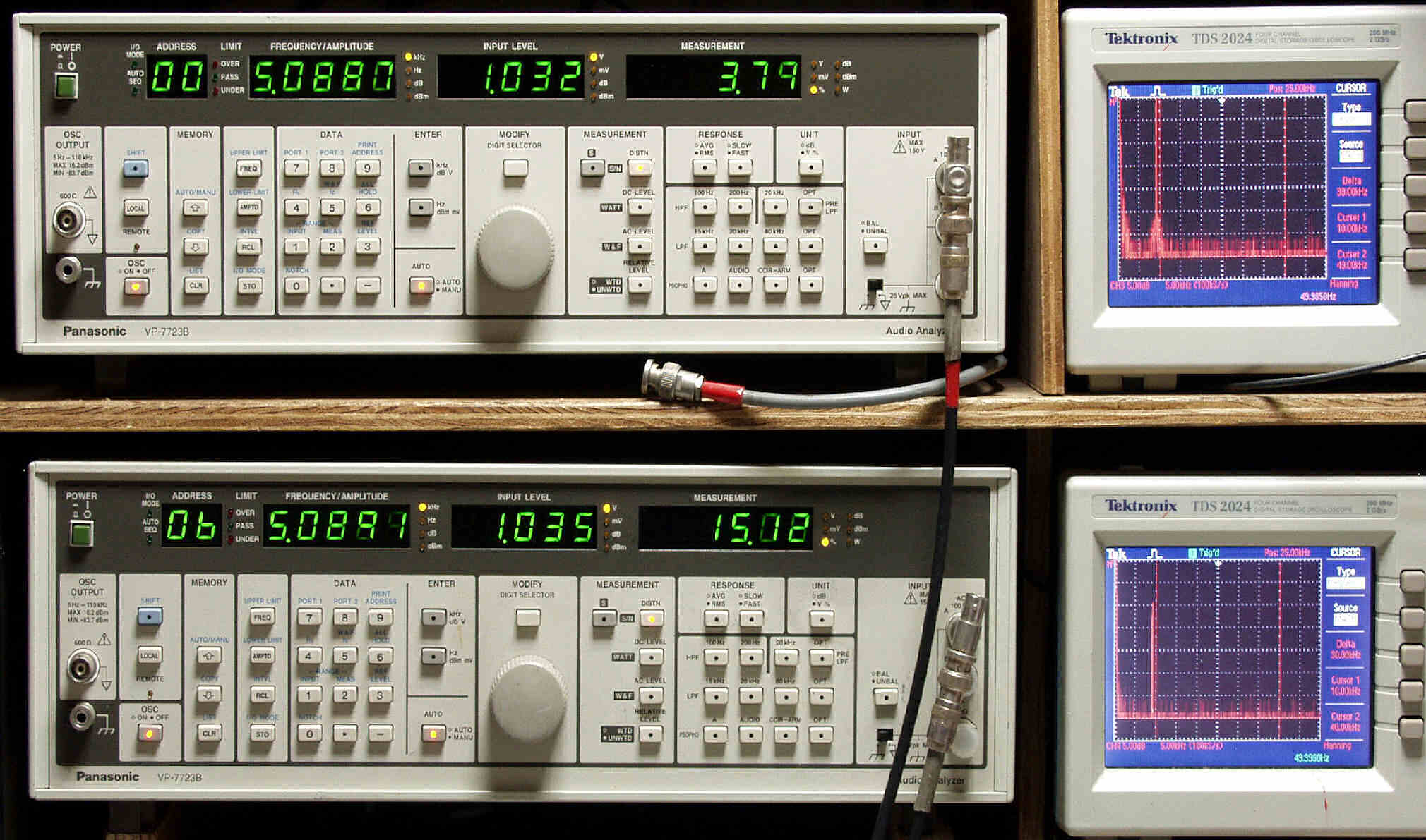| E. 測定・調整 E1. 出力・歪み率測定・調整 「見方」。 上段中 右側SP出力を「Audio Analyzer Panasonic VP−7723B」により測定。 表示LED、 左端=メモリーNo、 中左=周波数測定、 中右=出力電圧測定、 右端=歪み率測定。 上段右端 VP−7723Bの基本波除去出力を「owon SDS8202(200MHZ)」で「FFT分析」表示。 下段中 左側SP出力を「Audio Analyzer Panasonic VP−7723B」により測定。 表示LED、 左端=メモリーNo、 中左=周波数測定、 中右=出力電圧測定、 右端=歪み率測定。 下段右端 VP−7723Bの基本波除去出力を「owon SDS6062(200MHZ)」で「FFT分析」表示。 下段左端 オーディオ発振器 VP−7201A より50Hz〜100kHzの信号を出し(歪み率=約0.003%)、ATT+分配器を通し、AMPに入力。 よって、ダイアル設定出力レベルより低くなります。測定機器の仕様や整備の様子はこちら、「VP−7723B」「VP−7201A」。 FFT画面の見方はこちら。 |