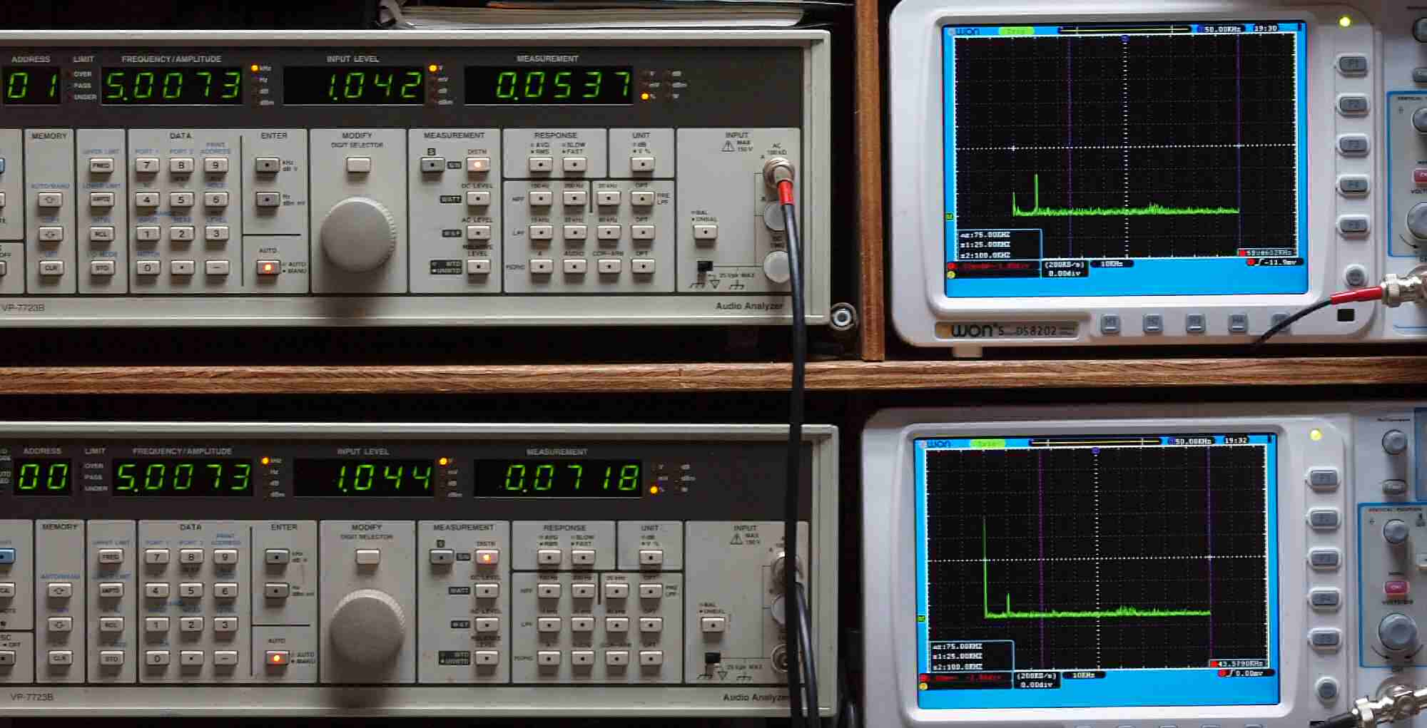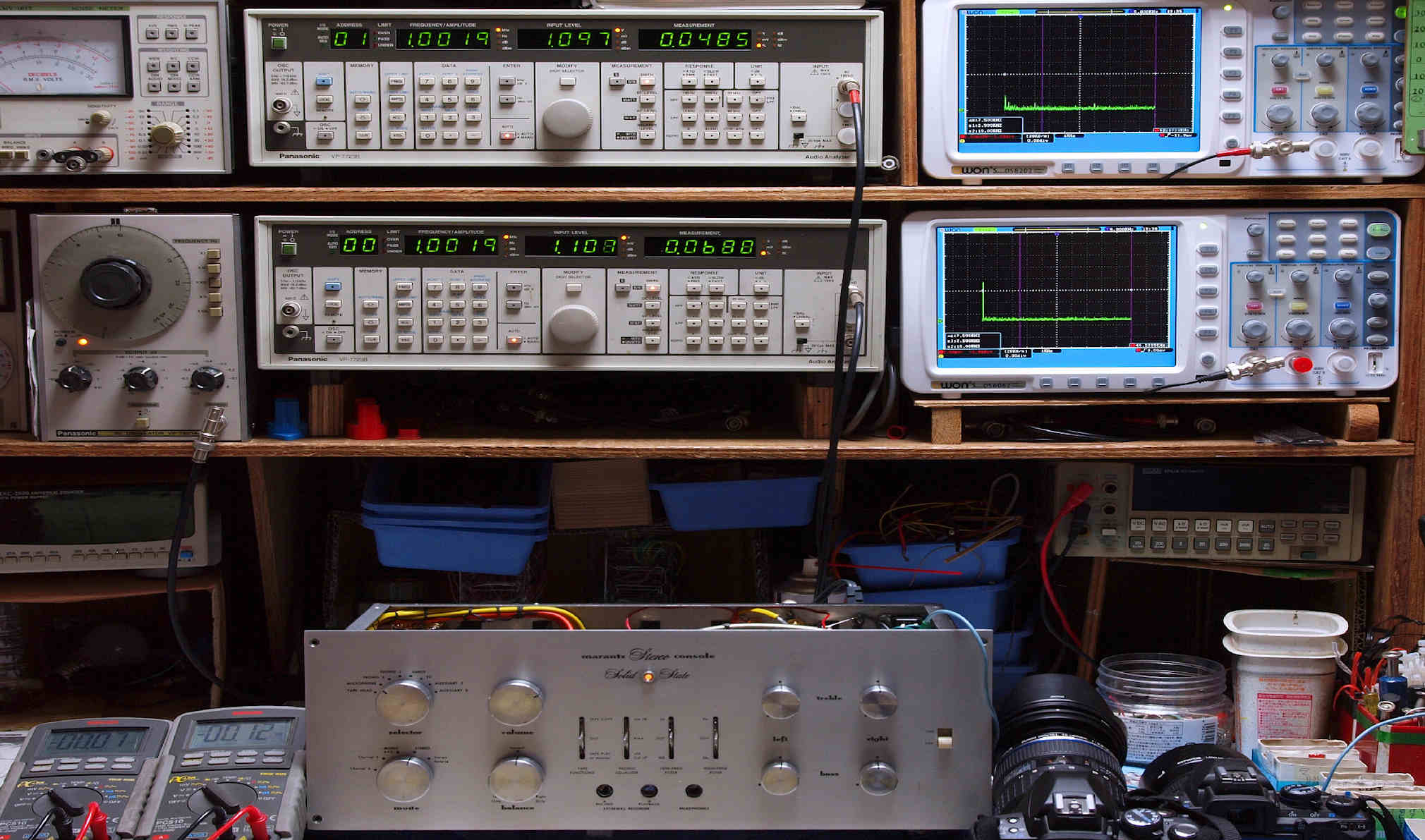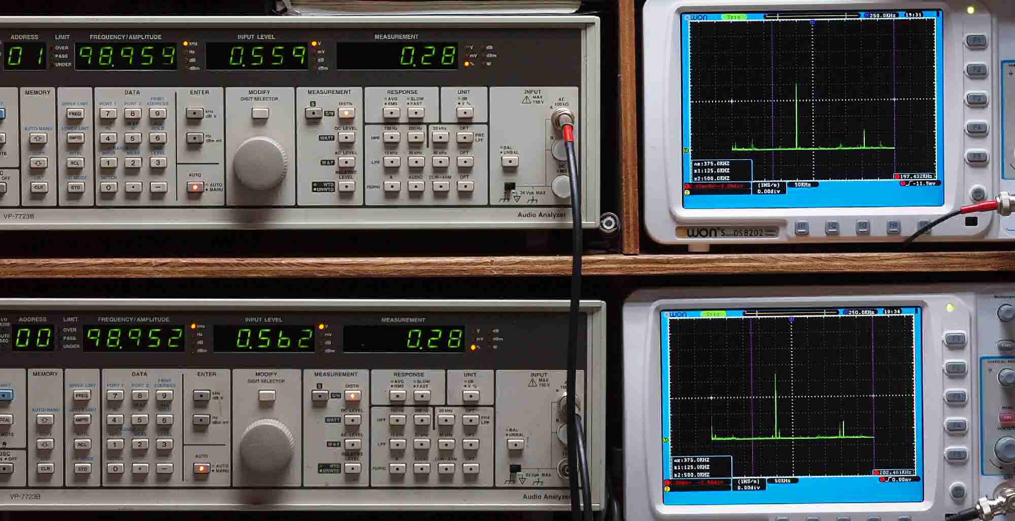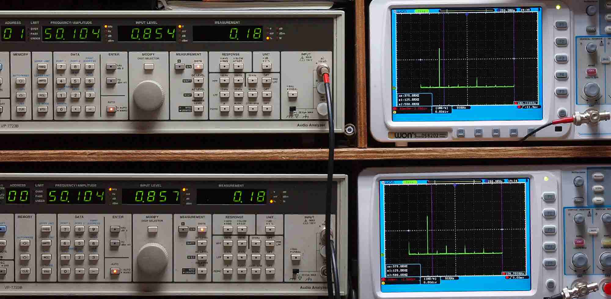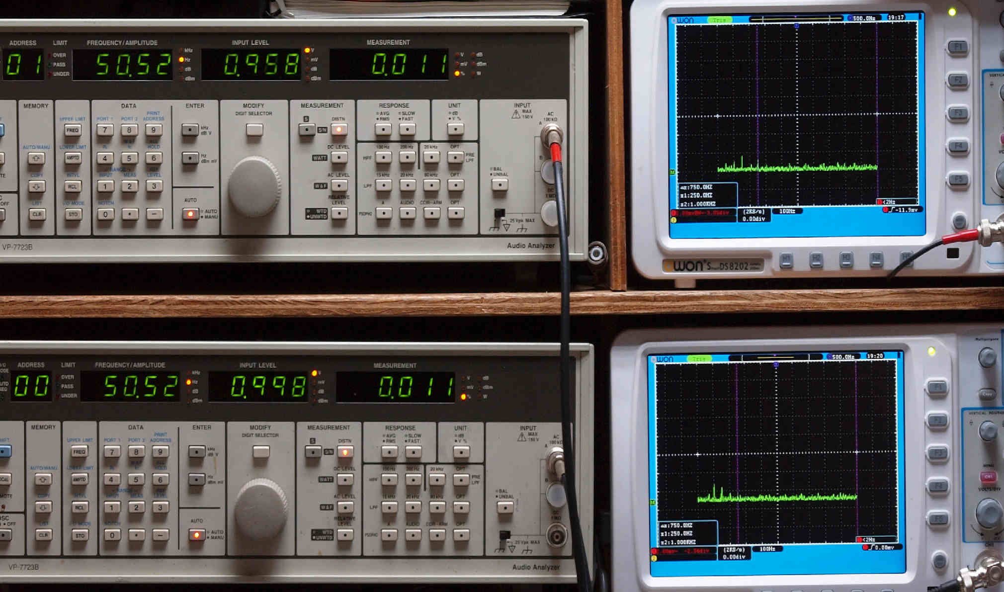 | E. 測定・調整 E1. 出力・歪み率測定・調整 「見方」。 上段中 右側SP出力を「Audio Analyzer Panasonic VP−7723B」により測定。 表示LED、 左端=メモリーNo、 中左=周波数測定、 中右=出力電圧測定、 右端=歪み率測定。 上段右端 VP−7723Bの基本波除去出力を「owon SDS8202(200MHZ)」で「FFT分析」表示。 下段中 左側SP出力を「Audio Analyzer Panasonic VP−7723B」により測定。 表示LED、 左端=メモリーNo、 中左=周波数測定、 中右=出力電圧測定、 右端=歪み率測定。 下段右端 VP−7723Bの基本波除去出力を「owon SDS6062(200MHZ)」で「FFT分析」表示。 下段左端 オーディオ発振器 VP−7201A より50Hz〜100kHzの信号を出し(歪み率=約0.003%)、ATT+分配器を通し、AMPに入力。 よって、ダイアル設定出力レベルより低くなります。測定機器の仕様や整備の様子はこちら、「VP−7723B」「VP−7201A」。 FFT画面の見方はこちら。 |