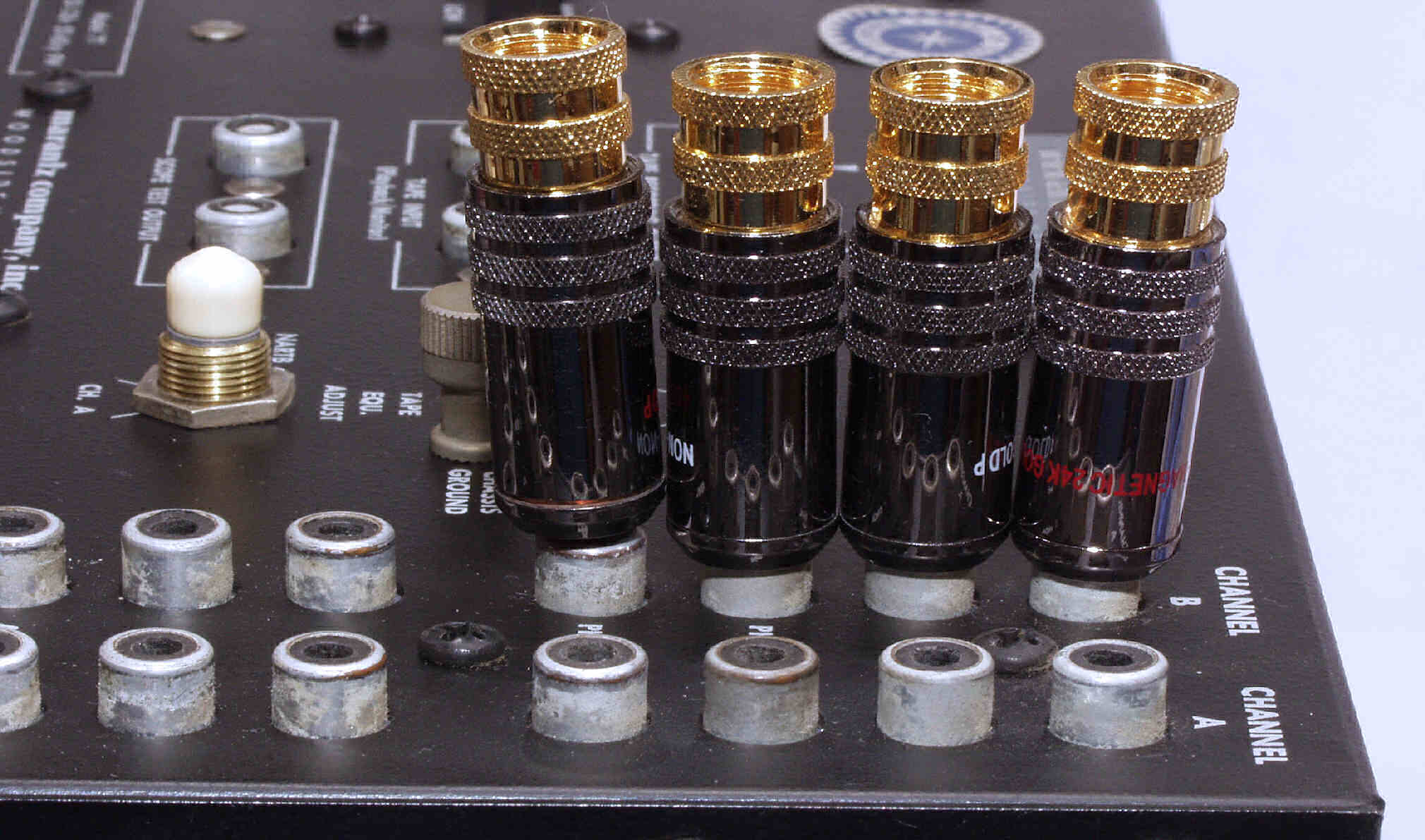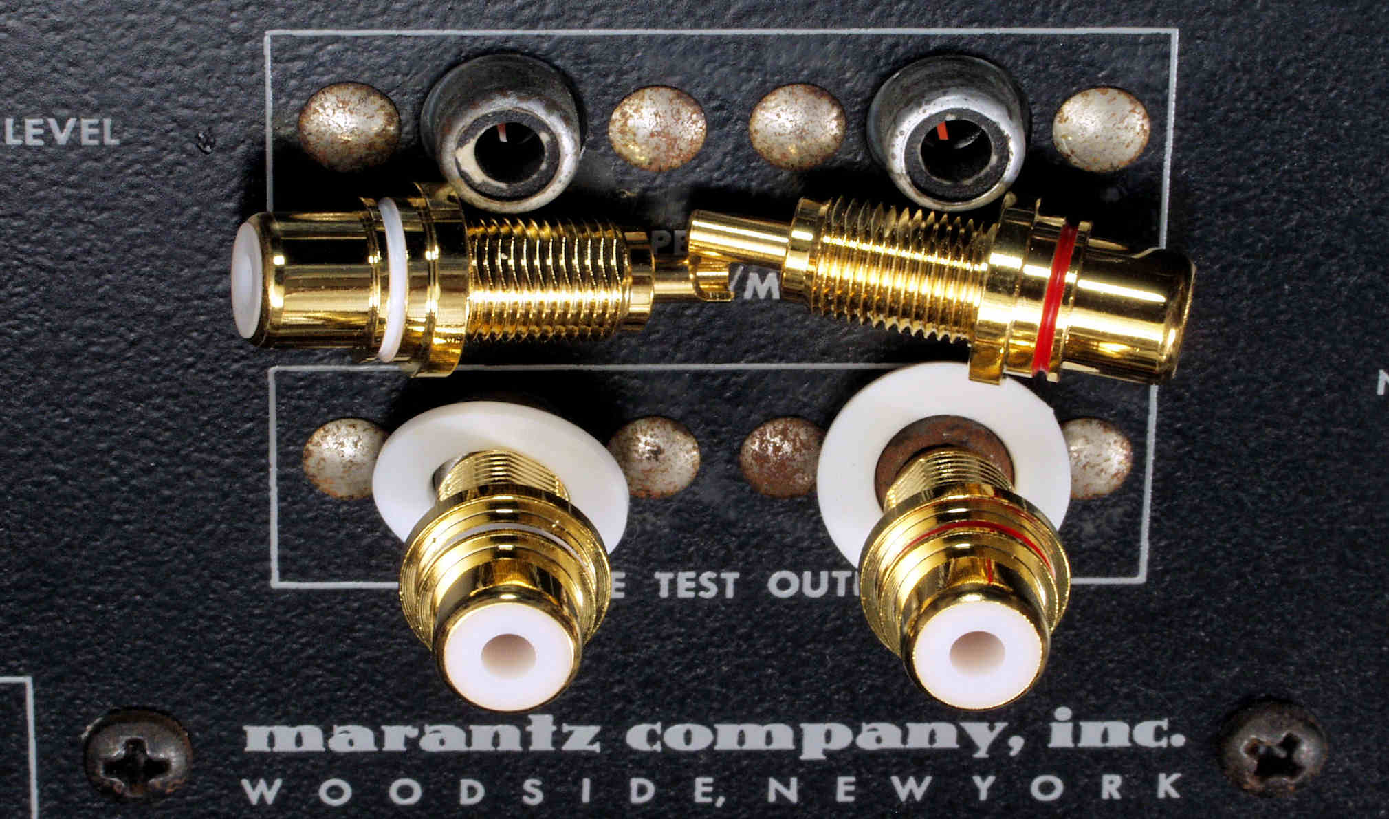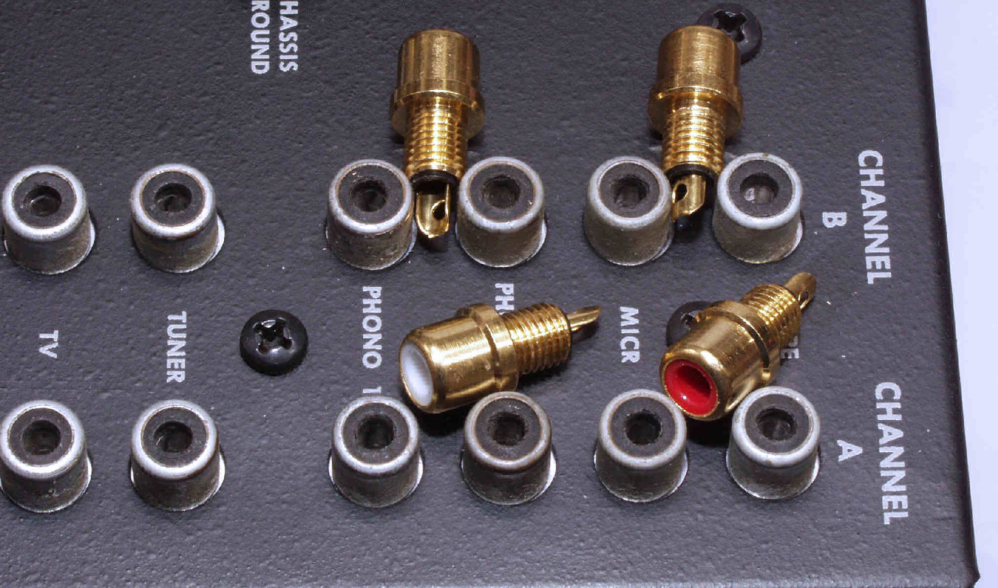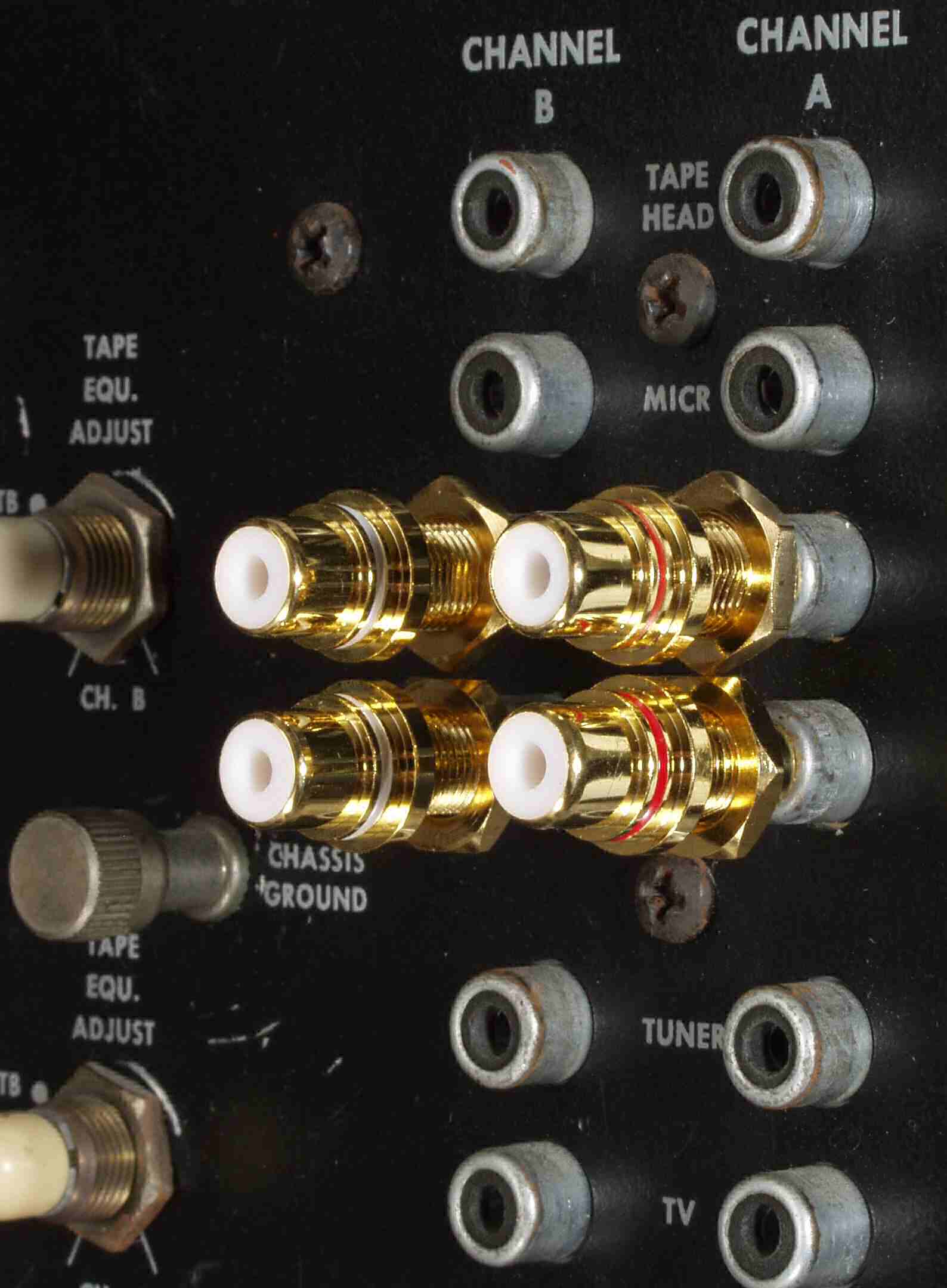 | A73. 点検中 TAPE入出力RCA端子郡、RL出力RCA端子郡、センター出力RCA端子郡。 テフロン絶縁仕様に交換可能。 |