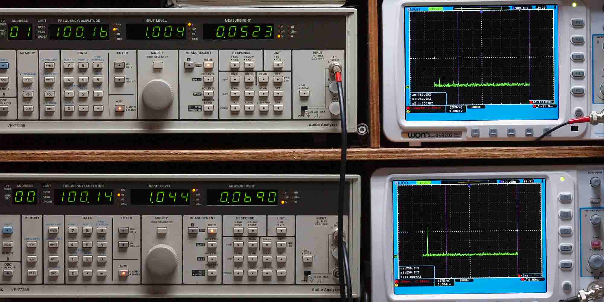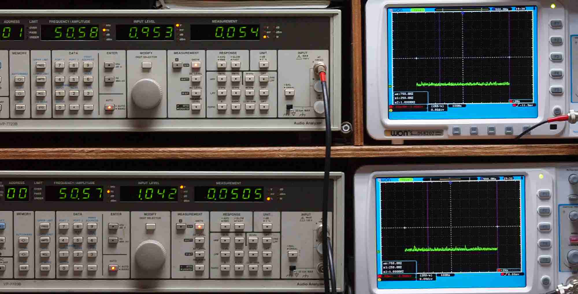 | F. 上位測定器による 調整・測定 F1. 下のオーディオアナライザー VP−7732Aで自動測定。 |
