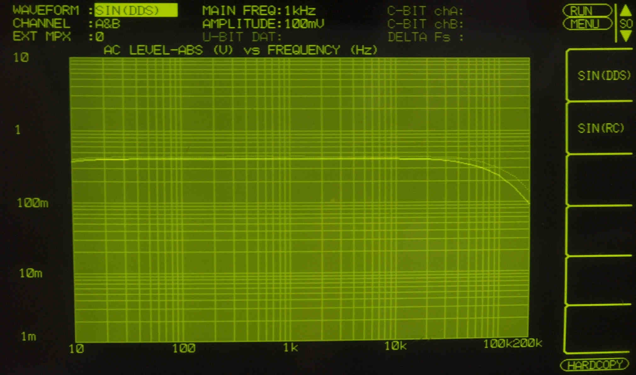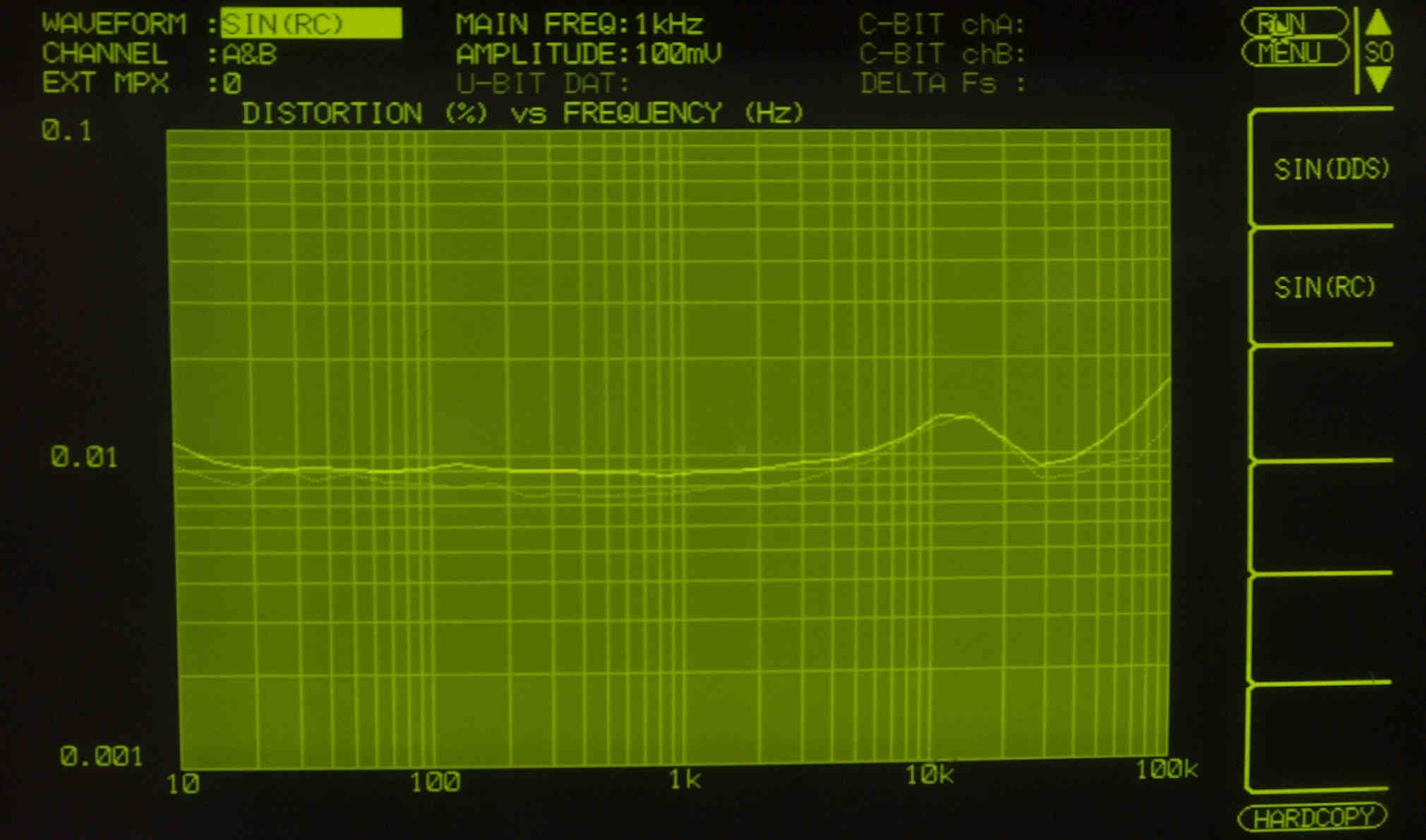 | T26. R側出力電圧=1V、 1.0%歪み。 AUX、10KHz入力。 オシロの左カーソル=25KHZ、 右カーソル=100KHZ。 L側出力電圧=1V、 1.0%歪み。 AUX、10KHz入力。 オシロの左カーソル=25KHZ、 右カーソル=100KHZ。 |