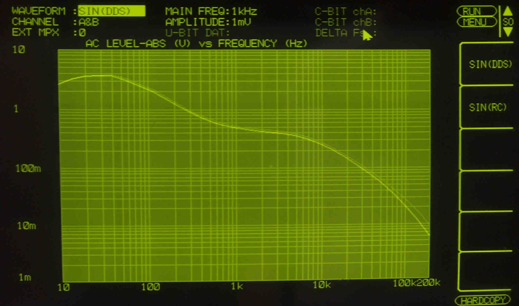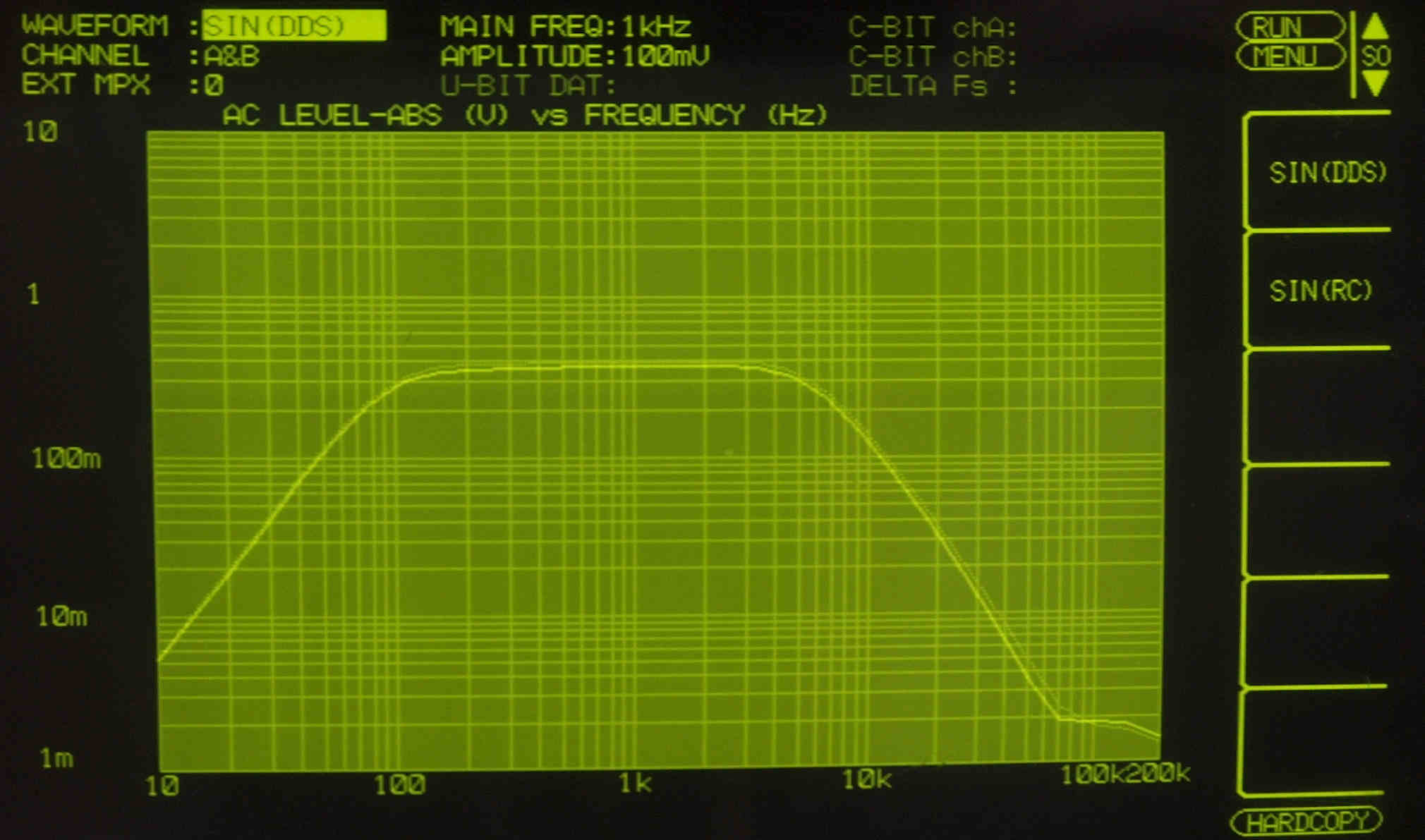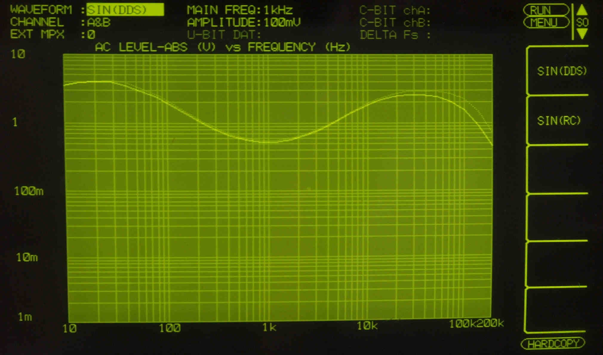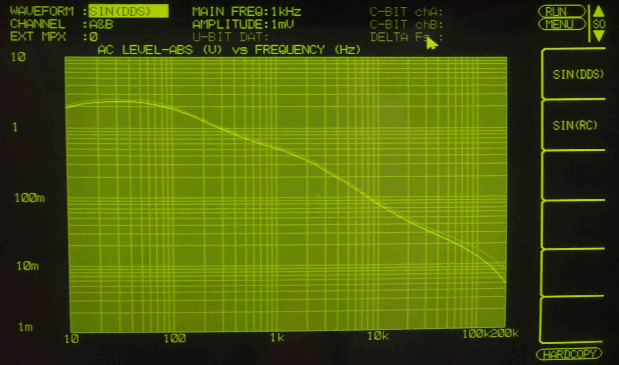 | T34. R側出力電圧=1V、 3.4%歪み。 MM、1KHz入力。 オシロの左カーソル=5KHZ、 右カーソル=20KHZ。 L側出力電圧=1V、 16%歪み。 MM、1KHz入力。 オシロの左カーソル=5KHZ、 右カーソル=20KHZ。 |