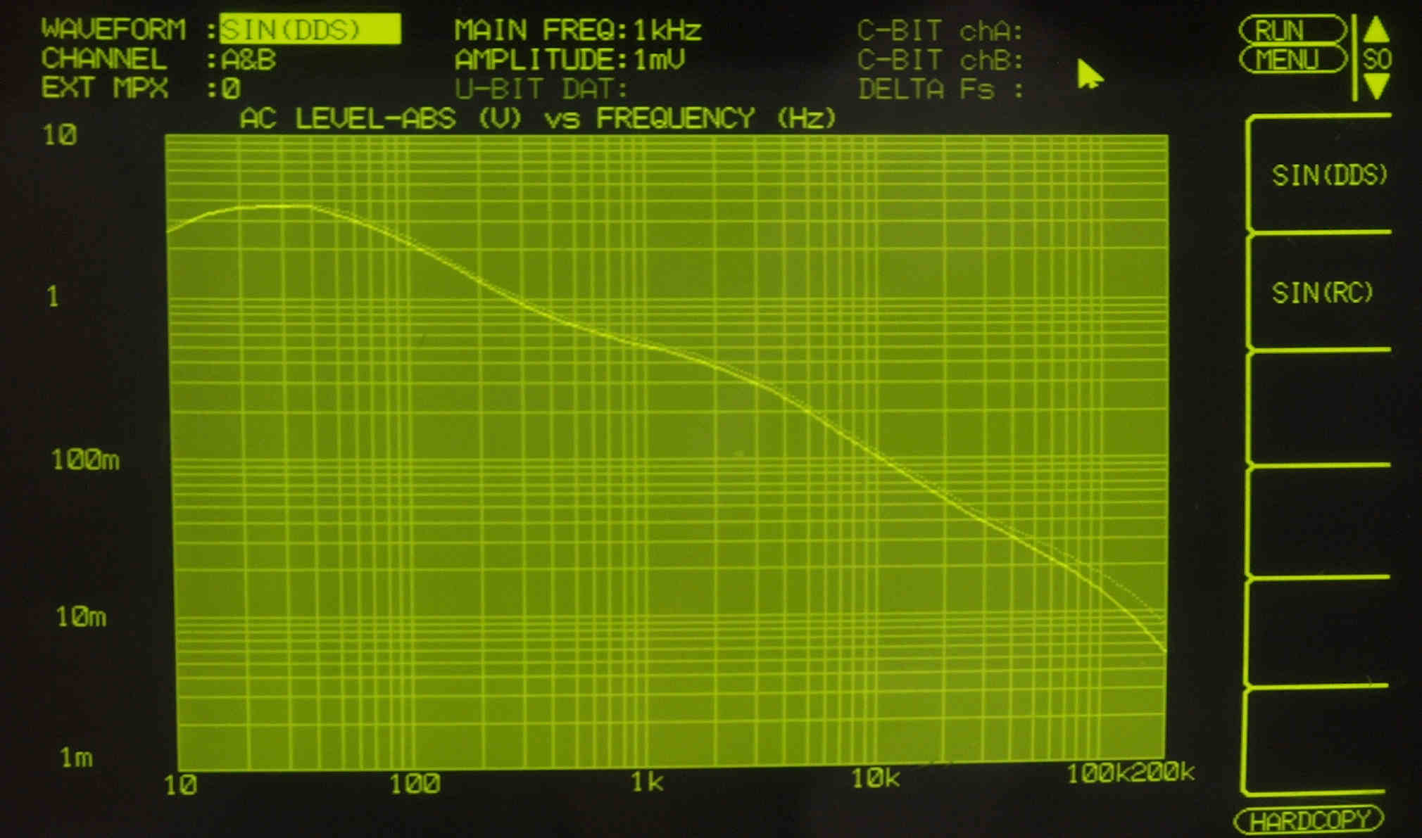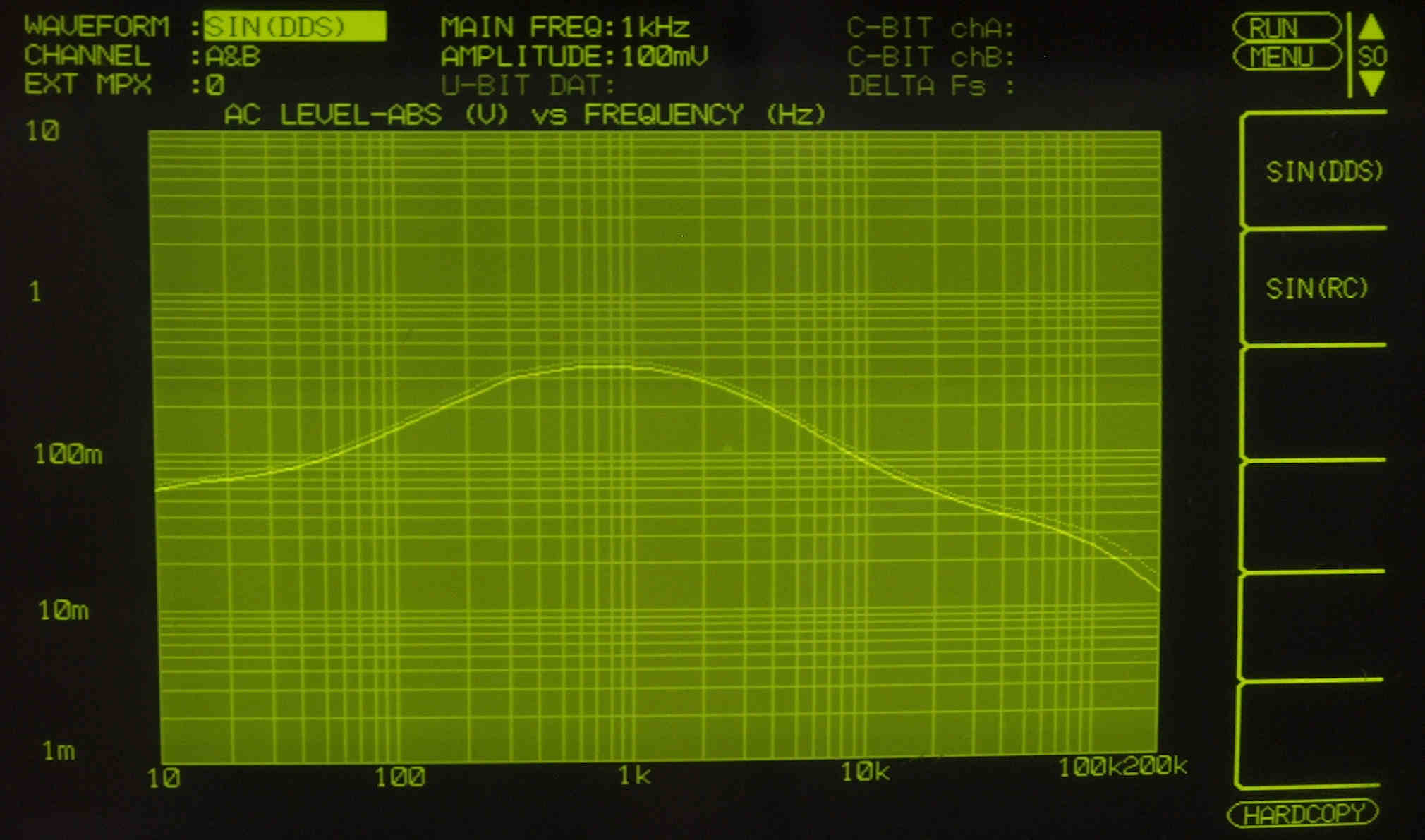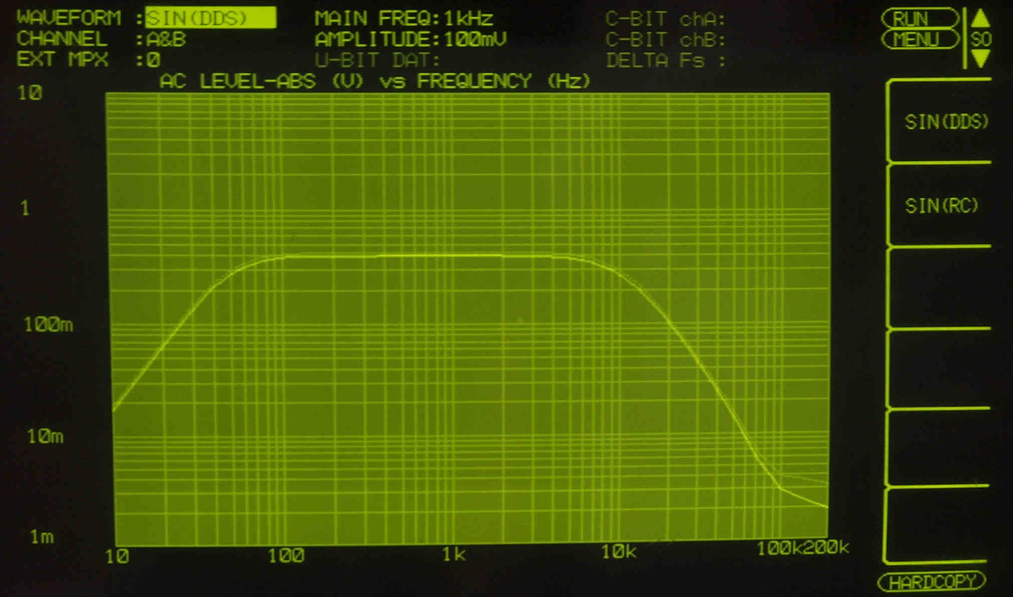 | T33. R側出力電圧=1V、 3.5%歪み。 MM、500Hz入力。 オシロの左カーソル=5KHZ、 右カーソル=20KHZ。 L側出力電圧=1V、 16%歪み。 MM、500Hz入力。 オシロの左カーソル=5KHZ、 右カーソル=20KHZ。 |