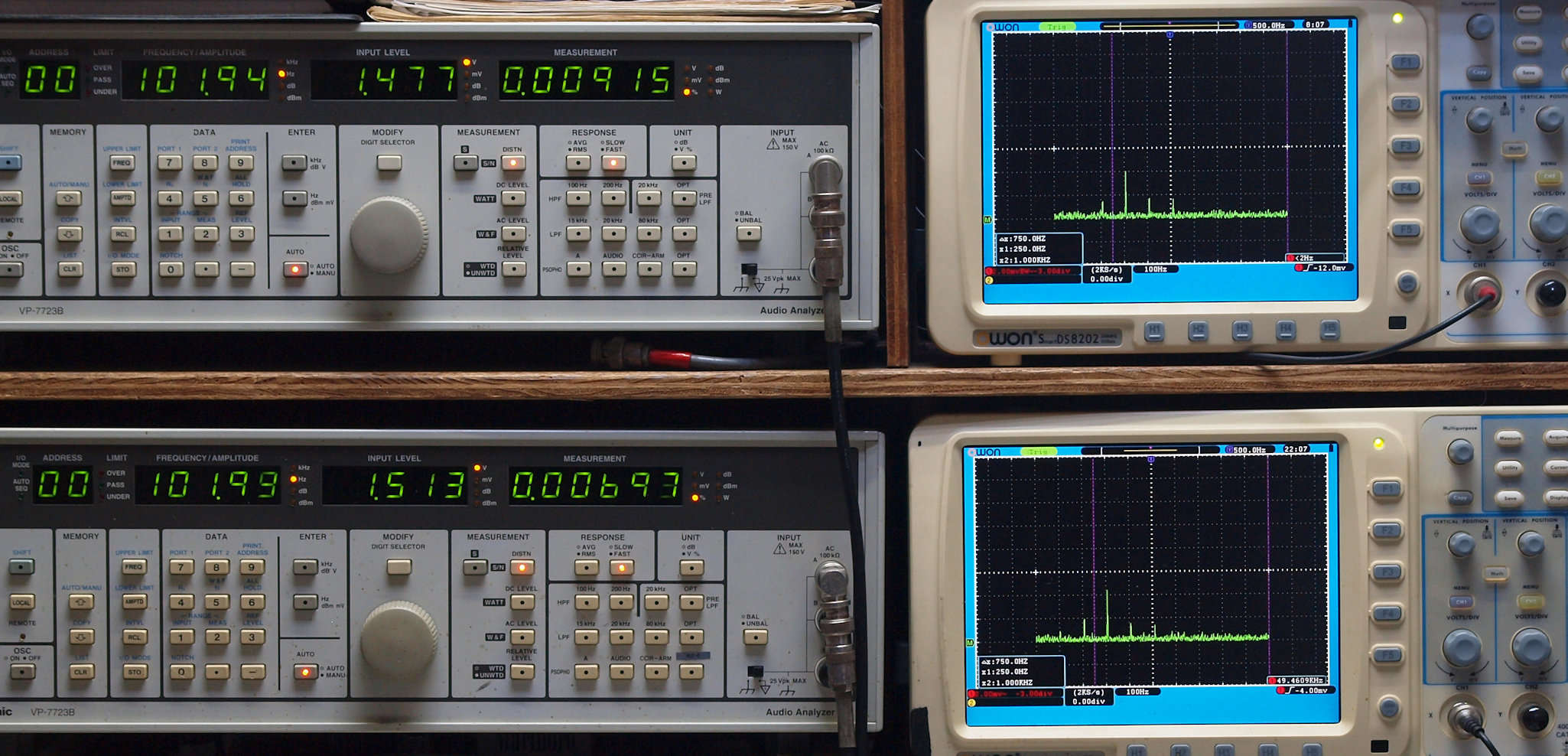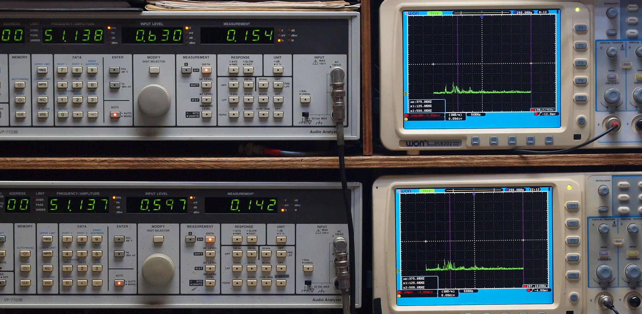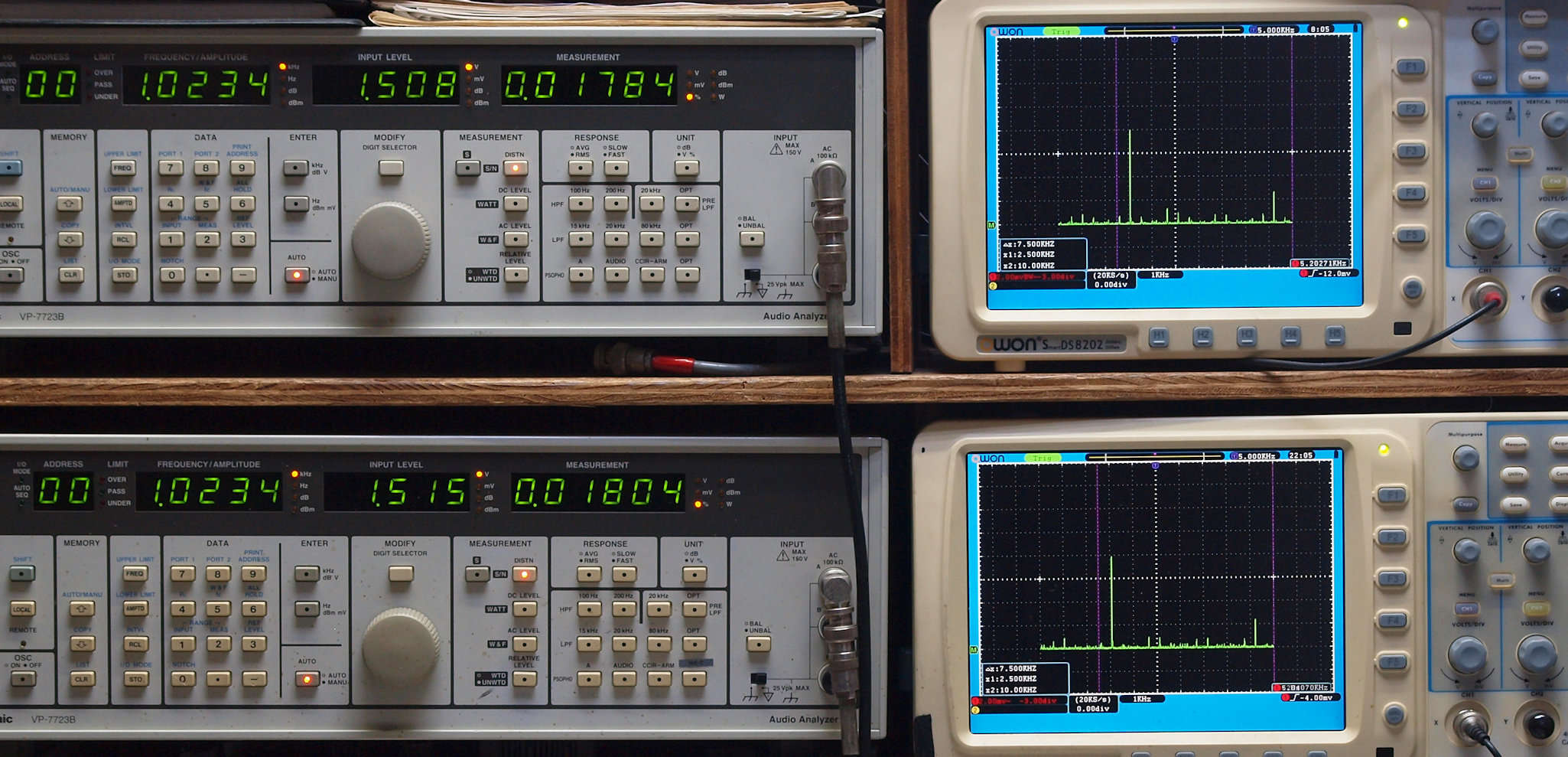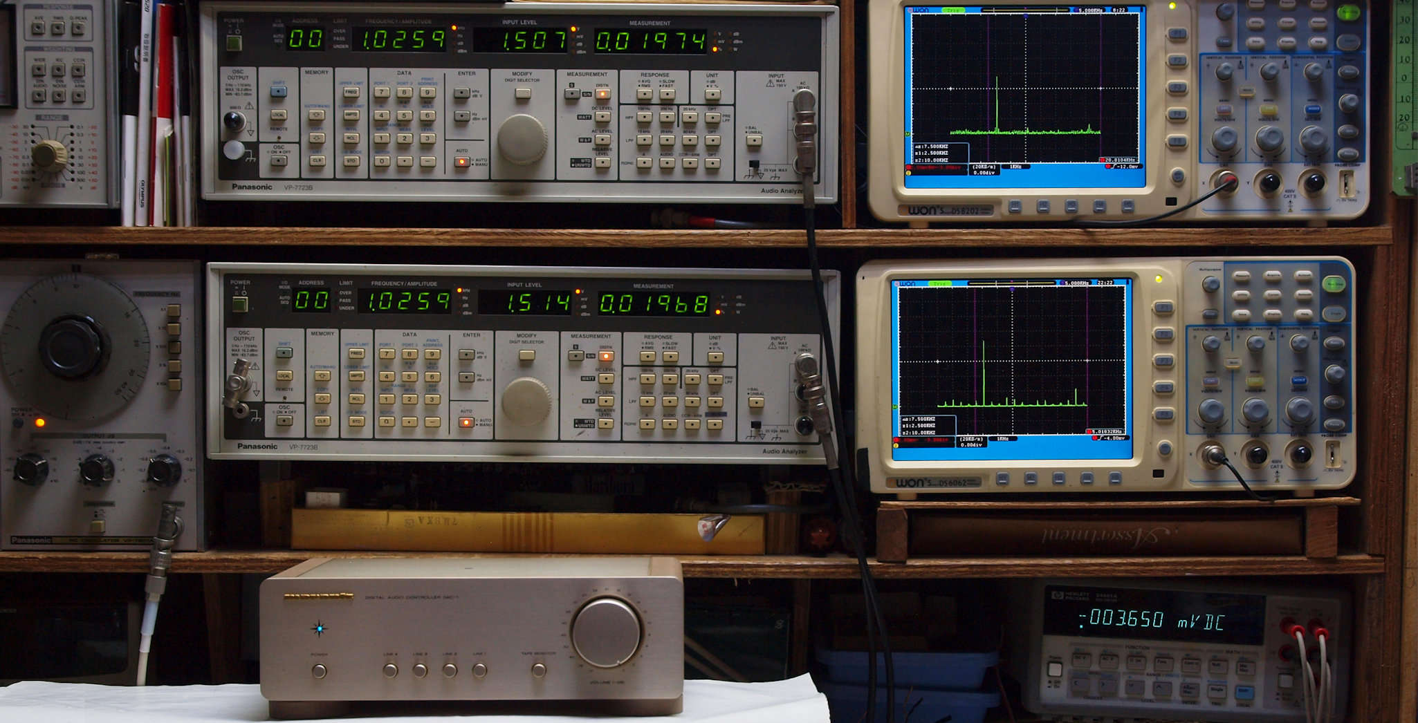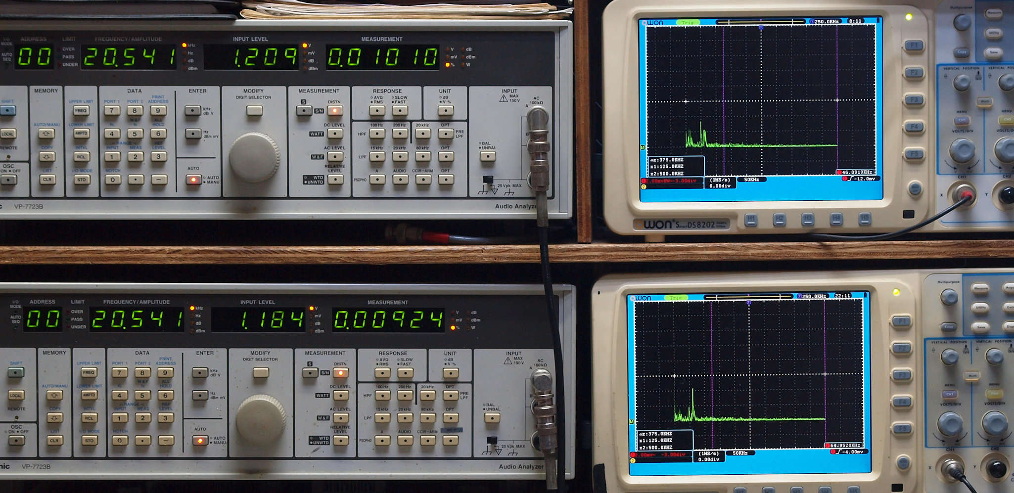 | E. 調整・測定。 画像をクリックすると、大きく(横幅2050ドット)表示されます。 E0. 出力・歪み率測定・調整。 「見方」。 上段中 右側出力を「Audio Analyzer Panasonic VP−7723B」により測定。 表示LED、 左端=メモリーNo、 中左=周波数測定、 中右=出力電圧測定、 右端=歪み率測定。 上段右端 VP−7723Bの基本波除去出力を「owon SDS8202(200MHZ)」で「FFT分析」表示。 下段中 左側出力を「Audio Analyzer Panasonic VP−7723B」により測定。 表示LED、 左端=メモリーNo、 中左=周波数測定、 中右=出力電圧測定、 右端=歪み率測定。 下段右端 VP−7723Bの基本波除去出力を「owon SDS6062(200MHZ)」で「FFT分析」表示。 下段左端 オーディオ発振器 VP−7201A より50Hz〜100kHzの信号を出し(歪み率=約0.003%)、ATT+分配器を通し、AMPに入力。 よって、ダイアル設定出力レベルより低くなります。測定機器の仕様や整備の様子はこちら、「VP−7723B」「VP−7201A」。 FFT画面の見方はこちら。 |
